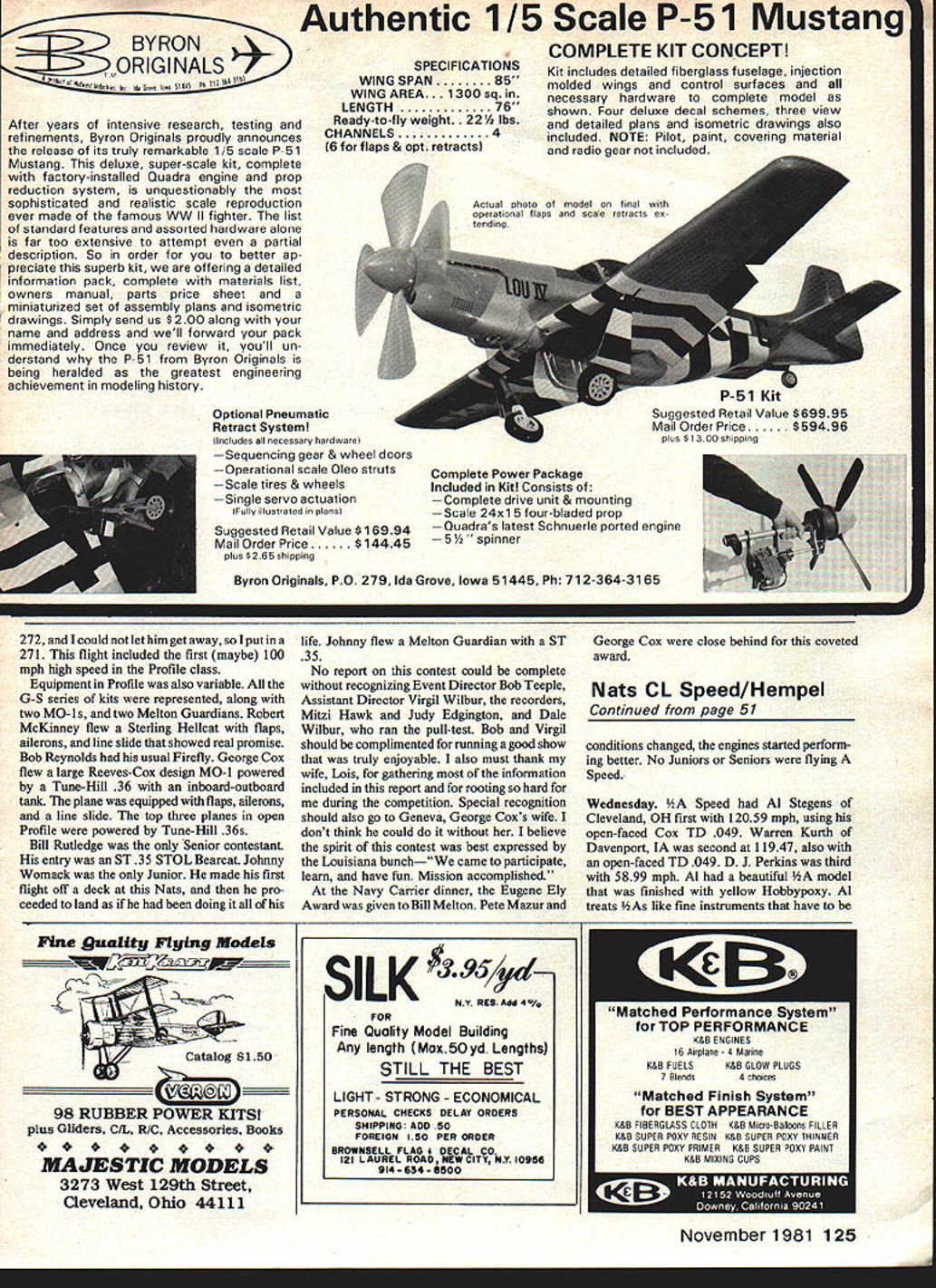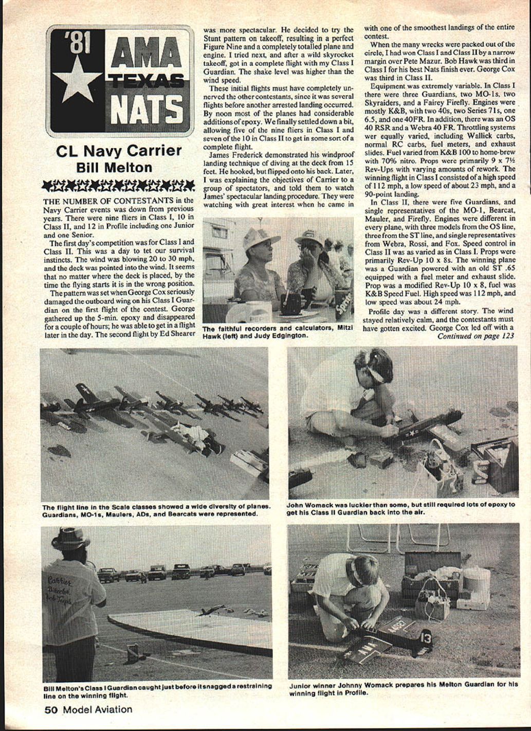 THE NUMBER OF CONTESTANTS Navy Carrier events down previous years nine fliers Class 1 10 Class II 12 Profile including Junior Senior first days competition Class Class II day tet survival instincts wind blowing 20 30 mph deck pointed wind seems no matter deck placed time flying starts wrong position pattern set George Cox seriously damaged outboard wing Class Guar dian first flight contest George gathered up 5-mm epoxy disappeared couple hours able get flight later day second flight Ed Shearer spectacular decided try Stunt pattern takeoff resulting perfect Figure Nine completely totalled plane engine tried next after wild skyrocket takeoff got complete flight Class Guardian shake level higher wind speed initial flights must have completely un nerved other contestants since several flights before another arrested landing occurred noon planes considerable additions epoxy finally settled down bit allowing five nine fliers Class seven 10 Class II get some sort complete flight James Frederick demonstrated windproof landing technique diving deck 15 feet hooked flipped onto back Later explaining objectives Carrier group spectators told watch James spectacular landing procedure watching great interest came smoothest landings entire contest wrecks packed out circle won Class land Class LI narrow margin over Pete Mazur Bob Hawk third Class best Nats finish ever George Cox third Class II Equipment extremely variable Class three Guardians two MO-is two Skyraiders Fairey Firefly Engines mostly K&B two 40s two Series 71 s 65 4OFR addition anOS 40 RSR Webra 40 FR Throttling systems wer equally varied including Wallick carbs normal RC carbs fuel meters exhaust slides Fuel varied K&B 100 home-brew 70% nitro Props primarily 9 x 7 Rev-Ups varying amounts rework winning flight Class consisted high speed 112 mph alow speed about 23 mph 90-point landing Class II five Guardians singie representatives MO-i Bearcat Mauler Firefly Engines different plane three models OS line three ST line singie representatives Webra Rossi Fox Speed control Class II varied Class Props primarily Rev-Up 10 x 8s winning plane Guardian powered old ST 65 equipped fuel meter exhaust slide Prop modified Rev-Up 10 x 8 fuel K&B Speed Fuel High speed 112mph low speed about 24 mph Profile day different story wind stayed relatively calm contestants must have gotten excited George Cox led off Continued page 123 50 Model Aviation CL Navy Carrier Bill Melton faithful recorders calculators Hawk left Judy Edginaton 1fl9 TII9fli un in ocale classes showed wide diversity planes Guardians MOls Maulers ADs Bearcats represented John Womack luckier some still required lots epoxy get Class II Guardian back air wn meiows Class Guardian caught just before itsnagged restraining line winning flight Junior winner Joflnny womacK prepares nis Meiton Guardian winning flight Profile POWER TO START ALMOST ANYTHING N may look like world-fa mous Sullivan Starter its actual ly new Sullivan Super Starter. tons power reserve Hook up 12-Volt battery itll start engine Incredible power same starter can used powersuppliesup 24-Volts tostart balkyenginesand -scale monsters I I I I I I I I I I I I IJ-2 GRAB HOLD Sullivan Insta-Just Plastic Con troline Handles feel good hand can adjusted quick easy IJ-2 especially suitable /2-A will fit sizes Grab hold shake hands clouds I I I I I I I I I I I Only $249 TANKS NEVER BETTER K NEVER-R-LEAK fuel tanks never like before r better Now provide FULL TANK SYSTEM boost flight time can fill tank top bubble allows enough room air tubing fitting neatly inside bubble Heres good news up-graded tanks tanks except smaller 4 oz include Kiapper-Klunk stiff-arm klunk kiunk pick-ups se own system saved adisqualificationby reminding fliers leave circle helmet clear ing lines before taking up second model seemed better stop infraction rather let disqualify penalize matches lots fun watch Jed waving white-green-red flags blowing whistle dodging falling airplanes competence level FM fliers much greater couple years ago quite few tactical errors seems lot pit crews would rather watch match start engine second model after first hits groundexcept second engine becomes balky doesnt start cue flying site rather hard made some interesting pitting patching efforts Outstanding performer Cartier Tantrum Nelson 15 used J E Albritton Team Race guys flying Combat giggles struck terror heart ferocious power Nelson Tantrum fairly large foam model usually weighing around 15-16 oz looked like feather way yanked around sky muchrumored Tigre X-l 5 didnt make appearance far could tell didnt stick around long enough Thursday see Pete Jaden win YzA Combat flying moonlight Rich Lopez reported Pete really hot nobody could him Cox really came through engines goodies through fifth place sportsmanship level quite high year best example being Tom Fluker Unfor tunately few people throwing down handles disgust particular bozo crashed two airplanes different events purpose bright spot future Combat younsters flying Junior Senior levels Some Open fliers now have kids flying see lot same last names raking gold Keep up good work provided annadillo doesnt eat airplanes youll Open National Champions day Nats CL Carrier/Melton Continued page 50 tiameout Pete Mazur few problems got fairly good 255 flight things started happening George Cox proceeded break national record picture-perfect flight 291 low speed flight thing beauty plane seldom varying foot elevation entire distance around circle timed individual laps about 33 seconds Just add suspense George ran out fuel just passed over rear deck landing approach flight must have inspired Pete Mazur pro ceeded put up personal bests Pete Continued page 125 November1981 123 Wtt7~-A9BObbY B0 fl .habtS D TIMER KITS Full Partial Kits P & W Semi-Kits--Rib Tip Former Kits 1941 Playboy Jr 54 span Plan Extra $1450 Plan--$2 50 Companion Stripwood Kit--$13 12 Combination Playboy Jr above itema$28 00 1941 Playboy Sr 89 Span Plan Extra $1921 Plan--$3 00