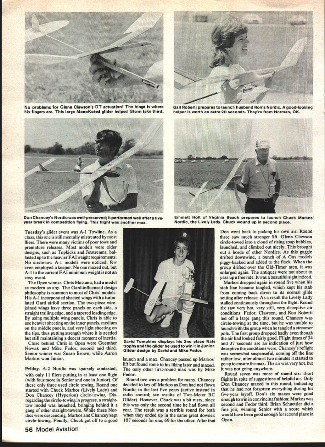 thermal assist threat downersjust straight model performance fly later thermally part day Both approaches enjoyable watch early flights visual poetrygentle climbs long prop run getting very high going graceful ever-so-slow open glide circles Very graceful very beautiful other hand Coupes launched afternoon boomers really went up high fast Very impressive However well-centered thermal Coupes would back ground embarassingly short max Which better strategy day would seem easier put up five consistent flights under consistent conditions pick five straight thermals conclusion based upon fact top three Coupers early bird school Bob White won six maxes plus Bobs Beau Coupe model honored evening Model Year NFFSs annual sym posium Chuck Markos maxed out barely mis sing sixth max graceful flying modi fied Garricoupe Fred Pearce third four three-quarters maxes Fred Pearce should pointed out earlier morning won Korda Unlimited Rubber Event Korda unofficial event sponsored McDonnell-Douglas Free Flight Club St Louis object determine rubber model can fly longest single flight calm early morning 7 am conditions Fred Houston accustomed very high humidity area attributes much success allowing tissue covering sag damp flight 9 mm 24 sec significantly next two places Bob White 645 Jim Quinn 630 Note Bob Jim both California normally fly much drier conditions perhaps non-sag tissue margin victory rate high humidity bane several others Larry Sargents model got wrinkly soon took car fuselage bending precariously wound George Perrymans model suffered anevenworse fate fuselage folding shortly after being wound Bob Whites first model also blew up during winding due high humidity P-30 now official Nats event flown penultimate day rubber Maxes threeminute variety achievable Bob White able max Out Bob went score Continued page 129 FF Glider Jerry Barnette THE FIRST ORDER business HandLaunched Glider flown Monday amid num erous fairly small thermals Interest event very high since Tulsa Glue Dobbers Trophy National HLG Team Challenge also stake Tulsa Glue Dobbers Trophy perpetual Nats trophy has won twice same person least four former winners competition trying first twotime winner Jim Lueken trophy winner 1977 USFFC HLG champ year three buddies drove up San Diego 23 hours just fly Hand-Launch Glider conduct event no different HLG contestswait watch wait try piggy-back someone general opinion start would probably bunch people maxing out However small thermals tricky proving once again piggy-backing exact science Three people did max out Robert Dunham Open Craig Dunlop Senior Bryan Fulmer Junior Bryan aware won first place Junior left field day putting up fourth flyoff flight As turned out Bryan unaware Tulsa Glue Dobbers Trophy missed good opportunity put big guys Neither other flyoff flights maxed Dunlops flight winning out over Dunhams trophy victory Craig used rearfinned Canadian design Stan Stoy winner Glue Dobbers Trophy last year finished second Open Mary Jenkins runner-up Dunlop Senior event National HLG Team Challenge close battle Competition among threemember teams California Florida Illinois Oklahoma Texas end Californias Jim Lueken Larry Sargent Tim Batiuk bested Oklahoma team Robert Dunham Max Burgess Bill Baker scant three seconds 791 788 November 1981 55 Walter iozelle keeps weather eye cocked thermals George Perryman stands light DT fuse Walts Mulvihill Wales Thomas flew Mini Twin Fin P-30 Holding fixture also reads out torque during winding meter front box form champion Craig Dunlopof Greens burg PA won Senior HLG Tulsa Glue Dobbers Trophy high time Thermals small three maxed out Tuesdays glider event A-i Towline As class still mentally mistreated fliers victims poor tows premature releases Most models older designs such Topkicks Jetstreams bal lasted up heavier FAI weight requirements No circle-tow A-i models noticed few employed keeper No maxed out A-i current FAI minimum weight easy event Open winner Chris Maisuno model modern Gard-influenced design philosophy common Chris models A-i incorporated sheeted wings turbu lated Gard airfoil section two-piece wirejoined wings have three panels side straight trailing edge tapered leading edge using multiple wing panels Chris able use heavier sheeting inner panels medium middle panels very light sheeting tips thus putting strength needed still maintaining decent moment inertia Close behind Chris Open Guenther Nowak Mike Fedor second third Senior winner Susan Brown Aaron Markos won Junior Friday A-2 Nordic sparsely contested 11 fliers putting least flight four Senior Junior three used circle towing Round started Chuck Markos Lively Lady Don Chancey Hyperion circle-towing Dis regarding circle-towing progress straighttow model launched bringing behind gang other straight-towers Nor dics descending Markos Chancey kept circle-towing Finally Chuck got off good launch max Chancey passed up Markos lift found some liking later maxed other first-round max Mike Fedor Round two problem Chancey decided key off Markos Don flown Nordic last five years active instead radio control see results Two-Meter RC Glider However Chuck bit rusty since second time flown year result terrible round both ended up same great downer 107 seconds 69 other After Don went back picking own air Round three saw much stronger lift Glenn Clawson circle-towed cloud rising soap bubbles launched climbed out nicely brought out horde other Nordics As gaggle drifted downwind bunch Gas models piggy-backed added flock group drifted over Old-Timer area enlarged again antiques about pass up free ride beautiful sight indeed Markos dropped again round five stab line became tangled kept stab coming back down its normal glide setting after release As result Lively Lady stalled continuously throughout flight Round six saw very hot very still very deceptive air conditions Fedor Clawson Ron Roberti led off large gang round Chancey circle-towing time unable launch group tangled streamer pole first group dropped badl