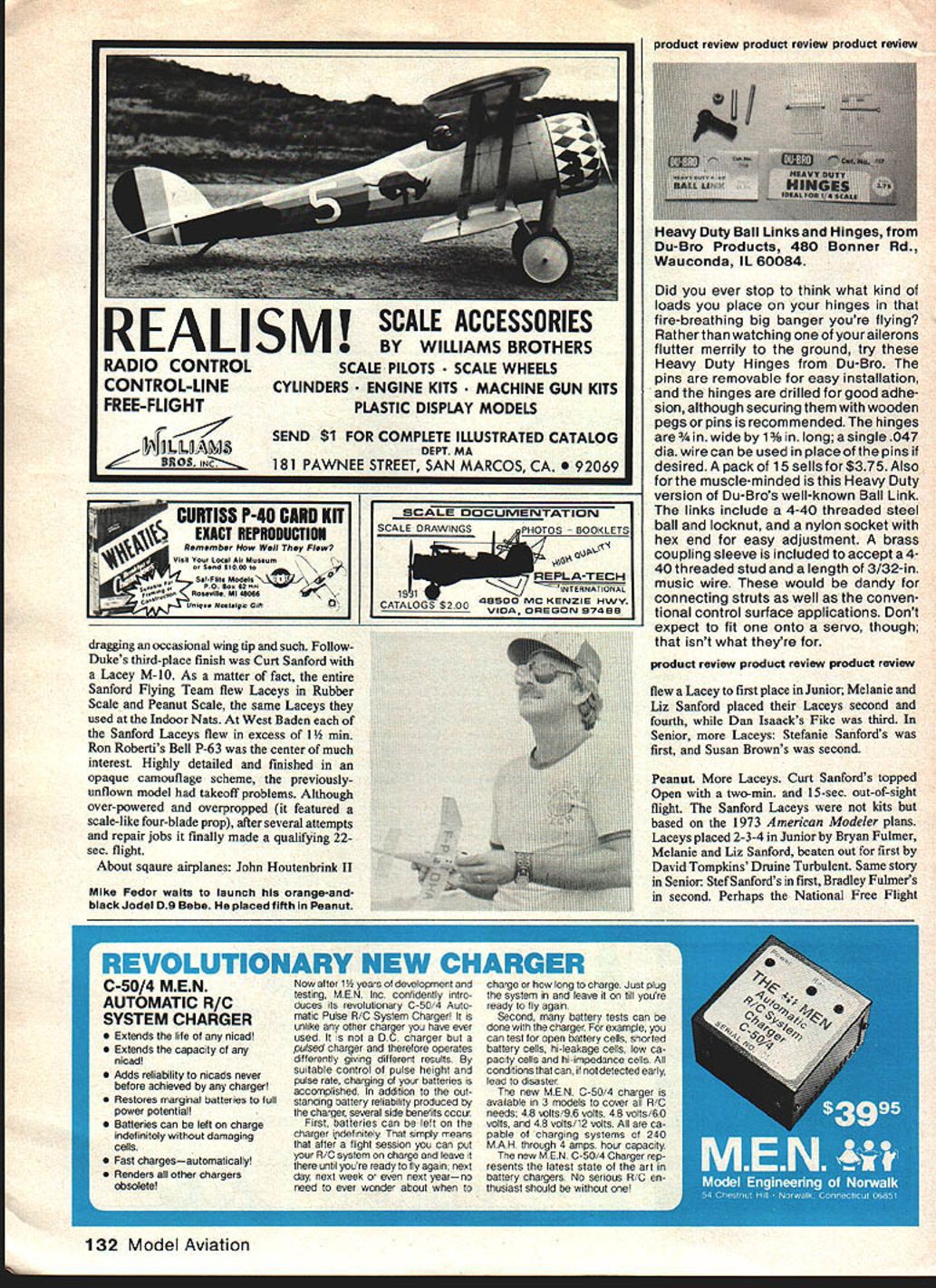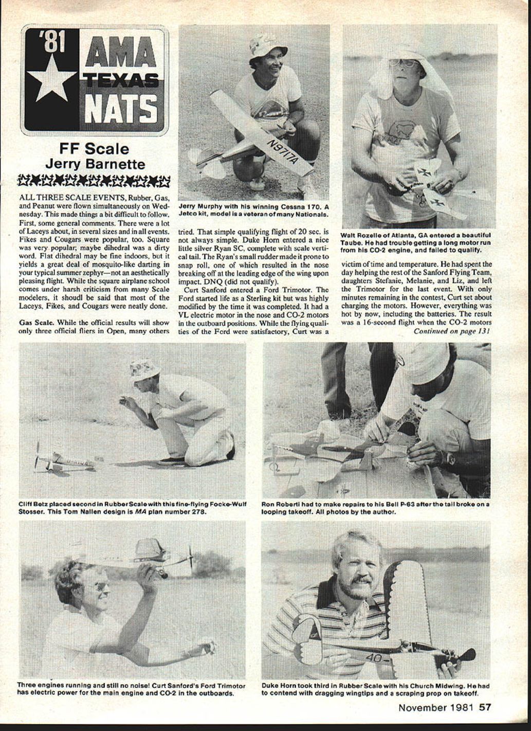ALL THREE SCALE EVENTS Rubber Gas Peanut flown simultaneously Wed nesday made things bit difficult follow First some general comments lot Laceys about several sizes eventstried simple qualifying flight 20 sect isWalt Hozelle Atlanta red beautiful Fikes Cougars popular too Squarenot always simple Duke Horn entered niceTaube trouble getting long motor run very popular maybe dihedral dirtylittle silver Ryan SC complete scale verti-from CO-2 engine failed qualify word Flat dihedral may fine indoors itcal tail Ryans small rudder made prone yields great deal mosquito-like darting insnap roll resulted nose typical summer zephyrnot aestheticallybreaking off leading edge wing upon pleasing flight square airplane schoolimpact DNQ did qualify comes under harsh criticism Scale Curt Sanford entered Ford Trimotor modelers shoudl said theFord started life Sterling kit highly Laceys Fikes Cougars neatly donemodified time completed VL electric motor nose CO-2 motors outboard positions flying quali ties Ford satisfactory Curt Gas Scale official results will show three official fliers Open others November1981 57 victim time temperature spent day helping rest Sanford Flying Team daughters Stefanie Melanie Liz left Trimotor last event minutes remaining contest Curt set about charging motors However evei-ything hot now including batteries result 16-second flight CO-2 motors Continued page 131 jerry murpny witn nis winning Cessna 170 Jetco kit model isa veteran Nationals Clitt Betz placed seCond Hubbercale witn tflistine-tiying 1-ocke-Wult Stosser Tom Nallen design MA plan number 278 Hon Hobefli nad make repairs ma eii r-s artertne taii D0K6 looping takeoff photos author nree engines running still no noise Curt Sanfords Ford Trimotor has electric power main engine CO-2 outboards Duke Horn took third Rubber Scale Church Midwing contend dragging wingtips scraping prop takeoff FIihtIine Shirts Expand quite dont shrink 2% weve added gProp Wash books towels new shirt designs line One-Liners nicest qua ty heajwe ght footba Plane Shirts Colorful planes backed Plain Plane ShIrts Colorful planes Prep Wash shirt zi hiue whte topsttchng OP has h ha h nrv Mans Ml $725 cloud background Mens IM Youve ir pilot falling midshirt Mens sizes II $725 Womens WI $825 Kids Klooking SIOSOthis years Weve found put handy aerosol can Cleans away oil unbumt fuel Actual polishes plane Order pj$395 $250 Send SASE brochure ADD 10% FOR POSTAGE AND HANDUNG turning 60072 miles per hour Banana Bullet Unlimited ROG Rubber Biplane having great spectator interest won George Perryman tandem-wing design having distinct dragonfly look Helicopter 7-11 Rubber Distance also won George Perryman Nats FF Scale/Barnette Continued page 57 unable sustain flight after electric motor stopped DNQ Walt Rozelle flew beautiful Taube encountered icing short run problems CO-2 motor DNQ Perhaps graceful longest flights turned blue Rearwin Speedster Donald Tomeswhich placed third event won Jerry Murphy Cessna 170 Murphys Cessna well-tested veteran having competed since early 70s year old Cessna won Murphy unfortun ately crashed rather badly its last flight Runner-up Pat Ciambrello flying CO-2 powered Baby Ace neatly turned out Mechanix Illustrated markings Another CO-2-powered Baby Ace second place flown Liz Sanford Junior Finishing ahead Liz first place sister Melanie Sanford flying CO-2-powered Lacey M-i0 Melanies Lacey 15-in wingspan 15% enlargement Peanut version Older sister Stefanie Sanford took first place Senior CO-2-Powered Piper Super Cruiser Rubber Scale always pleasure watch years crop models disappoint ing Mike Midkiffs Open entry Curtiss 503C-2 realistic weathered battered finish Good detail work combined long elegant flights put Mikes Curtiss first place Another model possessed both excellent scale detail flying qualities Focke-WuIf FW-56 Stosser built Model Aviation plans Clifton Betz Cliff used alumi num powder clear dope obtain realistic silver finish Stosser Focke-Wulfs flights aided mild thermal help very mce Duke Horn nice-looking Church Midwing built Thomas Classic Models kit some neat Hungerford wire wheels ROGs light afternoon breezes worrisome November1981 131 squadron/Signal Books *j after above listed planes indicates Action series books $495 Biqa shirt matching book deduct Sf 00 theorder AA. es listed brochure DffiG SPEOAL Cylng TowelsMane cnecns uory Juvs pcynuc Great buddyAddress lands little rough-7 Flightllne Shirts Etc now dont we1781 Johnmark Circle Grants Pass OR 97526 Comes snapMens Sizes S 32-36 M 38-40 L 42-44 X 461 ringLadles Sizes S 8-jO M l2-t4 L 16-18 X 20-22 Order CTlOds Sizes 5 6-8 M 10-l2I L 14-16 X 18 cityStateZip size MO WO KO Order No TotalS Visa/Master charge accepted account numser copiration date signature AT LAST Hard Break Fibre-Filled Prop Size 10/6 Mail Order Specials List Price $125 ea 6for 595 l2for 1100 50 4200 Postage paidClub Discounts Availt Send check money order ACCU- FLITE liii PLUM ORCROWNSVILLE MD 21032 13UC 1D THE NEW FIREBALL GLOW PLUGS ARE LEAKPROOF AND BLOWOUT PROOF EVEN FOR THE NEW MONSTER ENGINES BUT THEY ARE STILL THE OLD PRICE OF$1 10 WRITE NOWI/ SWANSON PO Box 151 Wayne NJ 07470 CARD KITSCALE DOCUMENTATION Well FlewF7~ii21 EXACT UEPRGDIICTIONSCALE DRAWINGSPHOTOS LETS Volt Museum o Send SO 0110 j\I1EPLA TECH oOP0 SO 621 oAnee e M oss1931~NTERNATONA SFit Mode NA~ Unq eNosgoGftCATALOGS $200 49900 MC KENZ 8 HWY VIDA OREGON 97488 dragging occasional wing tip such FollowDukes third-place finish Curt Sanford Lacey M-1O As matter fact entire Sanford Flying Team flew Laceys Rubber Scale Peanut Scale same Laceys used Indoor Nats West Baden Sanford Laceys flew excess 1 mm Ron Robertis Bell P-63 center much interest Highly detailed finished opaque camouflage scheme previously unflown model takeoff problems Although over-powered overpropped featured scale-like four-blade prop after several attempts repair jobs finally made qualifying 22sec flight About sqaure airplanes John Houtenbrink II 132 Model Aviation 