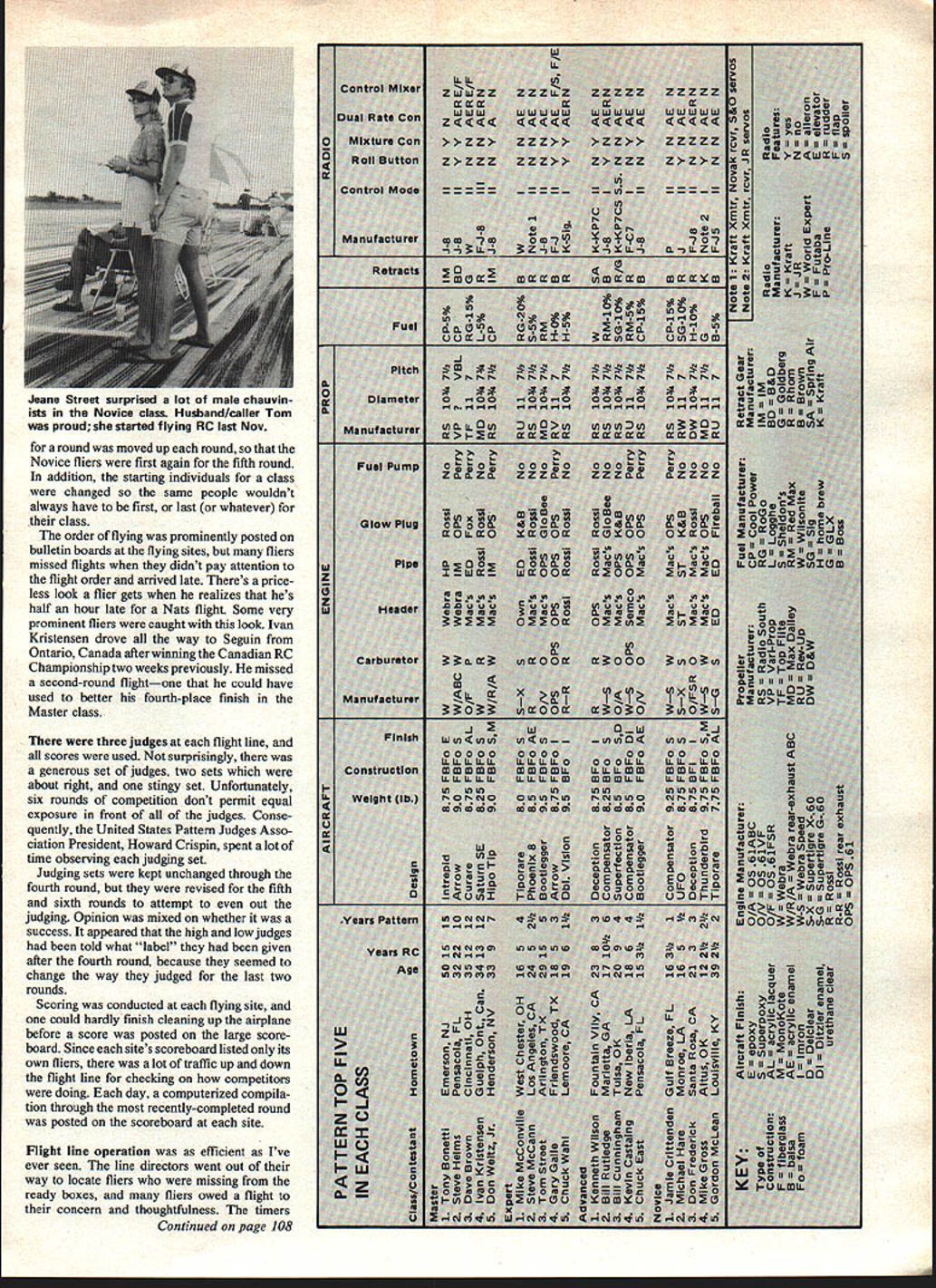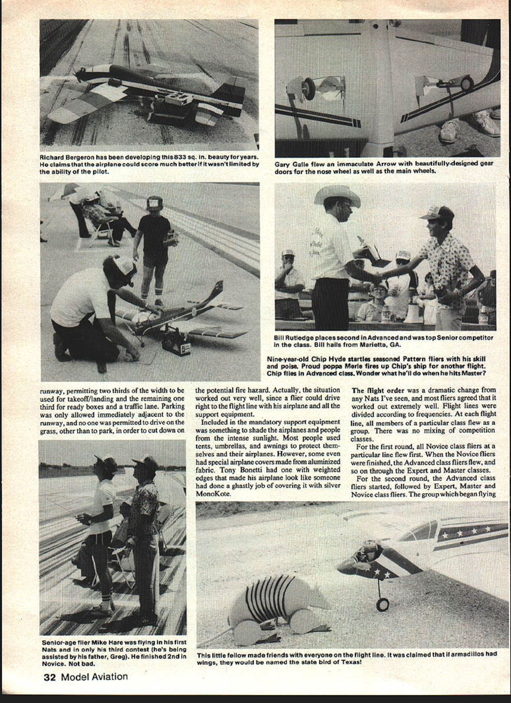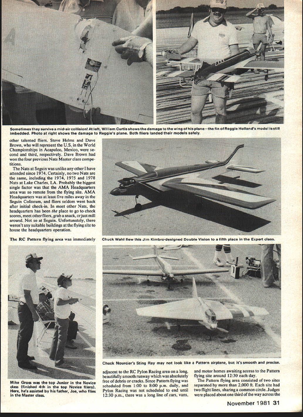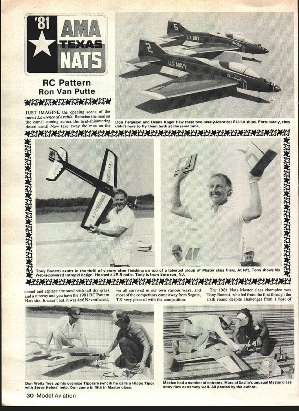JUST IMAGINE opening scene movie Lawrence ofArabia Remeber man camel coming across heat shimmering Don Ferguson Deank Koger flew two nearly-identical EU lA ships Fortunately desert sand9 Now take away man didnt have fly both same time *4*4 **4 *4 *4 *4*4 *4 *4 *4*4 ony onerti exuiss thrill victory after finishing top talented group Master class fliers left Tony shows Webra-powered Intrepid design I-Ia used JR-8 radio Tony Emerson NJ*4 camel replace sand tall dry grass survived own various ways 1981 Nats Master class champion runway have 1981 RC Pattern competitors came away Seguin Tony Bonetti led first through Nats site wasnt hot hot Nevertheless TX very pleased competition sixth round despite challenges host Don Weitz fires up oversize Tiporare whcih calls Hippo Tipo Steve Helms help Don came fifth Master class 30 Model Aviation Mexico number entrants ircial Davilas unusual Masterciass entry flew extremely well photos author Sometimes survive mid-air collision left William Curtis shows damage wing planethe f Reggie Hollands model still imbedded Photo right shows damage Reggies plane Both fliers landed models safely other talented fliers Steve Helms Dave Brown will represent US World Championships Acapulco Mexico se cond third respectively Dave Brown won four previous Nats Master class compe titions Nats Seguin unlike other have attended since 1974 Certainly no two Nats same including 1974 1975 1978 Nats Lake Charles LA Probably biggest single factor AMA Headquarters area remote flying site AMA Headquarters least five miles away Seguin Coliseum fliers seldom went back after initial check-in other Nats headquarters has place go check scores meet other fliers grab snack oriust mill around Seguin Unfortunately werent suitable buildings flying site house headquarters operation RC Pattern flying area immediately adjacent RC Pylon Racing area long motor homes awaiting access Pattern beautifully smooth runway absolutely flying site around 1230 day free debris cracks Since Pattern flying Pattern flying area consisted two sites scheduled 100 800 pm daily separated 2000 ft site Pylon Racing scheduled end until two flight lines sharing common circle Judges 1230 pm long line cars vans placed about third way across November1981 31 Chuck Wahi flew Jim Kimbro-designed Double Vision fifth place Expert class Mike Gross top Junior Novice class finished 4th top Novice fliers hes assisted father Joe flies Master class Chuck Nourciers Sting Ray may look like Pattern airplane its smooth precise Hichard uergeron nas ceen aeveioping mis o sq oeautyforyears Heclaimsthattheairplanecouldscoremuchbetterifitwasntlimited[v32][b134976216276640]]uary uane new immaculate Arrow beautifully-designed gear ability pilotdoors nose wheal well main wheels Nine-year-old Chip Hyde startles seasoned Pattern fliers skill poise Proud poppa Merle fires up Chips ship another flight Chip flies Advanced class Wonder what hell hits Master runway permitting two thirds width used takeoff/landing remaining third ready boxes traffic lane Parking allowed immediately adjacent runway no permitted drive grass other park order cut down Senior-age flier Mike Hare flying first Nats third contest hes being assisted father Greg finished 2nd Novice bad potential fire hazard Actually situation worked out very well since flier could drive right flight line airplane support equipment Included mandatory support equipment something shade airplanes people intense sunlight Most people used tents umbrellas awnings protect selves airplanes However some special airplane covers made aluminized fabric Tony Bonetti weighted edges made airplane look like someone done ghastly job covering silver MonoKote flight order dramatic change Nats Ive seen fliers agreed worked out extremely well Flight lines divided according frequencies flight line members particular class flew group no mixing competition classes first round Novice class fliers particular line flew first Novice fliers finished Advanced class fliers flew through Expert Master classes second round Advanced class fliers started followed Expert Master Novice clazt fliers grout becan fivina little fellow made friends everyone flIght line claimed armadillos wings would named state bird Texas 32 Model Aviation Bill Rutledge places second Advanced top Seniorcompetitor class Bill hails Marietta GA round moved up round Novice fliers first again fifth round addition starting individuals class changed same people wouldnt always have first last whatever class order flying prominently posted bulletin boards flying sites fliers missed flights didnt pay attention flight order arrived late Theres price less look flier gets realizes hes half hour late Nats flight Some very prominent fliers caught look Ivan Kristensen drove way Seguin Ontario Canada after winning Canadian RC Championship two weeks previously missed second-round flightone could have used better fourth-place finish Master class three judges flight line scores used surprisingly generous set judges two sets about right stingy set Unfortunately six rounds competition dont permit equal exposure front of judges Conse quently United States Pattern Judges Asso ciation President Howard Crispin spent lot time observing judging set Judging sets kept unchanged through fourth round revised fifth sixth rounds attempt out judging Opinion mixed whether success appeared high low judges told what label given after fourth round because seemed change way judged last two rounds Scoring conducted flying site could hardly finish cleaning up airplane before score posted large score board Since sites scoreboard listed its own fliers lot traffic up down flight line checking competitors doing day computerized compila tion through recently-completed round posted scoreboard site Flight line operation efficient Ive ever seen line directors went out way locate fliers missing ready boxes fliers owed flight concern thoughtfulness timers Continued page 108 Jeans Street surprised lot male chau