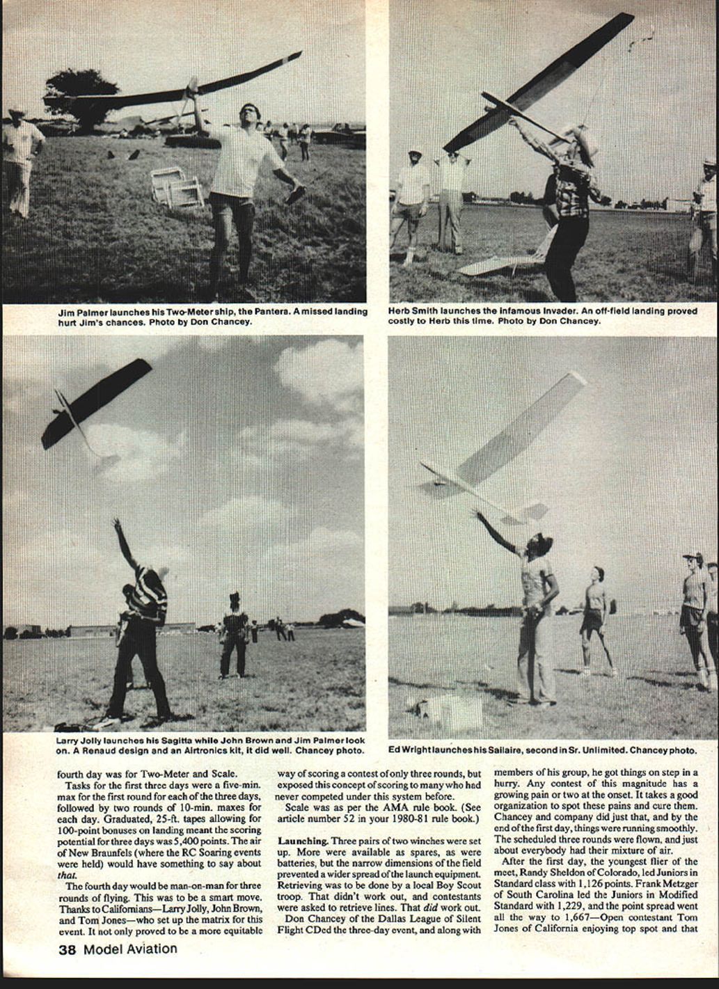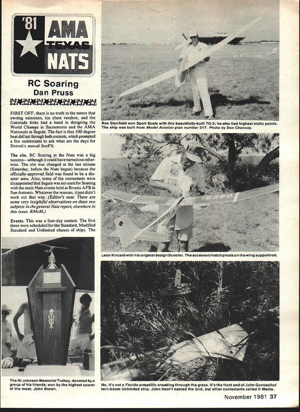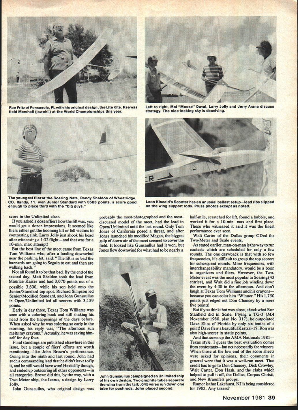 RC Soaring Dan Pruss FIRST OFF no truth rumor awning salesmen ice chest vendors Gatorade folks hand designing World Champs Sacramento AMA Nationals Seguin fact 100-degree heat did last through both contests prompted few contestants ask what days Detroits annual SnoFli site RC Soaring Nats big successalthough could have turned out other wise site changed last minute Saturday before Nats began because officially-approved field found dis aster area Also some contestants disappointed Seguin used Soaring main Nats events held Brooks AFB San Antonio Whatever reasons itjust didnt work out way Editors note some very insightful observations two subjects general Nats report elsewhere issue RMcM Events four-day contest first three scheduled Standard Modified Standard Unlimited classes ships November1981 37 Hon Stanfield won Sport Scale beautifully-built TG-3 also highest static points ship built Model Aviation plan number 317 Photo Don Chancey Leon Kincaid original design Scooter accessory hatch pivots wing support rod Hi Johnson Memorial Trohpy donated group friends won highest scorerNo its Florida armadillo sneaking through grass Its front end John Gunsaullus meet John Browntwin-boom Unlimited ship John hasnt named bird other contestants called Manta Jim ialmer launches Two-Meter ship Pantera missed landingHerb Smith launches infamous Invader An off-field landing proved hurt Jims chances Photo Don Chanceycostly Herb time Photo Don Chancey Ed Wright launches Sailaire second Sr Unlimited Chancey photo fourth day Two-Meter Scale Tasks first three days five-mm max first round three days followed two rounds 10-mm maxes day Graduated 25-ft tapes allowing 100-point bonuses landing meant scoring potential three days 5400 points air New Braunfels RC Soaring events held would have something say about fourth day would man-on-man three rounds flying smart move Thanks CaliforniansLarry Jolly John Brown Tom Joneswho set up matrix event proved equitable way scoring contest three rounds exposed concept scoring never competed under system before Scale per AMA rule book See article number 52 1980-81 rule book Launching Three pairs two winches set up available spares batteries narrow dimensions field prevented wider spread launch equipment Retrieving done local Boy Scout troop didnt work out contestants asked retrieve lines did work out Don Chancey Dallas League Silent Flight CDed three-day event along members group got things step hurry Any contest magnitude has growing pain two onset takes good organization spot pains cure Chancey company did just end first day things running smoothiy scheduled three rounds flown just about everybody mixture air After first day youngest flier meet Randy Sheldon Colorado led Juniors Standard class 1126 points Frank Metzger South Carolina led Juniors Modified Standard 1229 point spread went way 1667Open contestant Tom Jones California enjoying top spot 38 Model Aviation Larry Jolly launches Sagitta John Brown Jim Palmer look Renaud design Airtronics kit did well Chancey photo score Unlimited class asked dozen fliers lift would get dozen impressions seemed like fliers either got booming lift fell victims contrasting sink Larry Jolly just shook head after witnessing 132 flightand 10-mm max attempt best line meet caine Texas Tom Williams after landing downwind near parking lot said lift bad buzzards going Seguin eat walking back found bad end second day Matt Sheldon took lead Maurice Kaiser 3070 points out possible 3600 son held onto Junior/Standard top spot Richard Simpson led Senior/Modified Standard John Gunsaullus Open/Unlimited led scorers 3159 points Early day three Texas Tom Williams seen coloring book still shaking head happenings days before asked coloring early morning reply afternoon sun melts crayons Actually saving him self day four Final standings published elsewhere issue couple fliers efforts worth mentioninglike John Browns performance Going ninth last round John such commanding lead didnt have fly still would have won did fly though ended up outscoring other opponentsin categories Brown did way Two-Me jer ship Icarus design Larry Jolly John Gunsaullus original design probably most-photographed mostdiscussed model meet lead Open/Unlimited until last round Only Tom Jones California posed threat after Jones launched modified Megan biggest gulp down air meet seemed cover field looked like Gunsaullus won Jones flew downwind what nearly half-mile scratched lift found bubble worked 10-mn max first place witnessed said finest performance ever seen Walt Carter Dallas group CDed Two-Meter Scale events As stated earlier man-on-man way run contests scheduled few rounds drawback few frequencies its difficult group top scorers subsequent rounds frequencies interchangeability mandatory would boon organizers fliers However Two Meter event popular Soaring 43 entries Walt did fine job winding down event 430 afternoon dont laugh Texas Tom Williams crayons because can color er 1750 points just edged out Don Chancey mere five points think close check what Ron Stanfield did Scale Flying TG-3 MA November 1980 plan No 317 outpointed Dave Elias Florida six tenths point Dave flew beautiful Kestral- 19 Ron also high-scorer static points sums up AMA Nationals 1981 Texas style guess best evaluation comes contestantsbut necessarily winners low end score sheets asked opinions comments general well-run meet credit has go Don Chancey Dick Crowley Walt Carter Don Hash clubs helped pull off Dallas Corpus Christi New Braunfels groups Rumor Lakehurst NJ being considered 1982 Any takers November1981 39 Rae Fritz Pensacola FLwith original design Lite Kite Rae field Marshall jawohi World Championships year Left right Mel ~MOO5e uuval Larry Jolly Jerry Arana discuss strategy nice-looking sky deceiving youngest riier soaring Nats anay neiaon wneatnage CO Randy 11 won Junior Standard 3586 points score good enough place third big guys Leon Kincaids Scooter has unusual ballast setuplead ribs slipped wing suppor