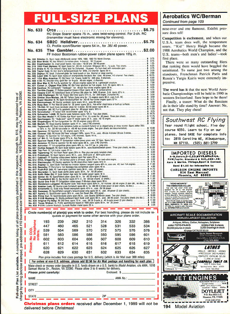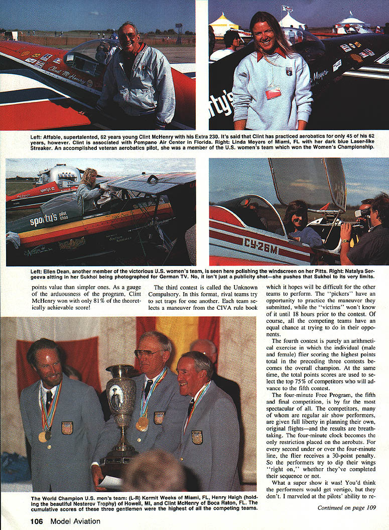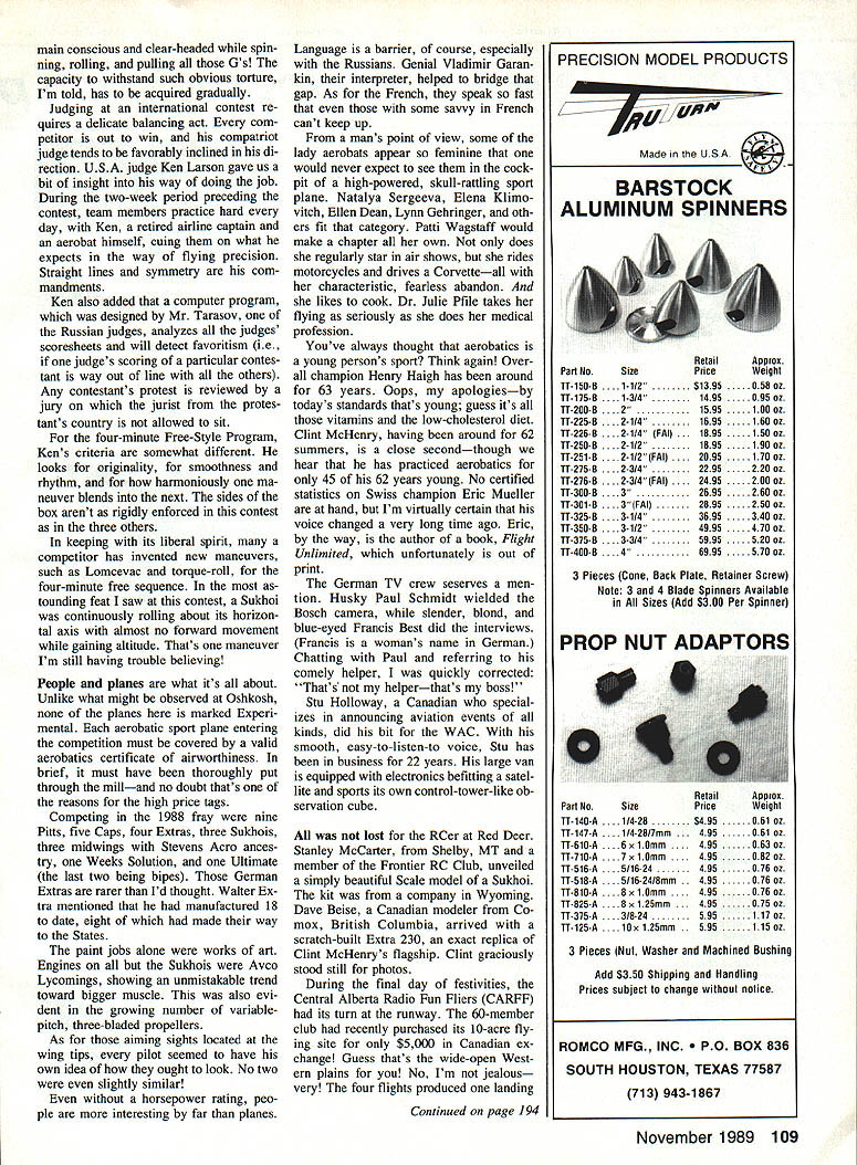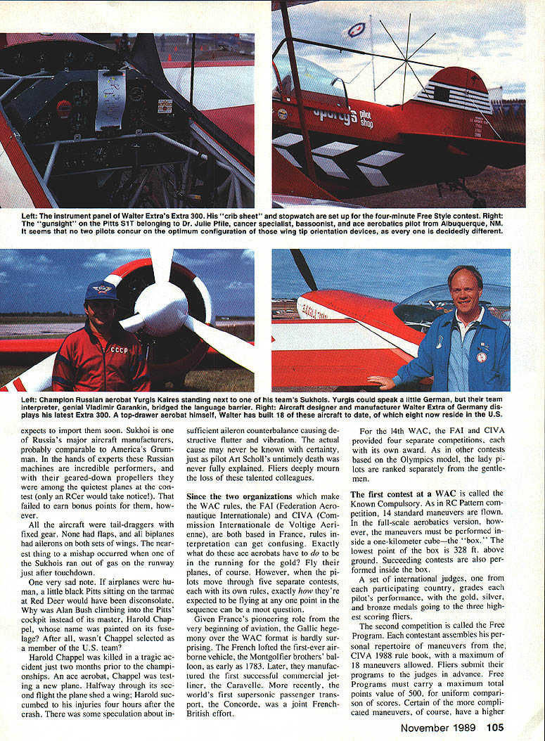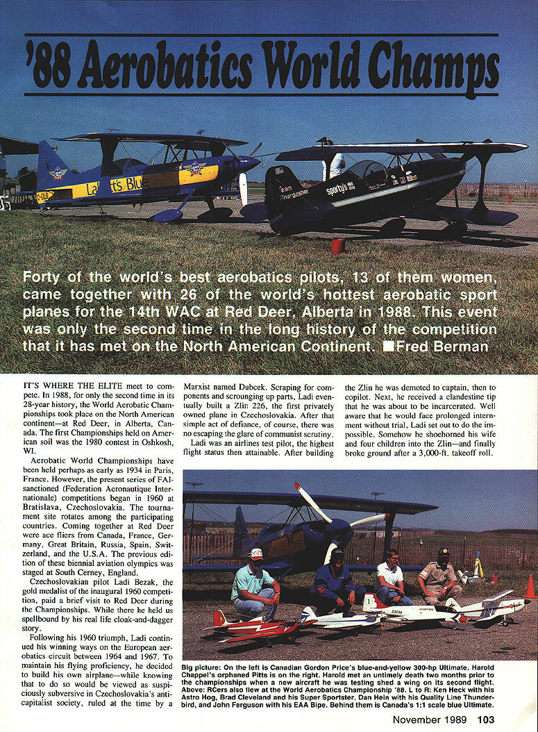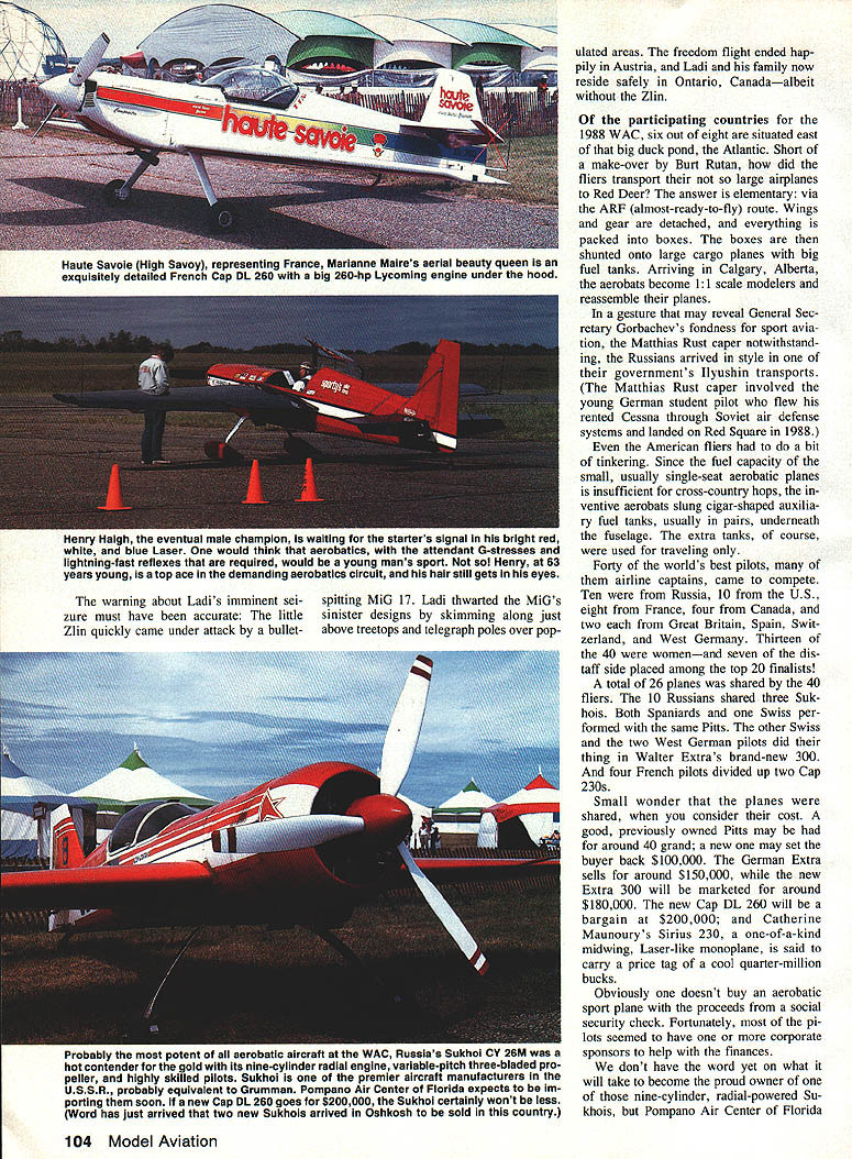 ITS WHERE THE ELITE meet com pete 1988 second time its 28-year history World Aerobatic Cham pionships took place North American continentat Red Deer Alberta Can ada first Championships held Amer ican soil 1980 contest Oshkosh WI Aerobatic World Championships have held perhaps early 1934 Paris France However present series FAI sanctioned Federation Aeronautique Inter nationale competitions began 1960 Bratislava Czechoslovakia tourna ment site rotates among participating countries Coming together Red Deer ace fliers Canada France Ger Great Britain Russia Spain Swit zerland USA previous edi tion biennial aviation olympics staged South Cerney England Czechoslovakian pilot Ladi Bezak gold medalist inaugural 1960 competi tion paid brief visit Red Deer during Championships held us spellbound real life cloak-and-dagger story Following 1960 triumph Ladi contin ued winning ways European aer obatics circuit between 1964 1967 maintain flying proficiency decided build own airplanewhile knowing would viewed suspi ciously subversive Czechoslovakias anticapitalist society ruled time Marxist named Dubcek Scraping com ponents scrounging up parts Ladi tually built Zlin 226 first privately owned plane Czechoslovakia After simple act defiance course no escaping glare communist scrutiny Ladi airlines test pilot highest flight status attainable After building Zlin demoted captain copilot Next received clandestine tip about incarcerated Well aware would face prolonged intern ment trial Ladi set out im possible Somehow shoehorned wife four children Zlinand finally broke ground after 3000-ft takeoff roll November 1989 103 Big picture left Canadian Gordon Prices blue-and-yellow 300-hp Ultimate Harold Chappels orphaned Pitts right Harold met untimely death two months prior championships new aircraft testing shed wing its second flight Above RCers also flew World Aerobatics Championship 88 L R Ken Heck Astro Hog Brad Cleveland Super Sportster Dan Hem Quality Line Thunder bird John Ferguson EAA Bipe Behind Canadas 11 scale blue Ultimate warning about Ladis imminent sei zure must have accurate little Zlin quickly came under attack bulletspitting MiG 17 Ladi thwarted MiGs sinister designs skimming along just above treetops telegraph poles over populated areas freedom flight ended hap pily Austria Ladi family now reside safely Ontario Canadaalbeit Zlin participating countries 1988 WAC six out eight situated east big duck pond Atlantic Short make-over Burt Rutan did fliers transport large airplanes Red Deer answer elementary via ARF almost-ready-to-fly route Wings gear detached everything packed boxes boxes shunted onto large cargo planes big fuel tanks Arriving Calgary Alberta aerobats become 11 scale modelers reassemble planes gesture may reveal General Sec retary Gorbachevs fondness sport avia tion Matthias Rust caper notwithstand ing Russians arrived style governments Ilyushin transports Matthias Rust caper involved young German student pilot flew rented Cessna through Soviet air defense systems landed Red Square 1988 American fliers bit tinkering Since fuel capacity small usually single-seat aerobatic planes insufficient cross-country hops ventive aerobats slung cigar-shaped auxilia ry fuel tanks usually pairs underneath fuselage extra tanks course used traveling Forty worlds best pilots airline captains came compete Ten Russia 10 US eight France four Canada two Great Britain Spain Swit zerland West Germany Thirteen 40 womenand seven dis taff side placed among top 20 finalists total 26 planes shared 40 fliers 10 Russians shared three Suk hois Both Spaniards Swiss per formed same Pitts other Swiss two West German pilots did thing Walter Extras brand-new 300 four French pilots divided up two Cap 230s Small wonder planes shared consider cost good previously owned Pitts may around 40 grand new may set buyer back $100000 German Extra sells around $150000 new Extra 300 will marketed around $180000 new Cap DL 260 will bargain $200000 Catherine Maunourys Sirius 230 one-of-a-kind midwing Laser-like monoplane said carry price tag cool quarter-million bucks Obviously doesnt buy aerobatic sport plane proceeds social security check Fortunately pi lots seemed have corporate sponsors help finances dont have word yet what will take become proud owner nine-cylinder radial-powered Su khois Pompano Air Center Florida 104 Model Aviation Haute Savole High Savoy representing France Marianne Maires aerial beauty queen exquisitely detailed French Cap DL 260 wIth big 260-hp Lycoming engine under hood Henry Haigh eventual male champion waiting starters signal bright red white blue Laser would think aerobatics attendant 6-stresses lightning-fast reflexes required would young mans sport Henry 63 years young atop ace demanding aerobatics circuit hair still gets eyes Probably potent acrobatic aircraft WAG Russias unoi LY wv hot contender gold its nine-cylinder radial engine variable-pitch three-bladed pro peller highly skilled pilots Sukhol premier aircraft manufacturers USSR probably equivalent Grumman Pompano Air Center Florida expects im porting soon new Cap DL 260 goes $200000 Sukhoi certainly wont less Word has just arrived two new Sukhois arrived Oshkosh sold country Left The instrument panel Walter Extras Extra 300 HIs crib sheet stopwatch set up four-minute Free Style contest Right gunsight Pills SiT belonging Dr Julie Pfile cancer specialist bassoonist ace aerobatics pilot Albuquerque NM seems no two pilots concur optimum configuration wing tip orientation devices decidedly different Left Champion Russian aerobat Yurgis Kaires standing next teams Sukhois Yurgis could speak little German team interpreter genial Vladimir Garankin bridged language barrier Right Aircraft designer manufacturer Walter Extra Germany dis plays latest Extra 300 top-drawer aerobat himself Walter has built 18 aircraft date eight now reside US expects import soon Sukhoi Russias major aircraft manufacturers probably comparable Americas Grum man hands experts Russian