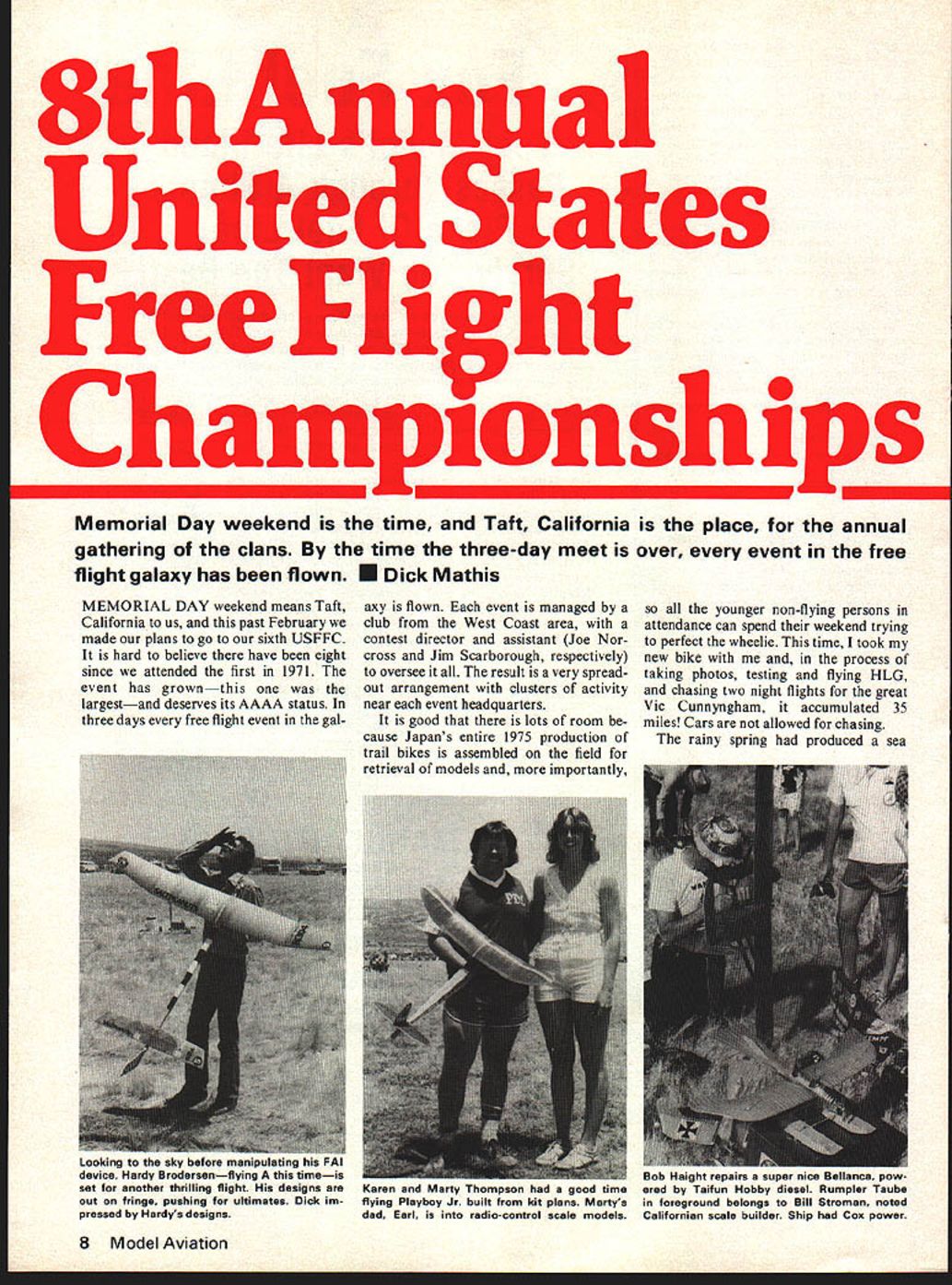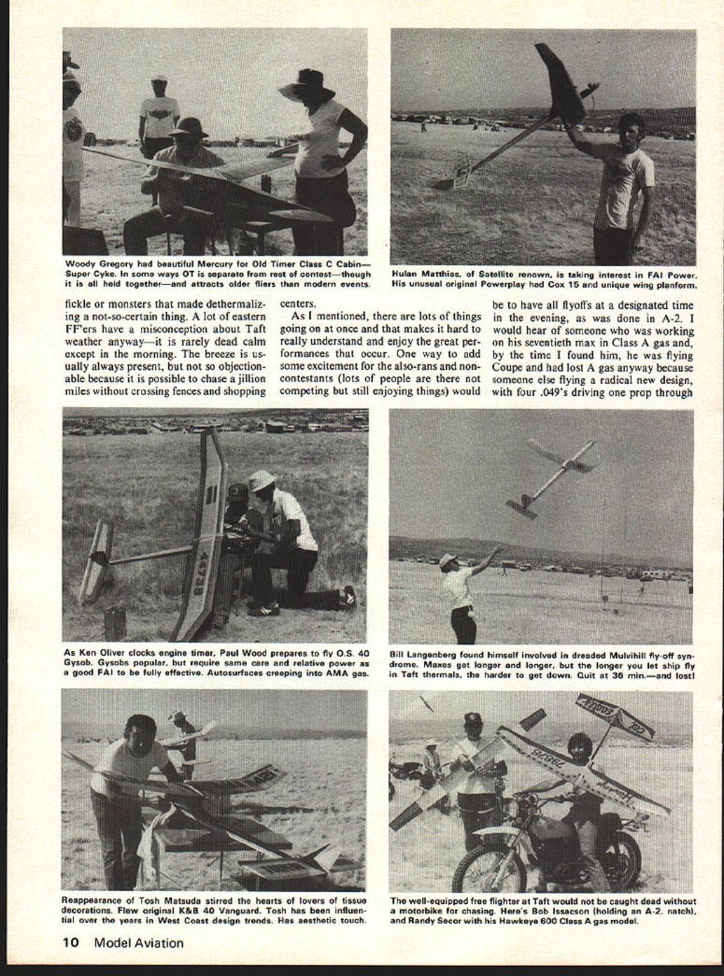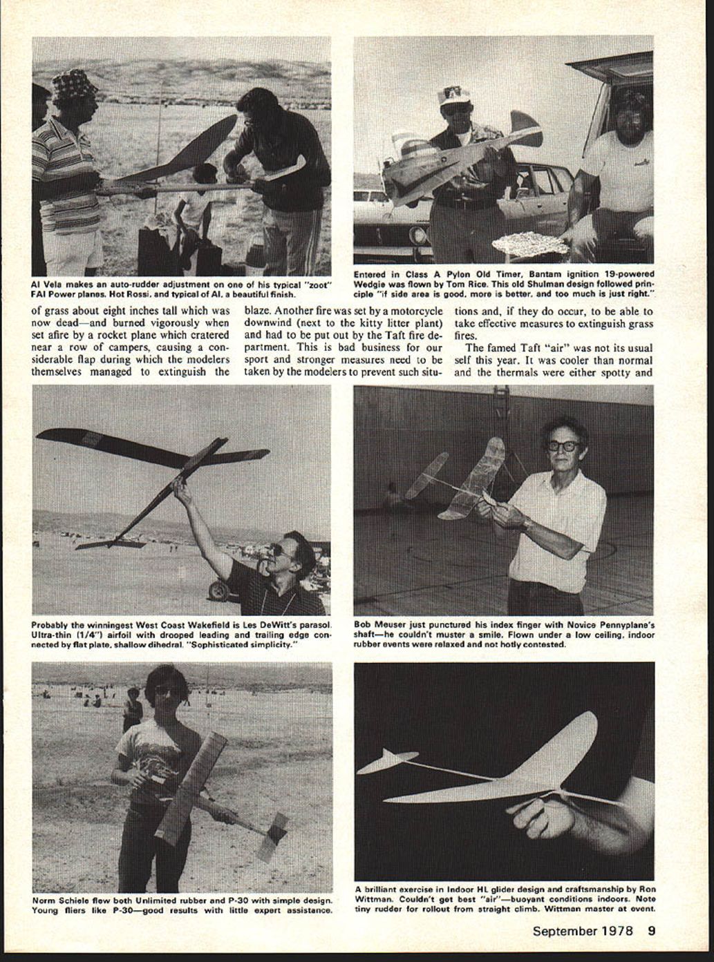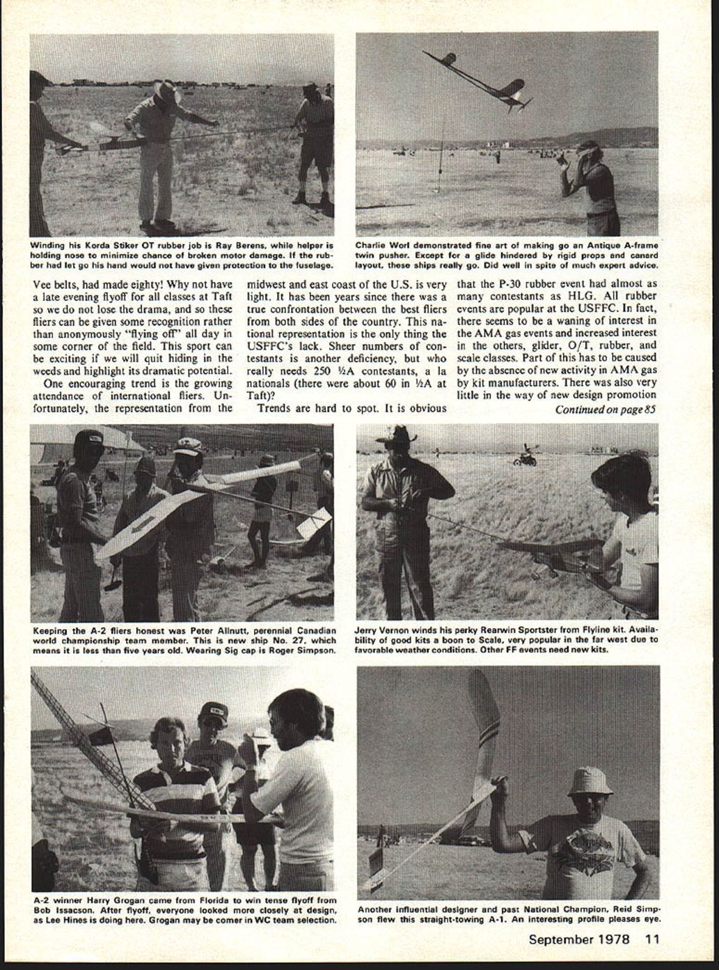 8th Annual States United Free Flipht Champion ships Memorial Day weekend time Taft California place annual gathering clans time three-day meet over event free flight galaxy has flown U Dick Mathis MEMORIAL DAY weekend means Taft California us past February made plans go sixth USFFC hard believe have eight since attended first 1971 event has grownthis largestand deserves its AAAA status three days free flight event galaxy flown event managed club West Coast area contest director assistant Joe Norcross Jim Scarborough respectively oversee result very spreadout arrangement clusters activity near event headquarters good lots room cause Japans entire 1975 production trail bikes assembled field retrieval models importantly younger non-flying persons attendance can spend weekend trying perfect wheelie time took new bike process taking photos testing flying HLG chasing two night flights great Vic Cunnyngham accumulated 35 miles Cars allowed chasing rainy spring produced sea 8 Model Aviation sky before uauupuuauu II uuvcu Brodersenflying timenoo naignr repairs super nice eiianca pow set anoiner thrilling flight designs areraren ana marty i nompson naa gooa timeered Taifun Hobby diesel Rumpler Taube Out Ofl fringe pushing ultimates Dick im-flying Playboy Jr built kit plans Martysin foreground belongs Bill Stroman noted pressed Hardys designsdad Earl radio-control scale modelsCalifornian scale builder Ship Cox power Entered Class Pylon Old Timer Bantam ignition 19-powered Al Vela makes auto-rudder adjustment typical soot Wedgie flown Tom Rice old Shulman design followed prin FAI Power planes Hot Rossi typical Al beautiful finish ciple side area good better too much just right grass about eight inches tall now deadand burned vigorously set afire rocket plane cratered near row campers causing con siderable flap during modelers themselves managed extinguish blaze Another fire set motorcycle downwind next kitty litter plant put out Taft fire de partment bad business sport stronger measures need taken modelers prevent such situtions occur able take effective measures extinguish grass fires famed Taft air its usual self year cooler normal thermals either spotty September1978 9 Probably winningest West Coast Wakefield Lea DeWitts parasol Ultra-thin 1/4l airfoil drooped leading trailing edge con nected flat plate shallow dihedral Sophisticated simplicity Bob Meuser just punctured index finger Novice Pennyplanes shafthe couldnt muster smile Flown under low ceiling indoor rubber events relaxed hotly contested Norm both Unlimited rubber P-30 simple design Young fliers like P-30good results little expert assistance M oriiiiani exercise inaoor ilL giber aesign ano cra~smansnip ny non Wittman Couldnt get best airbuoyant conditions indoors Note tiny rudder rollout straight climb Wittman master event fickle monsters made dethermaliz ing not-so-certain thing lot eastern FFers have misconception about Taft weather anywayit rarely dead calm except morning breeze us ually always present objection able because possible chase jillion miles crossing fences shopping centers As mentioned lots things going once makes hard really understand enjoy great per formances occur way add some excitement also-rans noncontestants lots people competing still enjoying things would have flyoffs designated time evening done A-2 would hear someone working seventieth max Class gas time found him flying Coupe lost gas anyway because someone else flying radical new design four 049s driving prop through 10 Model Aviation Woody Gregory beautiful Mercury Old Timer Class C Cabin Super Cyke some ways OT separate rest contestthough held togetherand attracts older fliers modern events Hulan Matthies Satellite renown taking interest FAI Power unusual original Powerplay Cox 15 unique wing planform As Ken Oliver clocks engine timer Paul Wood prepares fly 05 40 Gysob Gysobs popular require same care relative power good FAI fully effective Autosurfaces creeping AMA gas Bill Langenberg found himself involved dreaded Mulvihill fly-off syn drome Maxes get longer longer longer let ship fly Taft thermals harder get down Quit 36 mmand lost Reappearance Tosh Matsuda stirred hearts lovers tissue decorations Flew original K&B 40 Vanguard Tosh has influen tial over years West Coast design trends Has aesthetic touch well-equipped free fighter Taft would caught dead motorbike chasing Heres Bob lssacson holding A-2 natch Randy Secor Hawkeye 600 Class gas model Vee belts made eighty have late evening flyoff classes Taft lose drama fliers can given some recognition rather anonymously flying off day some corner field sport can exciting will quit hiding weeds highlight its dramatic potential encouraging trend growing attendance international fliers Un fortunately representation midwest east coast US very light has years since true confrontation between best fliers both sides country na tional representation thing USFFCs lack Sheer numbers con testants another deficiency really needs 250 contestants Ia nationals about 60 Y2A Taft Trends hard spot obvious P-30 rubber event almost contestants HLG rubber events popular USFFC fact seems waning interest AMA gas events increased interest others glider O/T rubber scale classes Part has caused absence new activity AMA gas kit manufacturers also very little way new design promotion Continued page 85 September1978 11 Winding Korda Stiker OT rubber job Ray Berens helper holding nose minimize chance broken motor damage rub ber let go hand would have given protection fuselage Charlie WorI demonstrated fine art making go Antique A-frame twin pusher Except glide hindered rigid props canard layout ships really go Did well spite much expert advice Keeping A-2 fliers honest Peter Allnutt perennial Canadian world championship team member new ship No 27 means less five years old Wearing Sig cap Roger Simpson Jerry Vernon winds perky Rearwin Sportster Flyline kit Availa bility good kits boon Scale very popular far west due favorable weather c