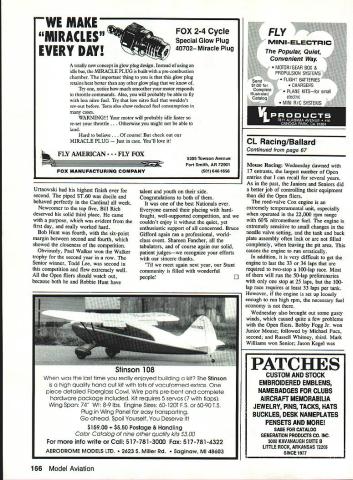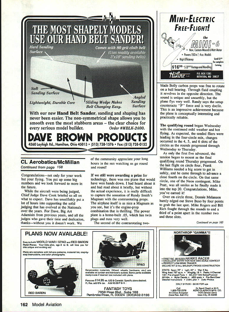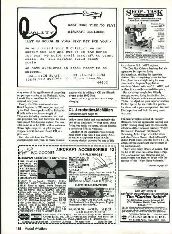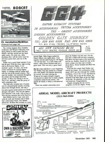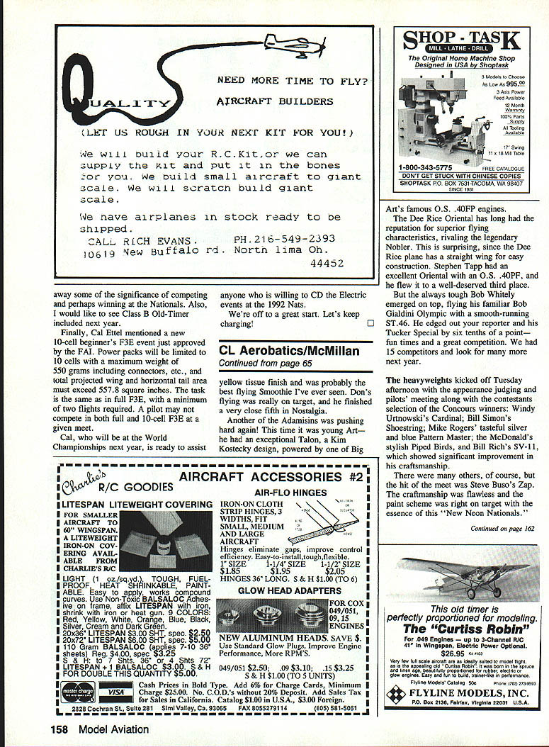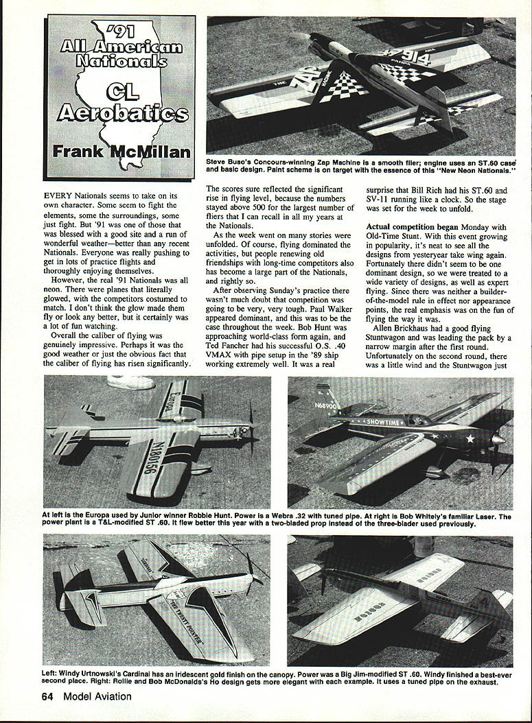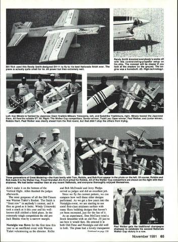 EVERY Nationals seems take its own character Some seem fight elements some surroundings some just fight 91 was blessed good site run wonderful weatherbetter recent Nationals Everyone really pushing get lots practice flights thoroughly enjoying themselves However real 91 Nationals neon planes literally glowed competitors costumed match dont think glow made fly look better certainly lot fun watching Overall caliber flying genuinely impressive Perhaps good weather just obvious fact caliber flying has risen significantly scores sure reflected significant rise flying level because numbers stayed above 500 largest number fliers can recall years Nationals As week went stories unfolded course flying dominated activities people renewing old friendships long-time competitors also has become large part Nationals rightly After observing Sundays practice wasnt much doubt competition going very very tough Paul Walker appeared dominant case throughout week Bob Hunt approaching world-class form again Ted Fancher successful OS 40 VMAX pipe setup 89 ship working extremely well real Actual competition began Monday Old-Time Stunt event growing popularity its neat see designs yesteryear take wing again Fortunately didnt seem dominant design treated wide variety designs well expert flying Since neither builderof-the-model rule effect nor appearance points real emphasis fun flying way Allen Brickhaus good flying Stuntwagon leading pack narrow margin after first round Unfortunately second round little wind Stuntwagon just 64 Model Aviation Steve Busos Concours-winning Zap Machine smooth filer engine uses ST60 case basic design Paint scheme target essence New Neon Nationala surprise Bill Rich ST60 SV-l 1 running like clock So stage set week unfold oft Europa used Junior winner Robbie Hunt Power Webra 32 tuned pipe RI rigni 5oD Wfliteiys familiar Laser power piant T&L-modified ST 60 flew better year two-biaded prop instead three-biader used previousiy Left windy Urtnowskis Cardinsi has iridescent goid finish canopy Power Big Jim-modified ST 60 Windy finished best-ever second piace Right Roiiie Bob McDonaidss Ho design gets elegant example uses tuned pipe exhaust didnt make bottom Vertical Eight Allen thanked judges afterwards gorgeous Old-Timers Warren Tiahrts Rocket finish front row anybodys contest flies good looks Windy Urtnowski took crack year wellknown skill yielded third place extremely tough competition old pro Jack Sheeks won narrow margin Nostalgia flown first time year unofficial event Warren Tiahrt volunteering director Rollie Bob McDonald Jerry Phelps served judges did excellent job Since fly current pattern can compare well older designs performed As get few years Nostalgia event starting see som first-class airplanes surface fliers building designs havent yet recreated just fun As experiment Don McClave tried Stock Smoothie old Fox 35 just see would fare entered both Old-Time Nostalgia did well both plane lovely transparent Continued page 158 November 1991 65 Bill Rich used Randy Smith-designed SV-1 fly best Nationals finish ever plane actually quite small Its 60 power flies extremely well Randy Smith knocked everybodys socks off thissetup ship concept will clearer look shadow ground en gine homebullt 65 High-technology 4 Left Kaz Minato flanked Japanese Open finalists Mitsuru Yokoyama left Sadahiko Voshimura right Minato hosted Japanese fliers flew reliable ST 60 Right Walker Cup competitors Senior winner Todd Lee Open winner Paul Walker Junior winner Robbie Hunt Paul Walker clearly ahead first round didnt stop others trying Three generations Great Modelingthe Hunt family Tom Robble Bob Hunt appear photo left course Robble Bob made Walker Cup Proud Grandad Jim Hunt pitted Hobble Walker Cup competitors shown right airplanes better weather recent Nationals everyone thoroughly enjoyed themselves Paul Walker gets traditional champagne shampoo celebrate second Nationals Walker Cup victory row NEED MORE TIME TO FLY AIRCIAFT BUILDERS UL i LT US ROUH IN YUUR NEXT KIT FOR YOU Je will build RCKitor can suppiy Kit put bones zor build small aircraft giant scale will scratcn build giant scale nave airplanes stock ready shipped CALL RICH EVANS 0619 ew Butfalo ri away some significance competing perhaps winning Nationals Also would like see Class B Old-Timer included next year Finally Cal Ettel mentioned new 10-cell beginners F3E event just approved FM Power packs will limited 10 cells maximum weight 550 grams including connectors etc total projected wing horizontal tail area must exceed 5578 square inches task same full F3E minimum two flights required pilot may compete both full 10-cell F3E given meet Cal will World Championships next year ready assist PH 216-549-2393 North lima Oh 44452 anyone willing CD Electric events 1992 Nats off great start Lets keep charging CL Aerobatics/McMiIIan Continued page 65 yellow tissue finish probably best flying Smoothie Ive ever seen Dons flying really target finished very close fifth Nostalgia Another Adamisins pushing hard again time young Art exceptional Talon Kim Kostecky design powered Big IuAIRCRAFT ACCESSORIES #2 GOODIESAIR-FLO HINGESU LITESPAN LITFWItHT CAVFRINA IRON-ON CLOTH N STRIP HINGES FOR SMALLERWIDThS FITU AIRCRAFT TOSMALL MEDIUMH 60 WINGSPA LITE WEIGHAND LARGEI IRON-ON AIRCRAFTI Hinges eliminate gaps improve control efficiency Easy-to-installtoughflexible 1 SIZE 1-1/4 SIZE 1-1/2 SIZE I$185 $195 $205 LIGHT 1 oz/sqvd TOUGH FUEL-HINGES 36 LONG S & H $100 TO 6I PROOF HEAT SHRINKABLE PAINTABLE asy apply works corn ound HEAD ADAPTERSH curves Use Non-Toxic BALSALOC Adhes-H ye frame affix LITESPAN iron COXI shrink iron heat gun 9 COLORS 51 Red Yellow White Orange Blue Black Silver Cream Dark GreentIES 20x3& LITESPAN $300 SHT spec $250I 20x72 LITESPAN $600 SHT spec $500SAVE $ 3 3110 Gram BALSALOC lies 7-10 36Stand4su4Iupsuve Engine Reg $400 spec 525Performance sheets 7 Shts 36 4 Shts 72 LITESPAN LSALOC $390 S & H 049/051 $250 09 $310 15 $325 FOR DOUBLE THIS QUANTIIY l