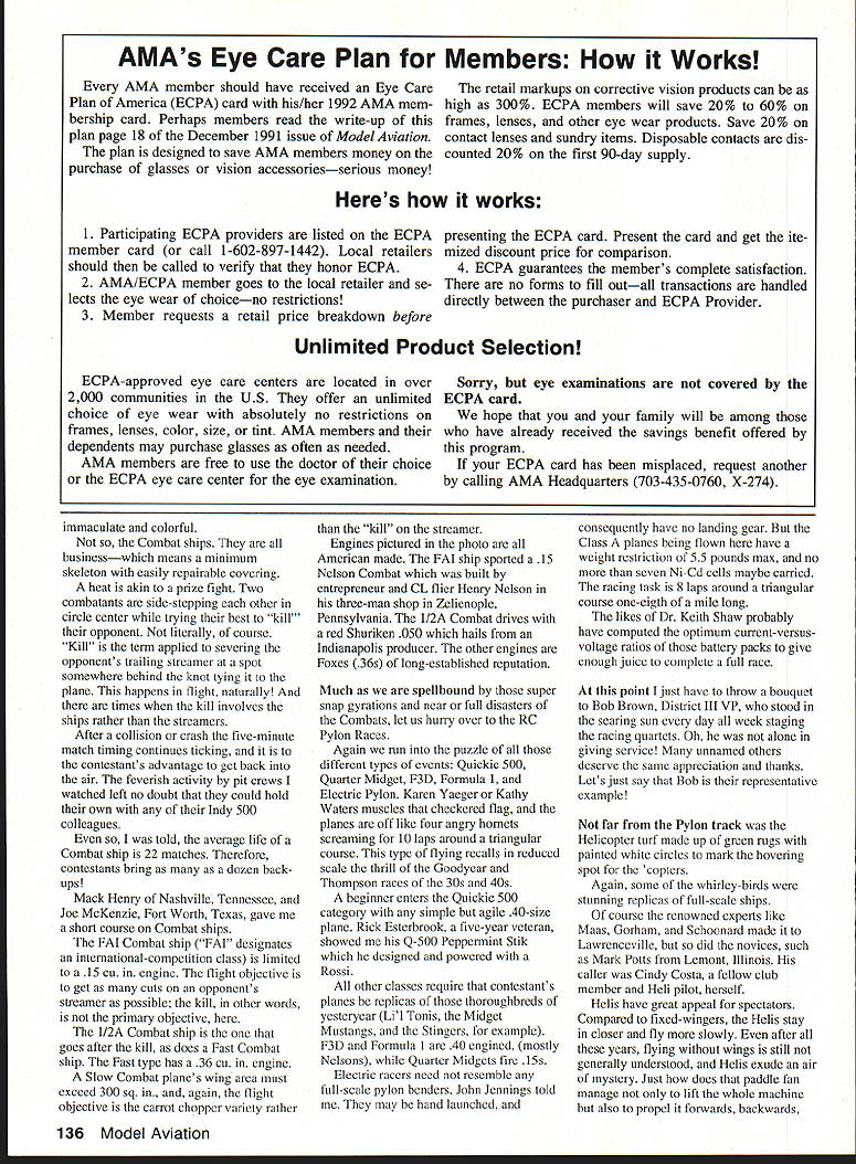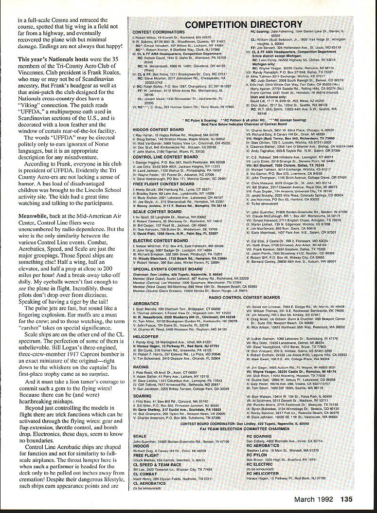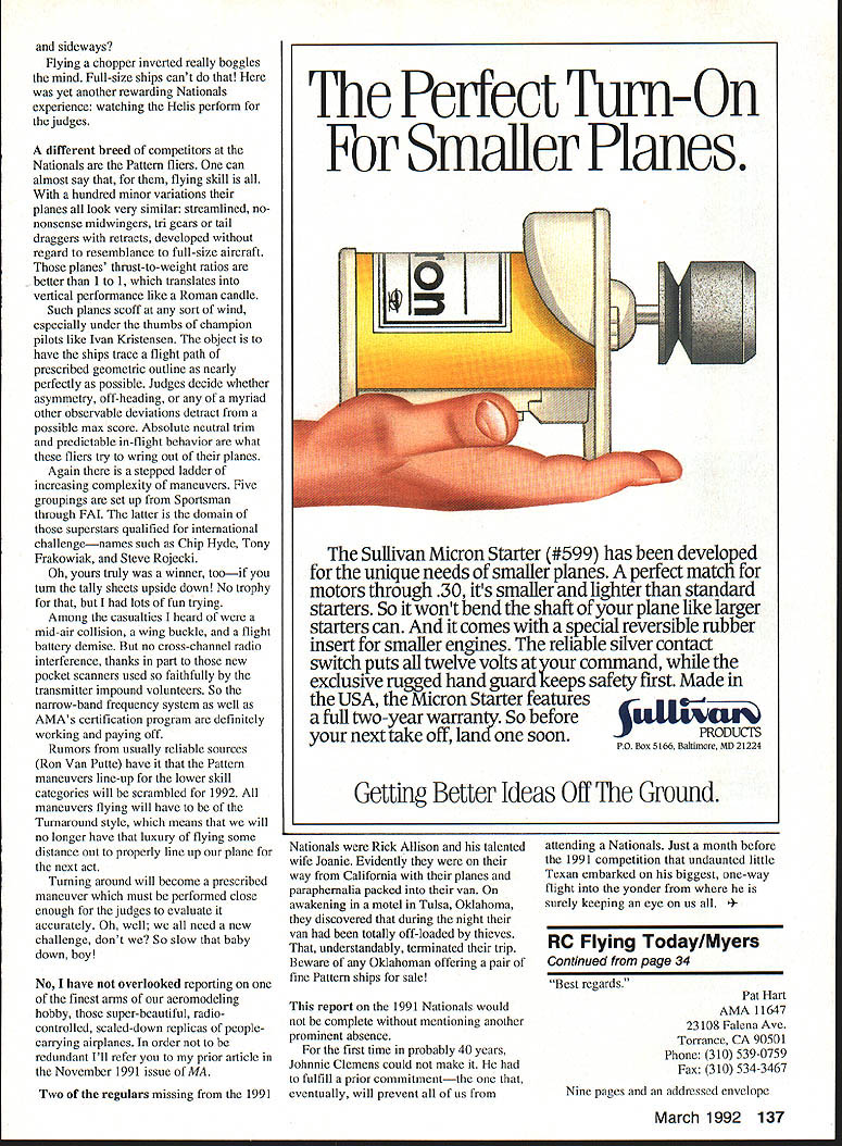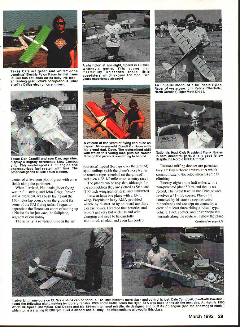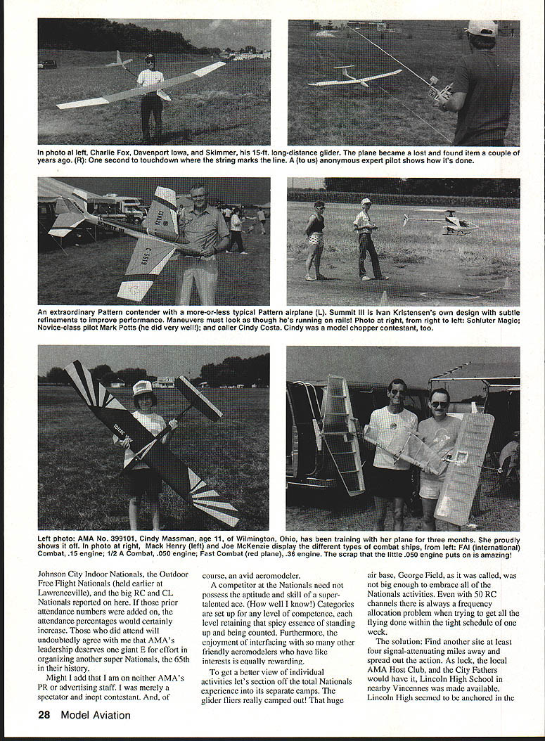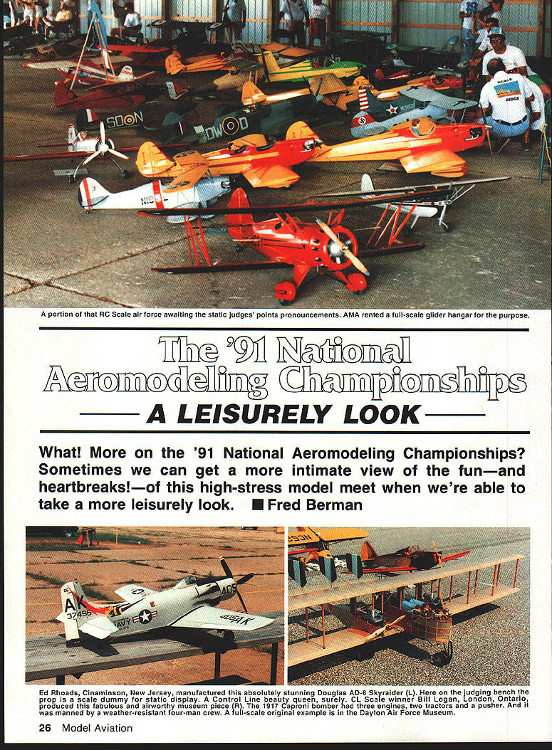 A portion RC Scale air force awaiting static juuys points pronouncemenls MMM renteg S IUU-SCSiS gijoer nangar purpose iIThx 2fl DTJ~2fimifl LEISURELY LOOK What 91 National Aeromodeling Championships Sometimes can get intimate view funand heartbreaksof high-stress model meet able take leisurely look U Fred Berman I Ed Rhoads Cinaminson New Jersey manufactured absolutely stunning Douglas AD-6 Skyraider L udging bench prop scale dummy static display Control Line beauty queen surely CL Scale winner Bill Logan London Ontario produced fabulous airworthy museum piece R 1917 Caproni bomber three engines two tractors pusher manned weather-resistant four-man crew full-scale original example Dayton Air Force Museum 26 Model Aviation CL flier world-renowned engine designer builder Henry Nelson two superb 40-cu-in Pylon Racing specials really proof USA still first some things Adding families support personnel swelled number well over 2000a Take pick covey sky sailers lot people relatively speaking AMA Mike Pratt Montezuma Iowa Megawait turn Lincoln High School flying site relaxing atmosphereclub over 165000 members Thatnum design Sig kit An immaculate CL translates Nationals attendance aPrecision Aerobatics ship Flying lines little 1%up 70 ft longand no throttle cutoff PenAn analyst might say bothalty points accumulate eight-minute good bad Good because AMA wellflight time exceeded towns Lawrenceville Vincennes would hard pressed handle larger groupmotel room seekers can attest Bad because did come missed grand opportunity ringside seat entire spectrum DATELINE The Mid-American Air Center July 1991 huge former US Army air base reemerging joint municipal airport neighboring cities Lawrenceville Illinois Vincennes Indiana base second year running AMA conducted its National Aeromodeling Championships year 1007 pilots registered fly model flying Let share box seat missed show year first time total Nationals three-stage affair Nine years a-building maybe continuously Fairchild C-123 cargo plane L bench Ron Sears Pontiac Ml CL scale ships easy fly relatively heavy Ron blamed crash R pilot error due insufficient practice What shamel March 1992 27 Somebodys got left see Dave Lemhuis Cornell Illinois left Orvil Fisher Muskego Wisconsin just two gooa Samaritans volunteered Nationals service Modelers serving modelersl Hows starter Cathy Waters photo right Northville Mchigan peps up another quartet Pylon Racers Name ring bell Pete Waters VP AMA District VII dad Johnson City Indoor Nationals Outdoor Free Flight Nationals held earlier Lawrenceville big RC CL Nationals reported prior attendance numbers added attendance percentages would certainly increase did attend will undoubtedly agree AMAs leadership deserves giant E effort organizing another super Nationals 65th history Might add am neither AMAs PR advertising staff merely spectator inept contestant course avid aeromodeler competitor Nationals need possess aptitude skill supertalented ace well know Categories set up level competence level retaining spicy essence standing up being counted Furthermore enjoyment interfacing other friendly aeromodelers have like interests eciually rewarding get better view individual activities lets section off total Nationals experience its separate camps glider fliers really camped out huge air base George Field called big enough embrace Nationals activities 50 RC channels always frequency allocation problem trying get flying done within tight schedule week solution Find another site least four signal-attenuating miles away spread out action As luck local AMA Host Club City Fathers would have Lincoln High School nearby Vincennes made available Lincoln High seemed anchored 28 Model Aviation photo al left Charlie Fox Davenport Iowa Skimmer 15-ft long-distance glider piane oecame iost ano touna item coupie ot years ago R second touchdown string marks line us anonymous expert pilot shows its done An extraordinary Pattern contender more-or-less typical Pattern airplane L ummii iii ivan Nrlstensens own aesign wmtn suotme refinements improve performance Maneuvers must look though hes running rails Photo right right left Schiuter Magic Novice-class pilot Mark Potts did very well caller Cindy Costa Cindy model chopper contestant too Left photo AMA No 399101 Cindy Massman age 11 Wilmington Ohio has training plane three months proudly shows off photo right Mack Henry left Joe McKenzie display different types combat ships left FAI international Combat 15 engine 1/2 Combat 050 engine Fast Combat red plane 36 engine scrap little 050 engine puts amazing center tive-acre plot grass corn fields along perimeter arrived Nationals glider flying foil swing John Grigg former AMA president busy laying out 150-meter lap course over ground some FAI flying tasks began appreciate Herculean chore setting up Nationals just Sailplane segment hobby activity varied time air veteran two years flying quite expert Nine-year-old Dondi Garrison proud dad Dave determined skill young man puts Nobler through paces something behold duration speed laps over ground spot landings planes nose trying touch rope stretched ground 28-112 mite cross-country race planes can size although competition slotted Standard 100-inch wingspan less Unlimited saw least plane 15-ft wing Propulsion AMA-provided winch hi-start on-board auxiliary electric power learned batteries motors get very hot use charging need carefully monitored shaded fan cooled Thermal sniffing devices permitted tiny airborne transmitters communicate pilot ship climbing Twenty-eight half miles non-powered plane Yes no record Great Race Chicago area involves 41-mile course Planes launched hi-start sophisticated rubberband kept course crew least three riding vista -type vehicle Pilot spotter driver hope thermals along route will allow plane March 1992 29 Texas Cats green white John Jennings Electric Pylon Racer name cat lands its belly No feet er landing gear Johns occupation what else Dallas electronics engineer champi