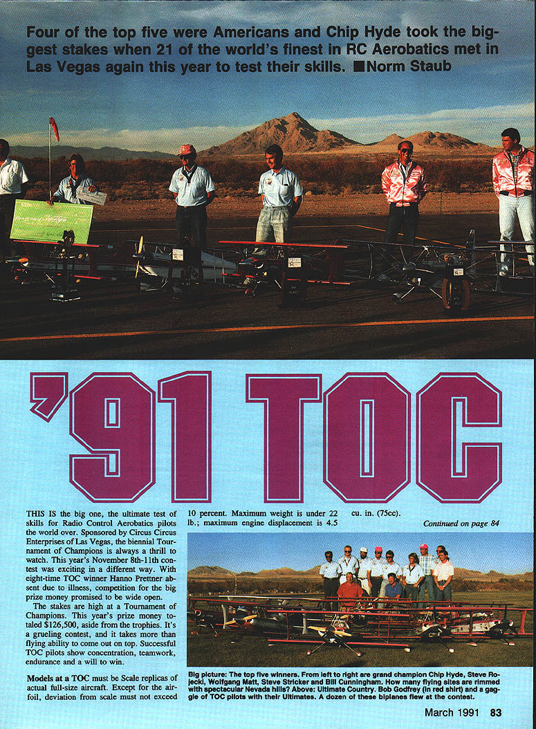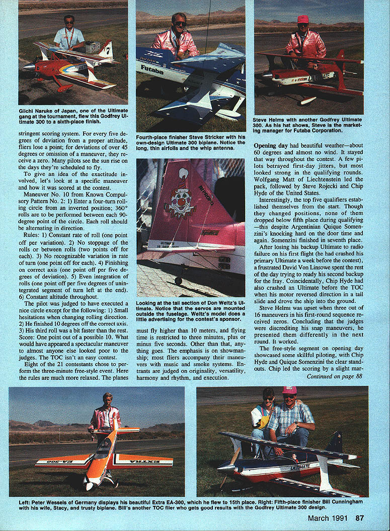 THIS IS big ultimate test c skills Radio Control Acrobat world over Sponsored Circwi Enterprises Las Vegas biennial Tour nament Champions always thrill watch years November 8th-i ith con test exciting different way eight-time TOC winner Hanno Prettner ab sent due illness competition big prize money promised wide open stakes high Tournament Champions years prize money taled $126500 aside trophies Its grueling contest takes flying ability come out top Successful TOC pilots show concentration teamwork endurance will win Models TOC must Scale replicas actual full-size aircraft Except air foil deviation scale must exceed 1 lIE n nmd ut March 1991 83 cu 75cc ConU Left George Manning pits Godfrey-designed UltImate 300 George leaves no doubts about brand fuel uses Bight judges Bill Bennett Circus Circus Enterprises watch Steve Rojecid putting burner second finals round h monoplanes biDlal tered Biplanes receive since theyre considered mor maneuvers question bonus 16 biplanes t ing 12 Ultimates appeared well better addition mandator ii won .Jow lany hours research u theres optional three tyle event Qualifying rounds sts flown first finals fourth day inners mths before contest ceived two maneuver Known Compulsory flown t can m isolation syi id once Sundays ri Friday evenings o unknown set next day sny call AS next-to-last day given two m will fly Sit demanding main Continued t JIU ingent sco ofdeapninte3 e aviatioand beautiful mino i~iveaztsselit tDC Cfli daveeduledpt-day Toaofththe qu Maf Liech ed toeSteve States Entertop five qu tl rolls areisitionS degree pcircle place alternlictionntinial Rulest rate ad 9 Nonisheo ackup Ilight weel UTh 19Von L COITCCo read ofcident tegratedUltini evers pilotitlonoShlpll circle1080Qupset WeIt2first-re hesitationsncluding 2 finishedoil 3 third rolifastern 10 mehis pairthree uiar Other 4 paiphasis segm ikiliful Theeasy coiccompa totsid smo eth ruies ore retaxeem ano P1 PilotAircraftEnginePropPrizeOther & Radio & Score Prizes iChip Hyde USAUltimate 300 42 SachaD-W$25000 $2500 FutabaOVAP20-12105142 2 Steve Rojecki USABuckerTartan TwinTop Flite $15000 Jun manJR POM 1018-10103360 3 Wolfgang Mao LiechtensteinUltimate 300 Zenoah 62S20-115$10000 EutabaFc283 Blade102493 4 Steve Stricker USAUltimate 300 42 SachsD-W$6000 Futaba 9VAP205-10102234 5 Bill Cunningham USAUltimate 300 42 SachaDailey$5500 Futaba 9VAP19-9100703 6 Giichi Naruke JapanUltimata 300 42 SachaAsano$5000 Futaba9VAP20-1248595 7 Quique Somenzini ArgentinaUltimate 300 42 SachsBolly$4500 $5000 Futaba 9VAP205-1248540 B Ivan Kriatensen CanadaUltimate 300 Super TartanZinger$4000 Futaba9VAP18-1047856 9 Dean Koger USAExtra 230Tartan w/belt24-17$3500 maverick among top five finishersFutaba 9VAP46826 Steve Rojecki captured second place Dick Hanson-designed Bucker Jung-10 Gunter t-toppe GermanyBucker R131 Zenoah 62S20-11$3000 mann Instead Ultimate Steve flew im-Futaba9VAP3 Blade45921 presalvely start fInish11 Don Weitz USAUltimate 300 42 Sacha20-1175$2750 JR PCM 103 Blade45894 gin over Quique onlookers were12 John Brilt USASteenSuper TartanDailey2750 $3500 awed Somenzinis flyingSkyboltFutaba 9VAP19-945667 Day Two fliers perform die13 Dave Von Linsowe USACourtesan3W lWln 42DW 22-10 $2750 $1000 known sequence theyd received nightFutaba 9VAP3 Blade44824 before Most still studying ma-14 Steve Helms USAUltimate 300 42 Sacha20-1175$2750 Futaba 9VAP3 Blade42580 neuvers right up point flying them15 Peter Wessels GermanyExtraZenoah 62S20-1175$2750 tried orient themselves simulat- -300Graupner MC41978 ing sequence tiny stick airplanes18 better no practice eorge Manning USA Ultimate 30042 SachaBolly$2750 onlookers know must haveFutaba 9VAP23-1240748 looked like adults playing toys Some aime Hatta Japan Ultimate 300OS BGX-1Asano$2750 pilots transmitter hand callerJR PCM 1020-1037760 read out maneuvers moved 18 John Lockwood USA CAP 21Zenoah 62SDW$2750 sticks sync whatever competitorFutaba 9VAP22-1037245 flying sequence moment 19 Jeff Tracy Austrana Sukhoi Stinl D-W $2750 Dave Von Linsowes H Haigh Special SU 26M JR PCM 10 35952 Courteasan model re-20 Ken Rinks EnglandExtra 300King 87cc22-115$2750 tractable landing gear contest ThoughFutaba 9VAP3 Blade35474 Dave put about five flights the21 John Beasley IrelandUltimate 300 3W-70BZinger$2750 Special before contest end ofJR PCM 1022-1229316 Fridays rounds hed flown 12th place Prize 3-minjte Freestyle Event TOC good caller crucial Prize Beat Mode fliers success Caller flier must work out foolproof system communication errors can damage flight irrevoca- phone connected recorder Quiques don Extra 230 threw prop bly Quique Somenzini dad used father simply started stopped re- second flight Deans efficiency switchinnovative approach tape recorded corder maneuver having ing backup Lazer 200 him flying calling sequences evening During take eyes off sons plane Continued page 184 next days flying wore ear- Dean Koger benefited quick reac- / ,&- Talented up-and-corner Quique Somenzini Argentina prepares flight dad sewed caller tape recordedChip Hyde receiving $25000 check Ivan Diane Krlstensen sleeklythe maneuver sequences Quiquestrophy Bill Bennett Circus Circus Endetailed versIon Godfrey Ultimate 300father started stopped program forterprises left Miss Tournament Ivan flew bIplane eighth placeeach maneuver rather calling outChampions 1990 Tine Heitkemper 88 Model Aviation hand spiral climb Make up motor tying square knot 27-in strip rubber form ioop about 13 long Lube baby shampoo Peck rubber lube Winding requires helper Have him grasp prop hub point model wings horizontal motor stick up Attach rear motor loop winder stretch rubber motor out about three times motor length wind about 150 turns thats 30 cranks winder Move slowly wind grasp motor front crank removing make small loop attach rear hook motor stick Now take model helper Facing wind fly its over 10mphgo gym launch model nose up about 300 wings level Let go prop tip release model letting fly out hand Theres no need throw should spiral
