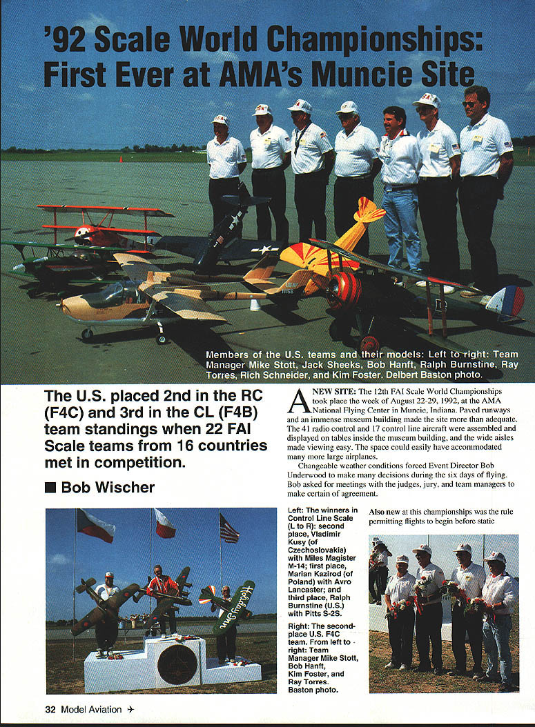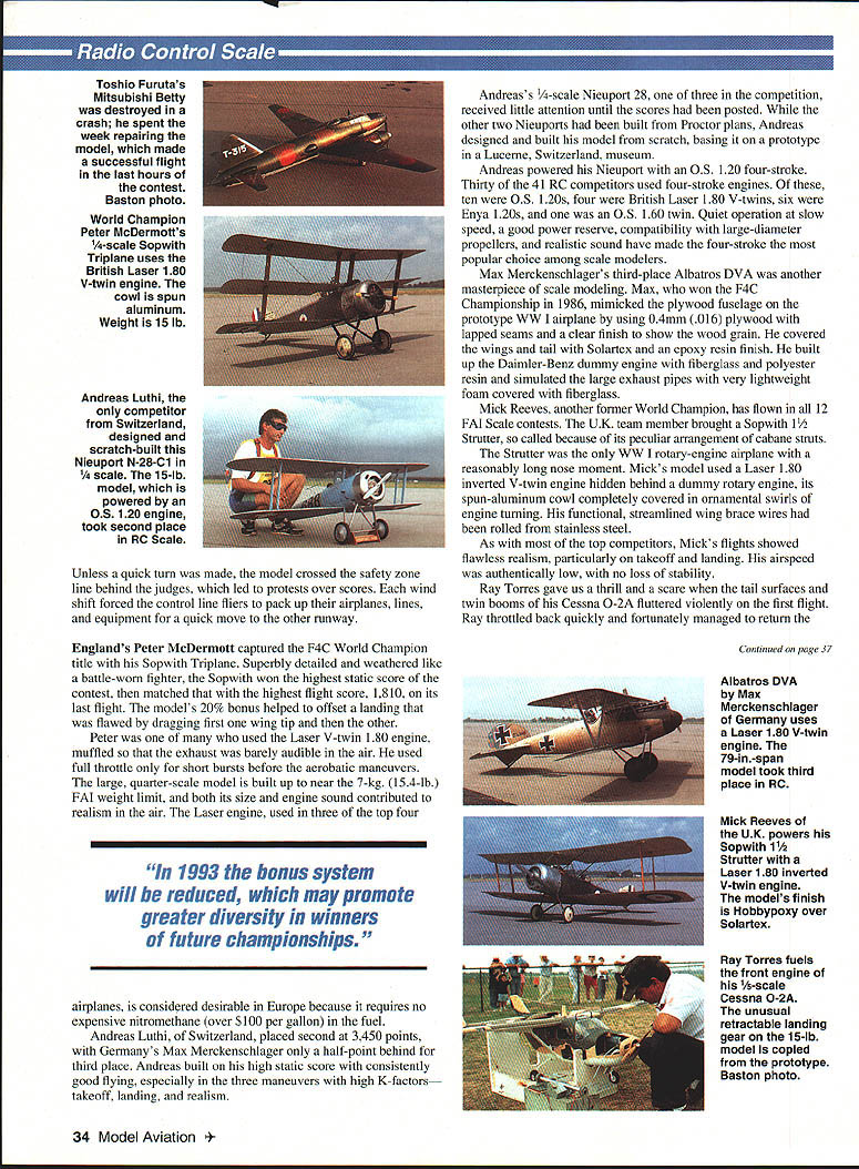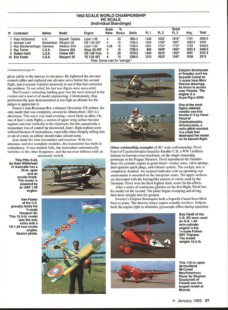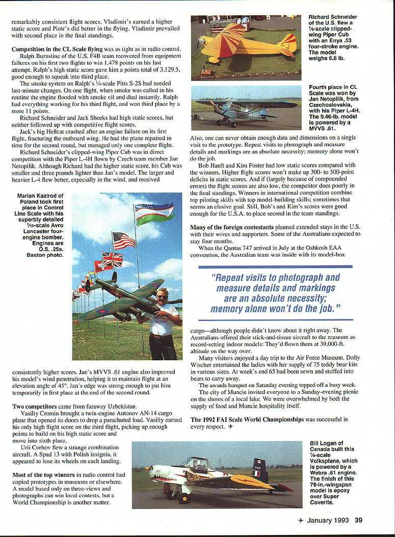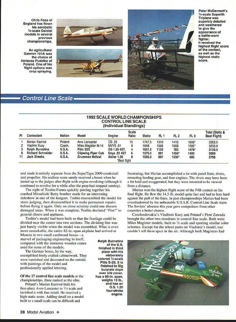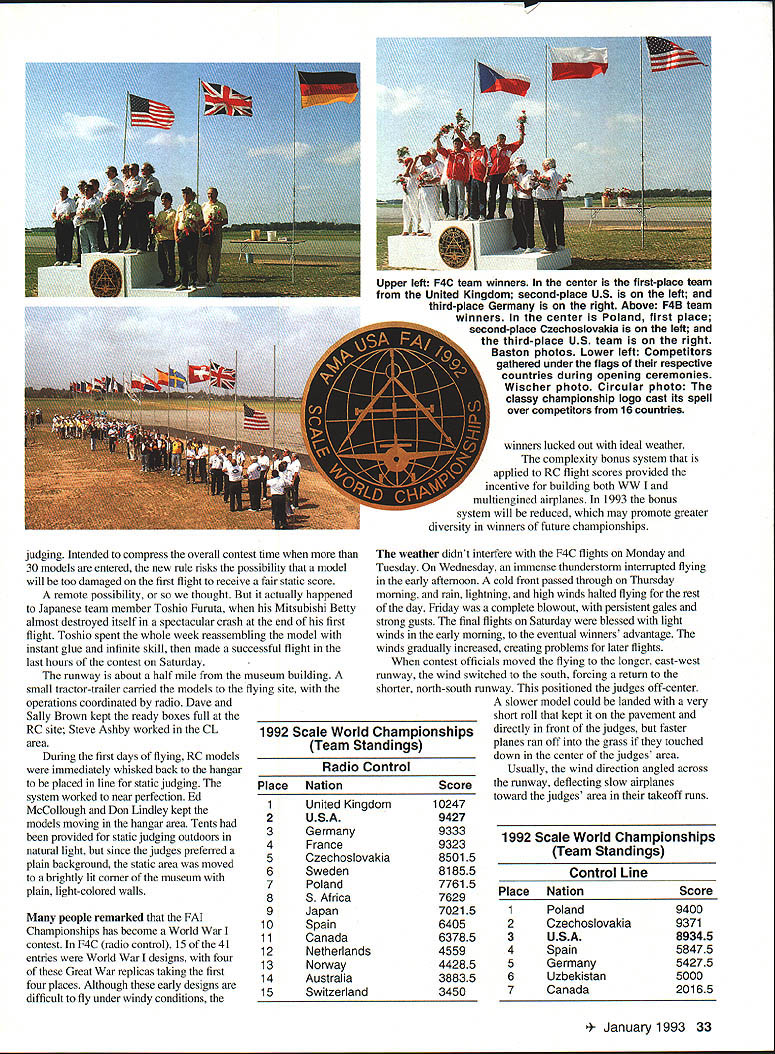 The US placed 2nd RC F4C 3rd CL F4B team standings 22 FAI Scale teams 16 countries met competition ANEW SITE 12th FAI Scale World Championships took place week August 22-29 1992 AMA National Flying Center Muncie Indiana Paved runways immense museum building made site adequate 41 radio control 17 control line aircraft assembled displayed tables inside museum building wide aisles made viewing easy space could easily have accommodated large airplanes Changeable weather conditions forced Event Director Bob Underwood make decisions during six days flying Bob asked meetings judges jury team managers make certain agreement Left winners Control Line Scale L R second place Vladimir Kusy Czechoslovakia Miles Magister M-14 first place Marian Kazirod Poland Avro Lancaster third place Ralph Burnstine US Pitts S-2S Right secondplace US F4C team left right Team Manager Mike Stott Bob Hanif Kim Foster Ray Torres Baston photo Also new championships rule permitting flights begin before static 32 Model Aviation b Wischer winners lucked out ideal weather complexity bonus system applied RC flight scores provided incentive building both WW multiengined airplanes 1993 bonus system will reduced may promote greater diversity winners future championships judging Intended compress overall contest time 30 models entered new rule risks possibility model will too damaged first flight receive fair static score remote possibility thought actually happened Japanese team member Toshio Furuta Mitsubishi Betty almost destroyed itself spectacular crash end first flight Toshio spent whole week reassembling model instant glue infinite skill made successful flight last hours contest Saturday runway about half mile museum building small tractor-trailer carried models flying site operations coordinated radio Dave Sally Brown kept ready boxes full RC site Steve Ashby worked CL area During first days flying RC models immediately whisked back hangar placed line static judging system worked near perfection Ed McCollough Don Lindley kept models moving hangar area Tents provided static judging outdoors natural light since judges preferred plain background static area moved brightly lit corner museum plain light-colored walls people remarked FAT Championships has become World War contest F4C radio control 15 41 entries World War designs four Great War replicas taking first four places Although early designs difficult fly under windy conditions weather didnt interfere F4C flights Monday Tuesday Wednesday immense thunderstorm interrupted flying early afternoon cold front passed through Thursday morning rain lightning high winds halted flying rest day Friday complete blowout persistent gales strong gusts final flights Saturday blessed light winds early morning eventual winners advantage winds gradually increased creating problems later flights contest officials moved flying longer east-west runway wind switched south forcing return shorter north-south runway positioned judges off-center slower model could landed very short roll kept pavement directly front judges faster planes ran off grass touched down center judges area Usually wind direction angled across runway deflecting slow airplanes toward judges area takeoff runs 1992 Scale World Championships Team Standings Control Line PlaceNationScore 1Poland9400 2Czechoslovakia9371 3USA89345 4Spain58475 5Germany54275 6Uzbekistan5000 7Canada20165 Radio Control Place NationScore 1United Kingdom10247 2USA9427 3Germany9333 4France9323 5Czechoslovakia85015 6Sweden81855 7Poland77615 8S Africa7629 9Japan70215 10Spain6405 11Canada63785 12Netherlands4559 13Norway44285 14Australia38835 15Switzerland3450 4- January1993 33 Upper left F4C team winners center first-place team United Kingdom second-place US left third-place Germany right Above F4B team winners center Poland first place second-place Czechoslovakia left third-place US team right Baston photos Lower left Competitors gathered under flags respective countries during opening ceremonies Wischer photo Circular photo classy championship logo cast its spell over competitors 16 countries 1992 Scale World Championships Team Standings U L. V. F&W WV JI shlo Furutas Mitsubishi Betty destroyed crash spent week repairing model made successful flight last hours contest Baston photo World Champion Peter McDermotts -scale Sopwith Triplane uses British Laser 180 V-twin engine cowl spun aluminum Weight 15 lb Andreas Luthi competitor Switzerland designed scratch-built Nieuport N-28-C1 scale 15-lb model powered OS 120 engine took second place RC Scale Unless quick turn made model crossed safety zone line behind judges led protests over scores wind shift forced control line fliers pack up airplanes lines equipment quick move other runway Englands Peter McDermott captured F4C World Champion title Sopwith Triplane Superbly detailed weathered like battle-worn fighter Sopwith won highest static score contest matched highest flight score 1810 its last flight models 20% bonus helped offset landing flawed dragging first wing tip other Peter used Laser V-twin 180 engine muffled exhaust barely audible air used full throttle short bursts before aerobatic maneuvers large quarter-scale model built up near 7-kg 154-lb FAJ weight limit both its size engine sound contributed realism air Laser engine used three top four 1993 bonus system will reduced may promote greater diversity winners future championships airplanes considered desirable Europe because requires no expensive nitromethane over $100 per gallon fuel Andreas Luthi Switzerland placed second 3450 points Germany s Max Merckenschlager half-point behind third place Andreas built high static score consistently good flying especially three maneuvers high K-factorstakeoff landing realism Andreass -scale Nieuport 28 three competition received little attention until scores posted other two Nieuports built Proctor plans Andreas designed built model scratch basing prototype Lucerne Switzerland museum Andreas powered Nieuport OS 