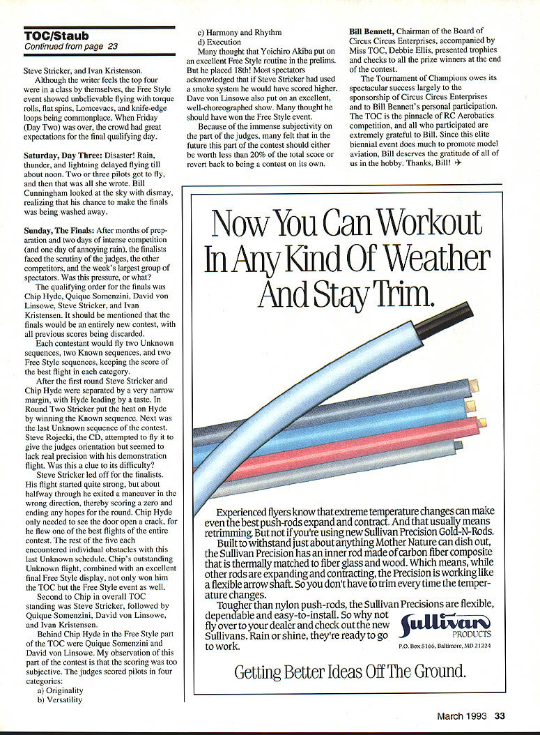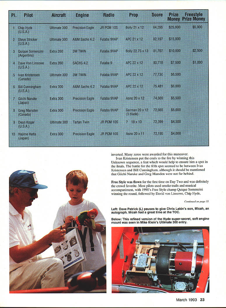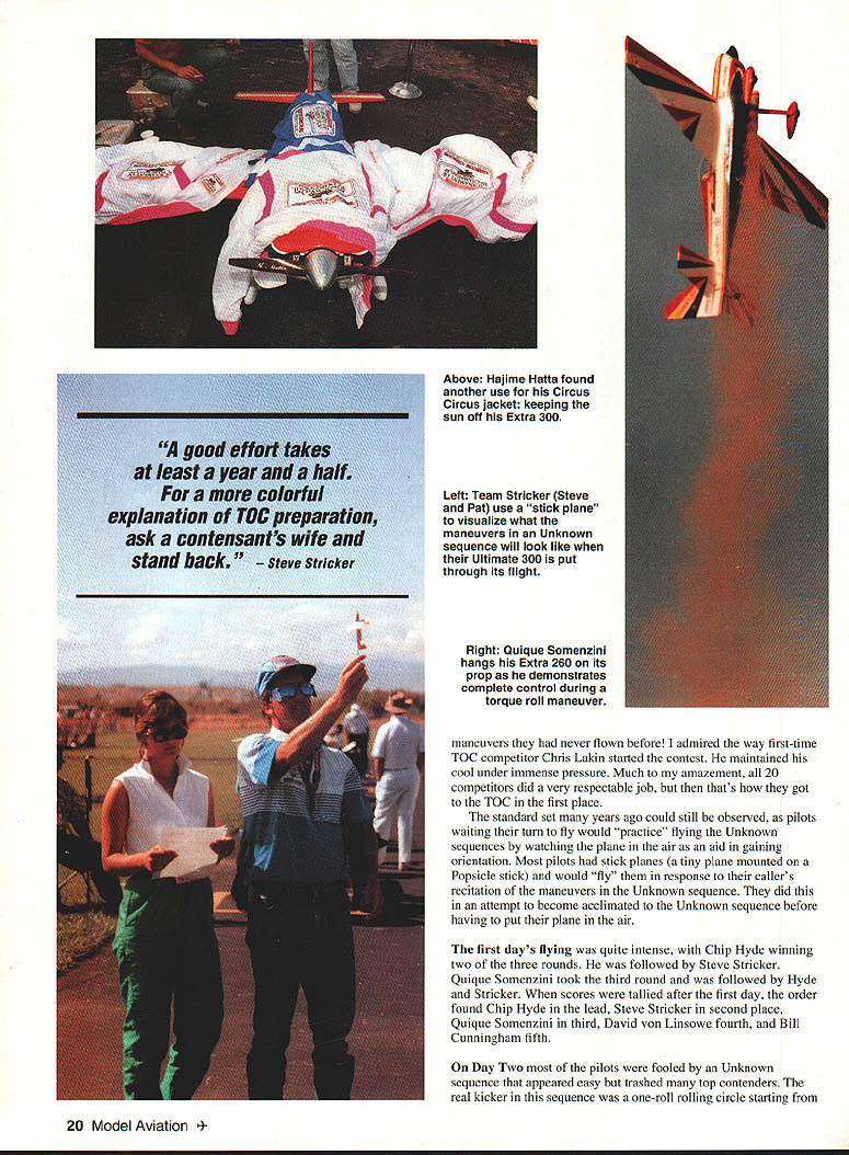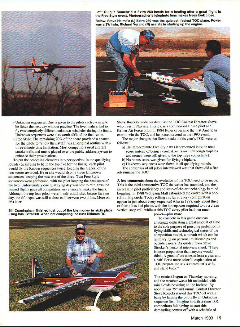 NEVADAS desert near city Las Vegas flying site 1992 Tournament Championsa grueling RC Pattern competition requiring concentration teamwork endurance will win October 22-25 gathering 20 finest RC model pilots world met test skills against another Prize money totaling $127500 awarded TOC winners L-R Quique Somenzini 3rd Steve Stricker 2nd Chip Hyde 1st Dave von Linsowe 4th Ivan Kristensen 5th dust settled time give winner award Thrill Victory belonged Chip Hyde proven himself skillful pilot efforts Chip received $25000 beautiful trophy Circus Circus Hotel Casino Second Chip Hyde Steve Stricker receiving $15000 atrophy Third place earned Argentine flier Quique Someuzini received $10000 atrophy Hyde Somenzini also received $5000 $2500 respectively additional trophies performances Free Style rivalry Dave von Linsowe received $1000 third place Free Style event familiar Tournament Champions TOC series biennial contests let explain some criteria model must scale replica actual full-size aircraft no 10% deviation scale although models airfoils need similar full-size aircraft Maximum engine displacement 45 co 75cc give better understanding demand put upon pilots lets examine format used score TOC flights TOC included three elements test pilots ability Known sequences two different maneuver schedules given competitors about year before contest Forty percent contestants final score will come performance sequences 16 Model Aviation Hydes second straight TOG win flying superb contest site home flying fieldl Plane Ultimate 300 using Precision Eagle power Above Canadas Ivan Kristensen finished fifth place Plane Ultimate 300 using 3W twin power Colorful prop APC 22 x 12 Left Argentinas Quique Somenzini flew third place using Extra 260 Plane featured carbon fiber prop spinner Below Steve Pat Stricker L mechanic Kelly Jacobson Ultimate 300 wing airfoils thinaileron servos protruded March 1993 17 Left Quique Somenzinis Extra 260 heads landing after great flight Free Style event Photographers telephoto lens makes trees look close Below Steve Helmss L Extra 260 quietest fastest TOC plane Power 3W twin Richard Verano RI assists starting up engine Unknown sequences given pilots evening flown next day practice five finalists fly two completely different unknown schedules during finals Unknown sequences also worth 40% final score Free Style remaining 20% score provided chance pilots show stuff via original routine three-minute time limitation Most competitors used aircraft smoke trails music played over public address system enhance presentations put preceding elements perspective qualifying rounds qualifying top five finals pilot would fly Known sequences twice keeping highest two scores awarded would also fly three Unknown sequences keeping best three Two Free Style sequences performed pilot keeping best score two Unfortunately qualifying day lost rain thus missed flights gave competitors less chance make finals Although top four pilots firmly established before rain day fifth spot still close call between two pilots later Steve Rojecki made debut TOC Contest Director Steve lives Navarre Florida commercial airline pilot former Air Force pilot 1984 Rojecki became first American ever win TOC placed second 1990 event major changes Steve made years TOC follows a The three-minute Free Style incorporated total score instead being contest its own although trophies money still given top three contestants b No bonus score given flying biplane c Unknown sequences flown qualifying rounds consensus pilots interviewed Steve did fine job running TOC few comments about evolution TOC need made third consecutive TOC writer has attended increase pilot proficiency state-of-the-art technology mindboggling 1988 Wolfgang Matt astonished crowd oneroll rolling circle Today rolling circles configuration appear just about sequence Also 1988 about three four pilots planes horsepower required clean vertical snap roll TOC pilot much powerplus compete game can anticipate dedicating great amount time sole purpose pursuing perfection flying skills technological status competition model pursuit can quite trying personal relationships outside careers As quoted Steve Stricker s personal interview sheet preparation anyone would think good effort takes least year half colorful explanation TOC preparation ask contestants wife stand back contest began Thursday morning weather bit undecided rain clouds hovering horizon noon 750 sunny Contest Director Steve Rojecki started TOC off bang having pilots fly Unknown sequence first Imagine first-time TOC competitors felt having start demanding contest off schedule March 1993 19 Bill Cunningham finished just out big money sixth place using Extra 300 competing runs Ultimate RC Left Team Stricker Steve Pat use stick plane visualize what maneuvers Unknown sequence will look like Ultimate 300 put through its flight Right Quique Somenrini hangs Extra 260 its prop demonstrates complete control during torque roll maneuver maneuvers never flown before admired way first-time TOC competitor Chris Lakin started contest maintained cool under immense pressure Much amazement 20 competitors did very respectable job thats got TOC first place standard set years ago could still observed pilots waiting turn fly would practice flying Unknown sequences watching plane air aid gaining orientation Most pilots stick planes tiny plane mounted Popsicle stick would fly response callers recitation maneuvers Unknown sequence did attempt become acclimated Unknown sequence before having put plane air first days flying quite intense Chip Hyde winning two three rounds followed Steve Stricker Quique Somenzini took third round followed Hyde Stricker scores tallied after first day order found Chip Hyde lead Steve Stricker second place Quique Somenzini third David von Linsowe fourth Bill Cunningham fifth Day Two pilots fooled Unknown sequence appeared easy trashed top contenders real kicker sequence one-roll rolling circle starting 20 Model Avia