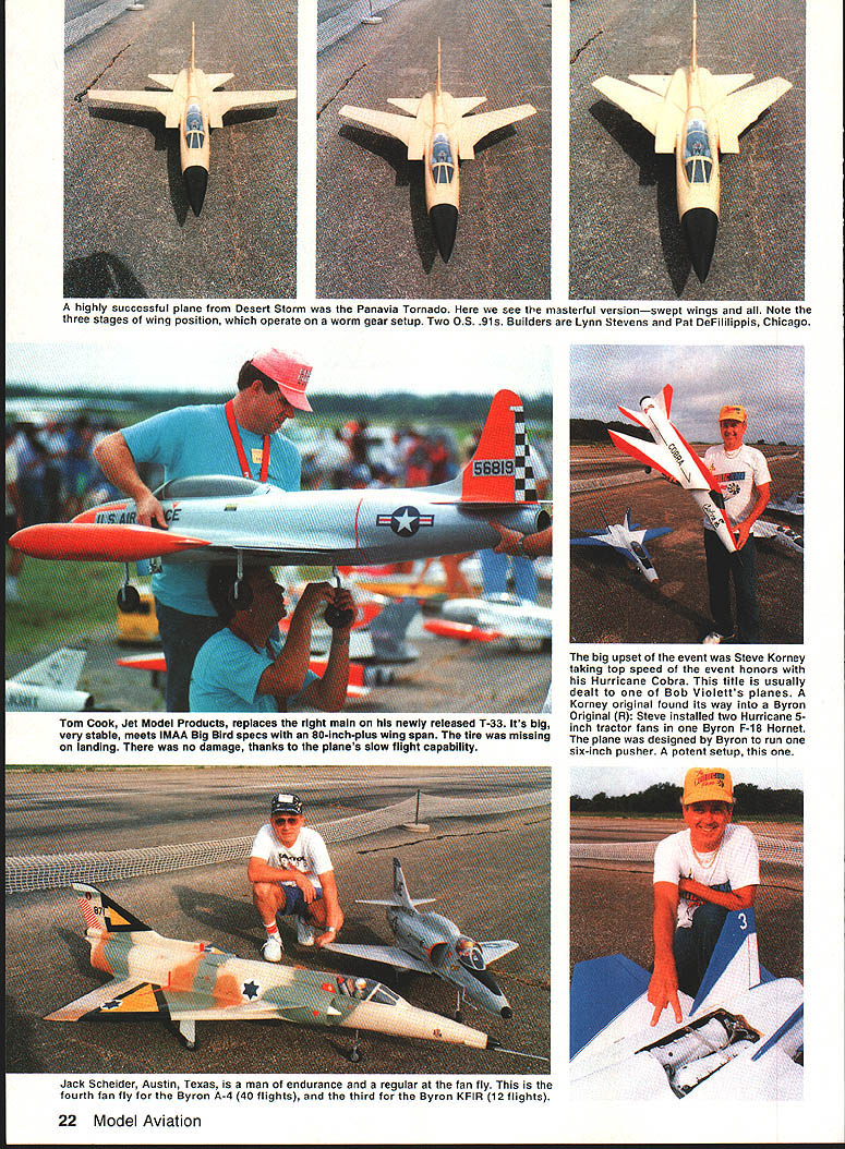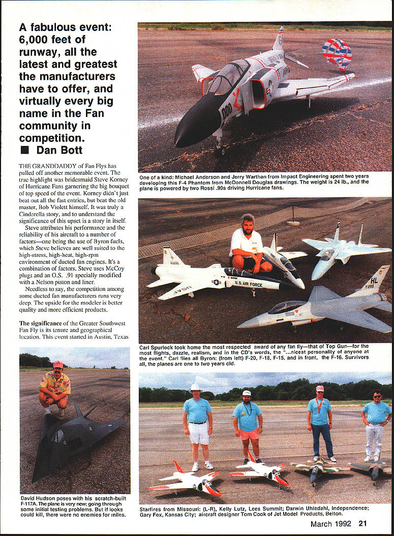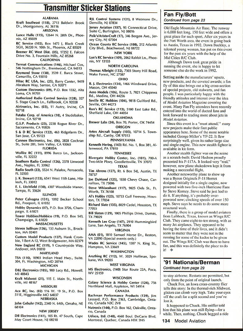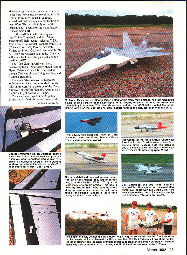 NO OCR TEXT fabulous event 6000 feet runway latest greatest manufacturers have offer virtually big name Fan community competition Dan Bott THE GRANDDADDY Fan Flys has pulled off another memorable event true highlight bridesmaid Steve Korney Hurricane Fans garnering big bouquet top speed event Korney didnt just beat out fast entries beat old master Bob Violett himself truly Cinderella story understand significance upset story itself Steve attributes performance reliability aircraft number factorsone being use Byron fuels Steve believes well suited high-stress high-heat high-rpm environment ducted fan engines Its combination factors Steve uses McCoy plugs OS 91 specially modified Nelson piston liner Needless say competition among some ducted fan manufacturers runs very deep upside modeler better quality efficient products significance Greater Southwest Fan Fly its tenure geographical location event started Austin Texas David Hudson poses scratch-built F-117A plane very new going through some initial testing problems looks could kill no enemies miles March 1992 21 ot kind Mcflael Anderson ana jerry warinan irom mmpamm gilleering spent two years developing F-4 Phantom McDonnell Douglas drawings ne weight 24 lb plane powered two Rossi 90s driving Hurricane fans arm purmoc TOOK nome mom repw.1u dWdIU US dIS 055 flights dazzle realism CDs words .nicest personality anyone event Carl flies Byron left F-20 F-18 F-15 front F-16 Survivors planes two years old Starfires Missouri L-R Kelly Lutz Lees Summit Iarwin unmeaani naepenoence Gary Fox Kansas City aircraft designer Tom Cook Jet Model Products Belton big upset event Steve Korney taking top speed event honors Hurricane Cobra title usually dealt Bob Violetts planes Korney original found its way Byron Original R Steve installed two Hurricane 5inch tractor fans Byron F-18 Hornet plane designed Byron run six-inch pusher potent setup 22 Model Aviation highly successful plane Desert Storm Panavia Tornado see tre masterful versionswept wings ana roie three stages wing position operate worm gear setup Two 0S 91s Builders Lynn Stevens Pat DeFililippis Chicago Tom Cook Jet Model Products replaces right main newly released T-33 Its big very stable meets IMAA Big Bird specs 80-inch-plus wing span tire missing landing no damage thanks planes slow flight capability Jack Scheider Austin Texas man endurance regular fan fly fourth fan fly Byron A-4 40 flights third Byron KFIR 12 flights nine years ago three years later moved Fort Worth area first fan flys country Texas centrally located makes convenient East meet West definitely must attend events manufacturers show stuff Its stuff drawing card stuff like Tom Cook Bob Violett showing off recently released T-33s Tom Cook Jet Model Products won CDs Contest Directors Choice Bob Violett got Pilots Choice Award T 33 word keep hearing will sell bunch things Neat top quality stuff Top Gun award went deservedly Carl Spurlock fleet Byron Originals Fan Jets seemed though Carl always flying smiling having great time Model Airplane News Technical Achievement Award went Mark Frankel impressive re-creation Navy Skyray Bob Ruff Phoenix Arizona won Slow Flight Award 12 mph event staged Copeland Ministries Airfield formerly known Continued page 134 mast detail accurate scaie F-16 fan market today has provided Bob Violett Truly Jet Scale modelers dream project flown Bob himself says takes along several sets spare parts help keep other F-16 fliers air having much fun too winner Ninth Annual Southwest Fan Fly Pilots Choice Award Bob Violetts newly released T-33 plane few ducted fans IMAA legal over 80-inch wingspan Wow Carl Spurlock Southwest Fan Fly eventual Top Gun winner event flew numerous flights Byron Jets seen making scale fly bys scale rotations takeoff iie reveais increaiie reellam ouu wun Look smiles R Eldon Bennett right provides moral suppurt Aircraft F-4 went Plane built Hank Stafford center Bill Holland uI nrc rom Lubbock Texas March 1992 23 Mr Model Maker himself George Miller noted movie planes has just released single-engine version Lockheed YF-22 Plenty power stable extremely intimidating above shot shows realistic YF-22 Miller ducted fan looks Retired Air Force test pilot Colonel Bob Thacker handled early test flights bird Skyray built tiown b Mark Frankel won Model Airplane News Technical Achievement Award Master craftsman Ralph DeBiase shows what few hours extra work can produce want enclose retract gear plane Hurricane Cobra Theyre starting show up some impressive hands gear doors worth 10 15 mph Transmitter Sticker Stations ALABAMA Kraft Southeast 118 2713 Baldwin Brook Dr Montgomery AL 36116 ARIZONA Lance HaIle 115 12644 N 28th Dr Phoe nix AZ 85029 RC Service 102 Box 1472 1 Black Creek SCII 36220 N 10th St Phoenix AZ 85029 Beemer RC West Dist 05 17252 E Falcon Drive No 3 Fountain Hills AZ 85268 CALIFORNIA Terrsat Communications 146 Michael Cox 546 Nottingham Dr Brentwood CA 94513 Raymond Stone 138 3539 E Barca Street Camarillo CA 93010 Hitec RC USA Inc 25 Barry Canter 9419 Abraham Way Santee CA 92071 Custom Electronics 09 PO Box 1332 Alta Loma CA 91701 Authorized Radio Control Service 128 327 S Stage Coach Ln Fallbrook CA 92028 Airtronics Inc 03 11 Autry Irvine CA 92718 Futaba Corp America 10 4 Studebaker Irvine CA 92718 GSP Products 23 2238 Rogue River Dr Sacramento CA 95826 S & D RC Service 122 463 Ridgefarm Dr San Jose CA 95123 Cannon Electronics Inc 06 2828 Cochran St Suite 281 Simi Valley CA 93065 FLORIDA Wollitz RC 111 8996 Barco Ln Jackson ville FL 32222 Southern Radio Control 126 2378 Linwood Ave Naples FL 33962 Radio South 22 5524 N Palafox Pensacola FL 32503 J K Stewart 133 6541 West 11th Lane Hia leah FL 33012 E L Litchfield 130 4307 Woodside Manor Tampa FL 33624 ILLINOIS Peter Calvagna 131 1092 Becker School Rd Freeport IL 61032 Hobby Dynamics 07 PO Box 3726 Cham paign IL 61821 Tower Hobbies/Hobbico 19 PO Box 543 Champaign IL 61820 MASSACHUSETTS Steven Sullivan 136 133 Auburn St Brock ton MA 02401