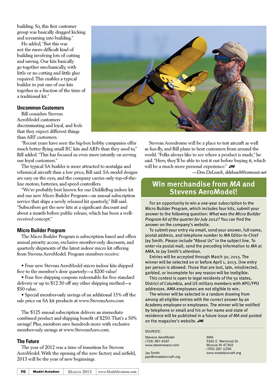 “I learned that I would rather devote most of my time to developing great kits than serving as a full-line hobby shop with full-line hobby items like cars, trains, etc. So we closed the shop in 2011 and have shifted our focus back to the Stevens AeroModel RC line.”