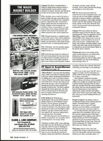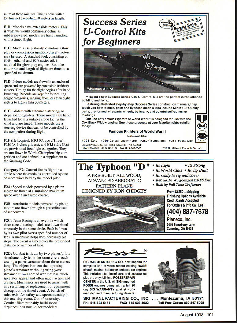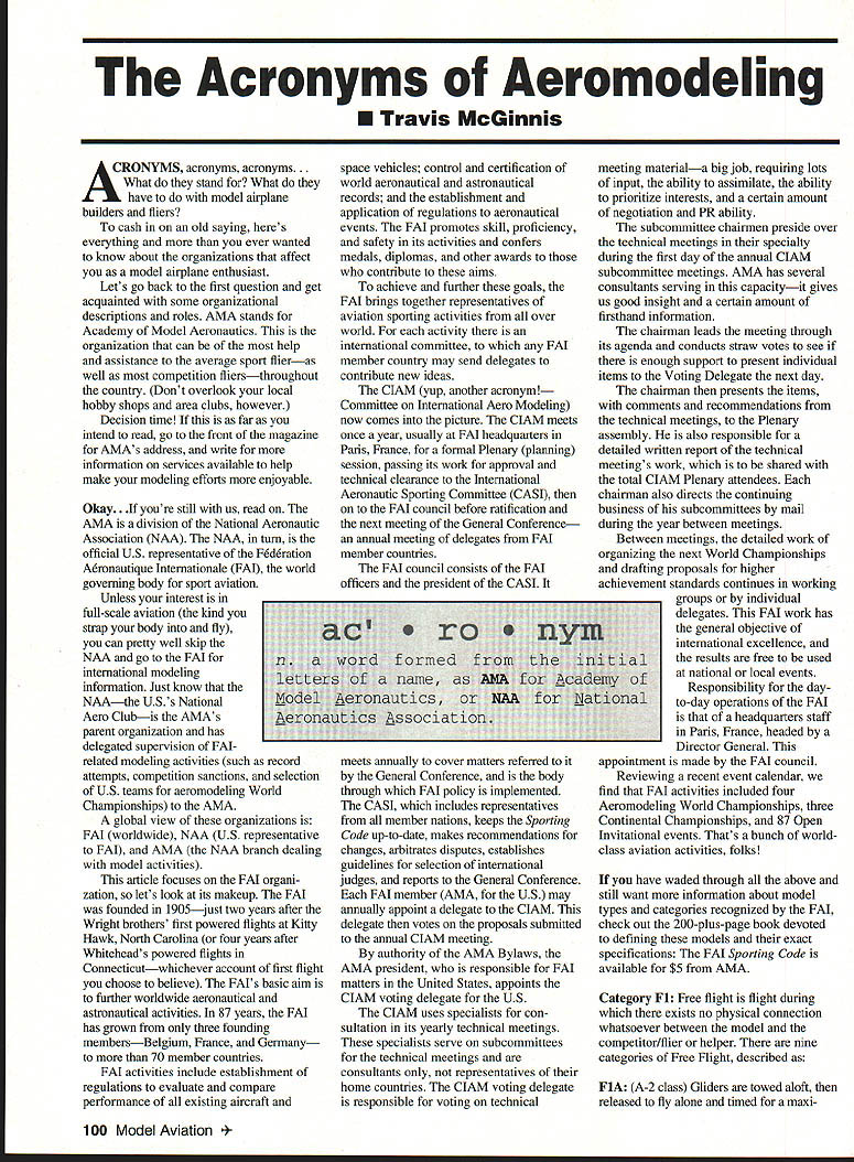 The Acronyms Aeromodeling U Travis McGinnis ACRONYMS acronyms acronyms. What stand What have model airplane builders fliers cash old saying heres everything ever wanted know about organizations affect model airplane enthusiast Lets go back first question get acquainted some organizational descriptions roles AMA stands Academy Model Aeronautics organization can help assistance average sport flieras well competition fliersthroughout country Dont overlook local hobby shops area clubs however Decision time far intend read go front magazine AMAs address write information services available help make modeling efforts enjoyable Okay. youre still us read AIvIA division National Aeronautic Association NAA NAA turn official US representative Federation Aronautique Internationale FM world governing body sport aviation Unless interest full-scale aviation kind strap body fly can pretty well skip NAA go FM international modeling information Just know NAAthe US s National Aero Clubis AIVIAs parent organization has delegated supervision FATrelated modeling activities such record attempts competition sanctions selection US teams aeromodeling World Championships AMA global view organizations FAT worldwide NAA US representative FAI AMA NAA branch dealing model activities article focuses FM organi zation lets look its makeup FAT founded 1905just two years after Wright brothers first powered flights Kitty Hawk North Carohna four years after Whiteheads powered flights Connecticutwhichever account first flight choose believe FMs basic aim further worldwide aeronautical astronautical activities 87 years FAT has grown three founding membersBelgium France Germany 70 member countries FAT activities include establishment regulations evaluate compare performance existing aircraft space vehicles control certification world aeronautical astronautical records establishment application regulations aeronautical events FAT promotes skill proficiency safety its activities confers medals diplomas other awards contribute aims achieve further goals FM brings together representatives aviation sporting activities over world activity international committee FAT member country may send delegates contribute new ideas ClAM yup another acronym Conmiittee International Aero Modeling now comes picture ClAM meets once year usually FM headquarters Paris France formal Plenary planning session passing its work approval technical clearance International Aeronautic Sporting Committee CAST FM council before ratification next meeting General Conference annual meeting delegates FAT member countries FM council consists FM officers president CAST 0 meets annually cover matters referred General Conference body through FAI policy implemented CAST includes representatives member nations keeps Sporting Code up-to-date makes recommendations changes arbitrates disputes establishes guidelines selection international judges reports General Conference FAT member AMA US may annually appoint delegate CIAIVI delegate votes proposals submitted annual ClAM meeting authority AMA Bylaws AMA president responsible FAT matters United States appoints ClAM voting delegate US ClAM uses specialists con sultation its yearly technical meetings specialists serve subcommittees technical meetings consultants representatives home countries ClAM voting delegate responsible voting technical meeting materiala big job requiring lots input ability assimilate ability prioritize interests certain amount negotiation PR ability subcommittee chairmen preside over technical meetings specialty during first day annual ClAM subcommittee meetings AMA has several consultants serving capacityit gives us good insight certain amount firsthand information chairman leads meeting through its agenda conducts straw votes see enough support present individual items Voting Delegate next day chairman presents items comments recommendations technical meetings Plenary assembly also responsible detailed written report technical meetings work shared total ClAM Plenary attendees chairman also directs continuing business subcommittees mall during year between meetings Between meetings detailed work organizing next World Championships drafting proposals higher achievement standards continues working groups individual delegates FAT work has general objective international excellence results free used national local events Responsibility dayto-day operations FAT headquarters staff Paris France headed Director General appointment made FAT council Reviewing recent event calendar find FAT activities included four Aeromodeling World Championships three Continental Championships 87 Open Invitational events Thats bunch worldclass aviation activities folks have waded through above still want information about model types categories recognized FAT check out 200-plus-page book devoted defining models exact specifications FAT Sporting Code available $5 AMA Category Fl Free flight flight during exists no physical connection whatsoever between model competitor/flier helper nine categories Free flight described FlA A-2 class Gliders towed aloft released fly alone timed maxi 100 Model Aviation me tics ocia mum three minutes done towline exceeding 50 meters length FiB Models have extensible motors what would commonly define rubber powered models hand launched timed flight FiC Models use piston-type motors Glow plug compression ignition diesel motors may used standard fuel consisting 80% methanol 20% castor oil required glow plug engines Both motor run length flight timed specified maximum FiD Indoor models flown enclosed space powered extensible rubber motors Timing flight begins after hand launching Records kept four ceiling height categories ranging less eight meters higher 30 meters FlE Gliders automatic steering slope soaring gliders models hand launched suitable slope facing wind timed models use steering device cannot controlled competitor during flight FiF Helicopter FiG Coupe dHiver F1H A-l class gliders F1J 1/2A Ga