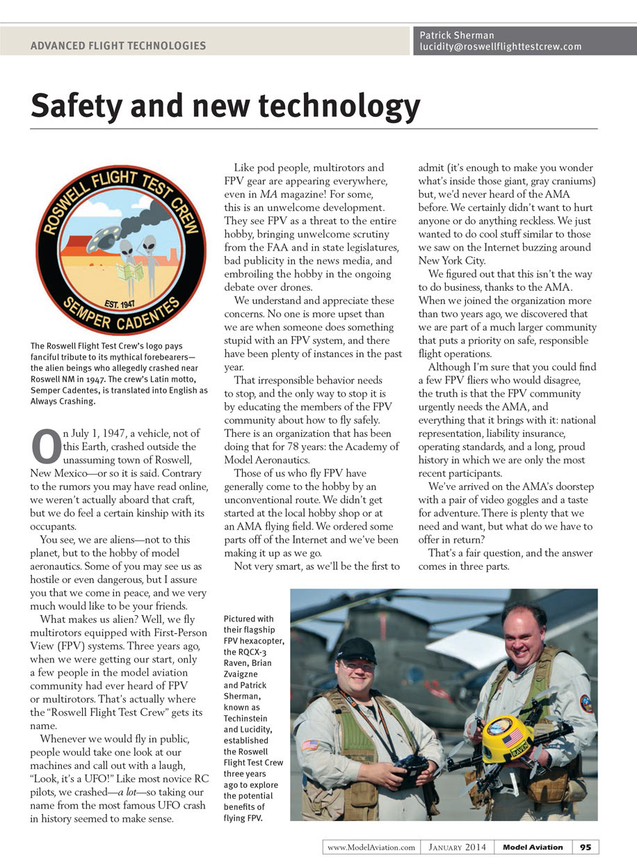 What makes us alien? Well, we fly multirotors equipped with First-Person View (FPV) systems. Three years ago, when we were getting our start, only a few people in the model aviation community had ever even heard of either FPV or multirotors. That’s actually where the “Roswell Flight Test Crew” gets its name.