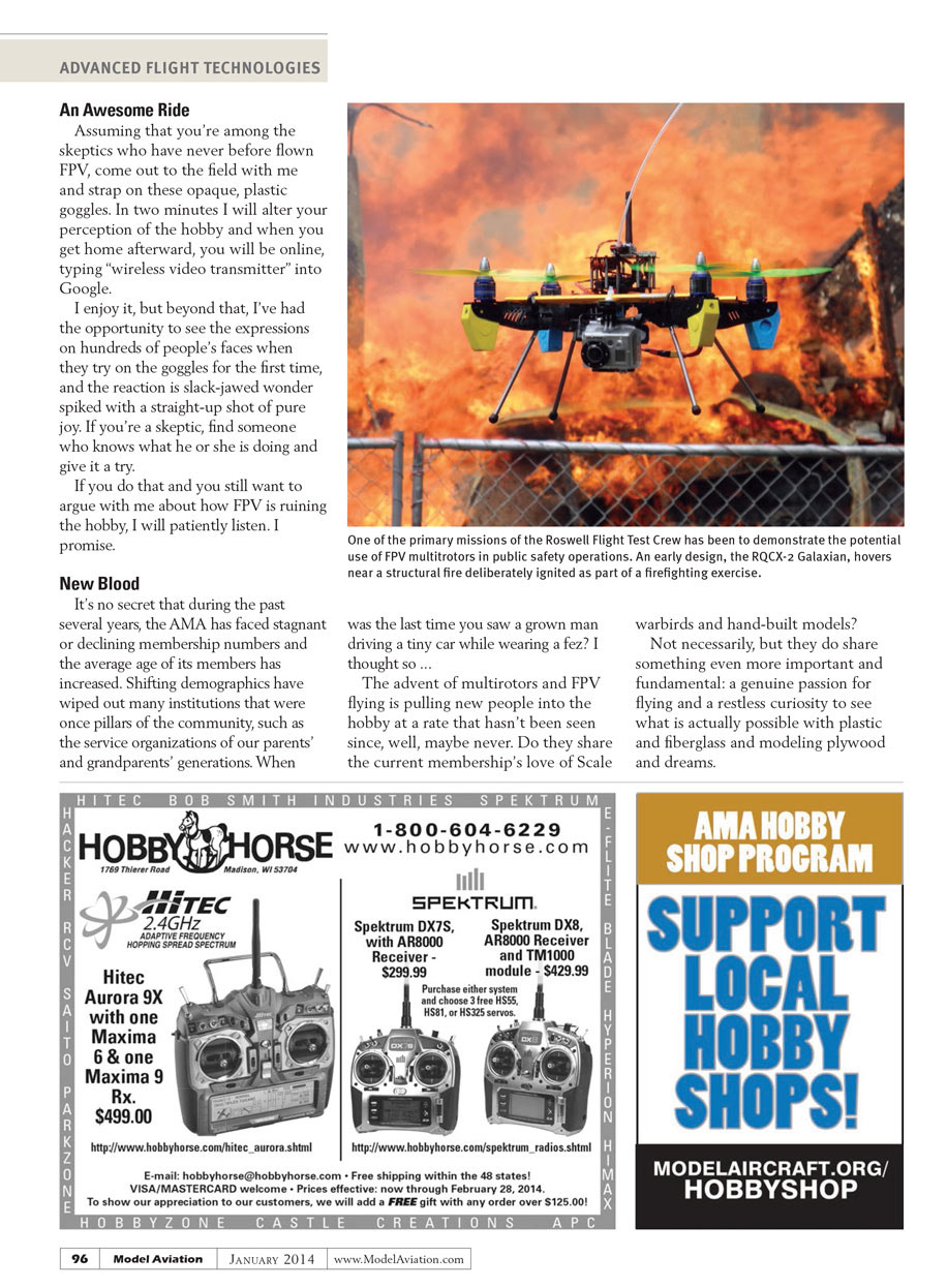 The advent of multirotors and FPV flying is pulling new people into the hobby at a rate that hasn’t been seen since, well, maybe never. Do they share the current membership’s love of Scale warbirds and hand-built models? Not necessarily, but they do share something even more important and fundamental: a genuine passion for flying and a restless curiosity to see what is actually possible with plastic and fiberglass and modeling plywood and dreams.
