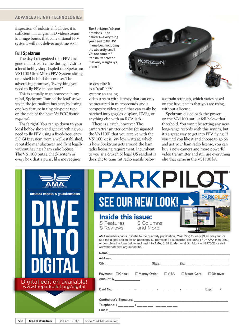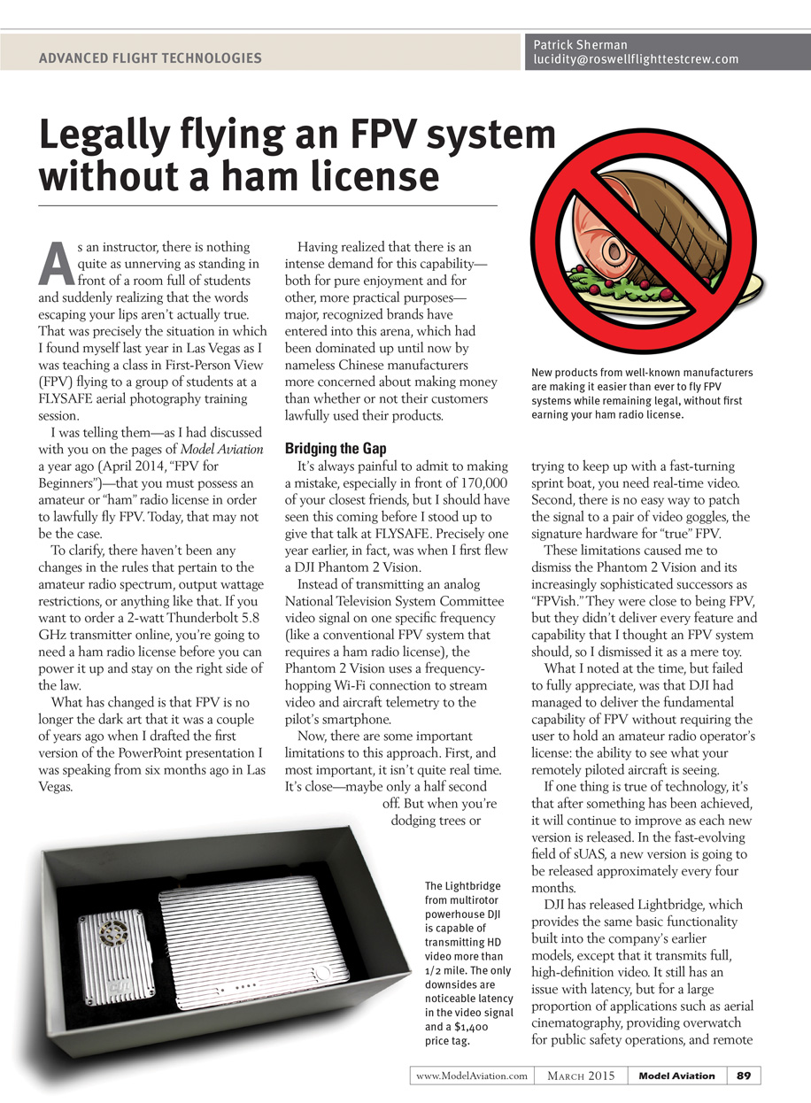 I was telling them—as I had discussed with you on the pages of Model Aviation a year ago (April 2014, “FPV for Beginners”)—that you must possess an amateur or “ham” radio license in order to lawfully fly FPV. Today, that may not be the case.