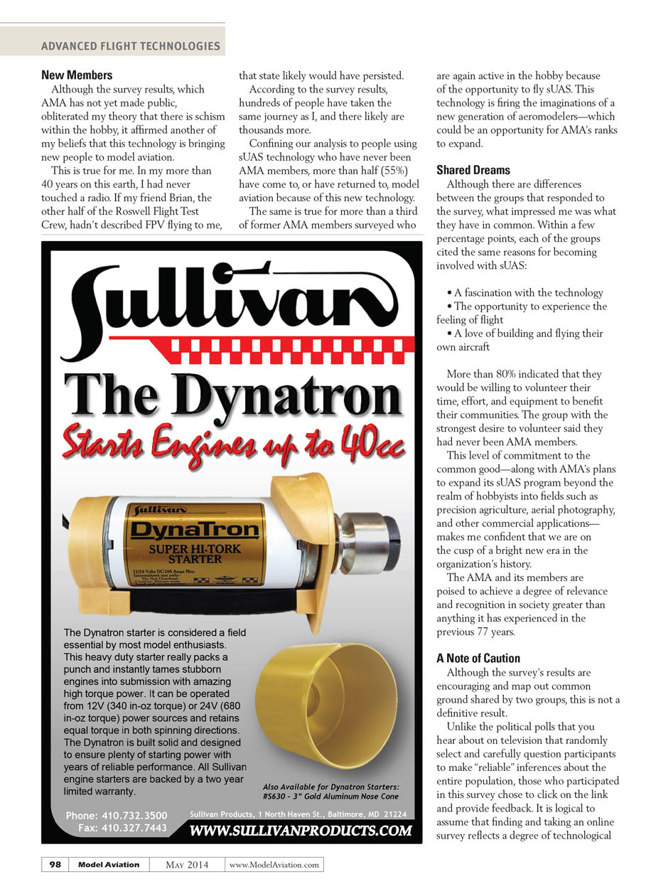 This level of commitment to the common good—along with AMA’s plans to expand its sUAS program beyond the realm of hobbyists into fields such as precision agriculture, aerial photography, and other commercial applications—makes me confident that we are on the cusp of a bright new era in the organization’s history.