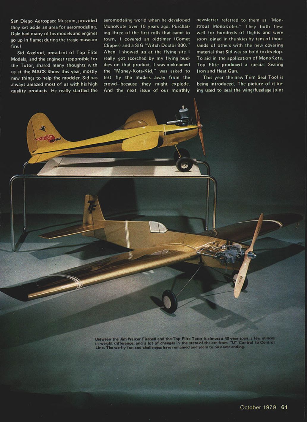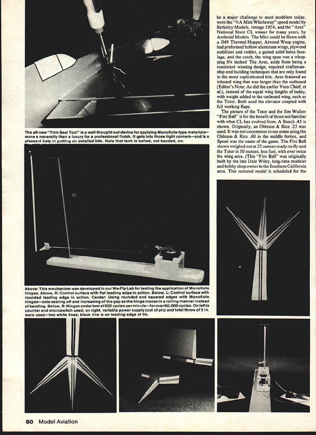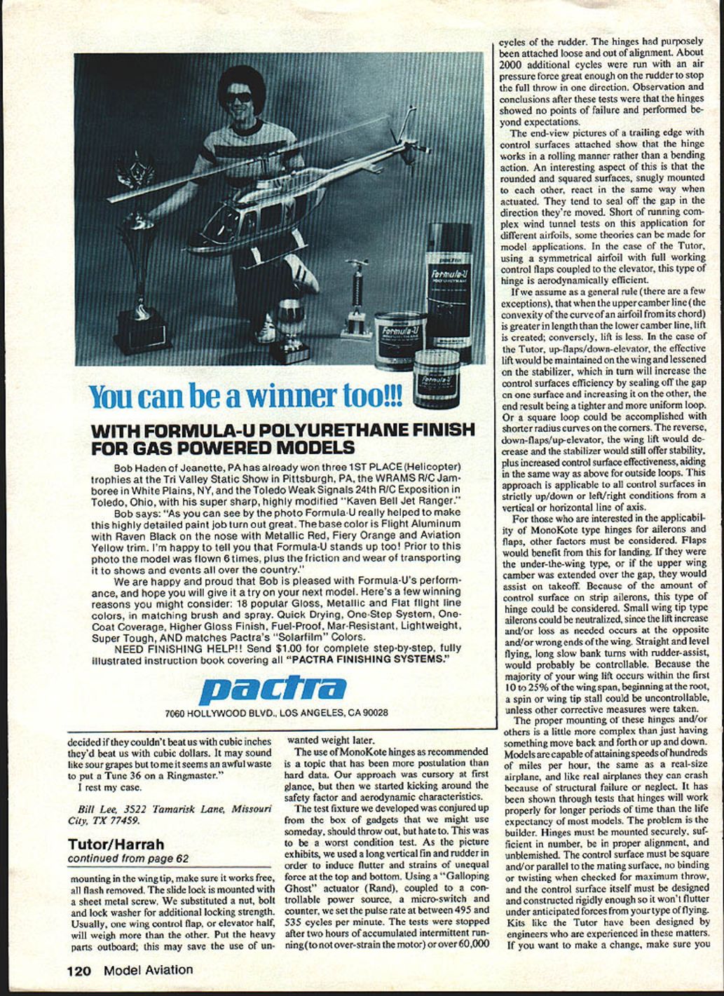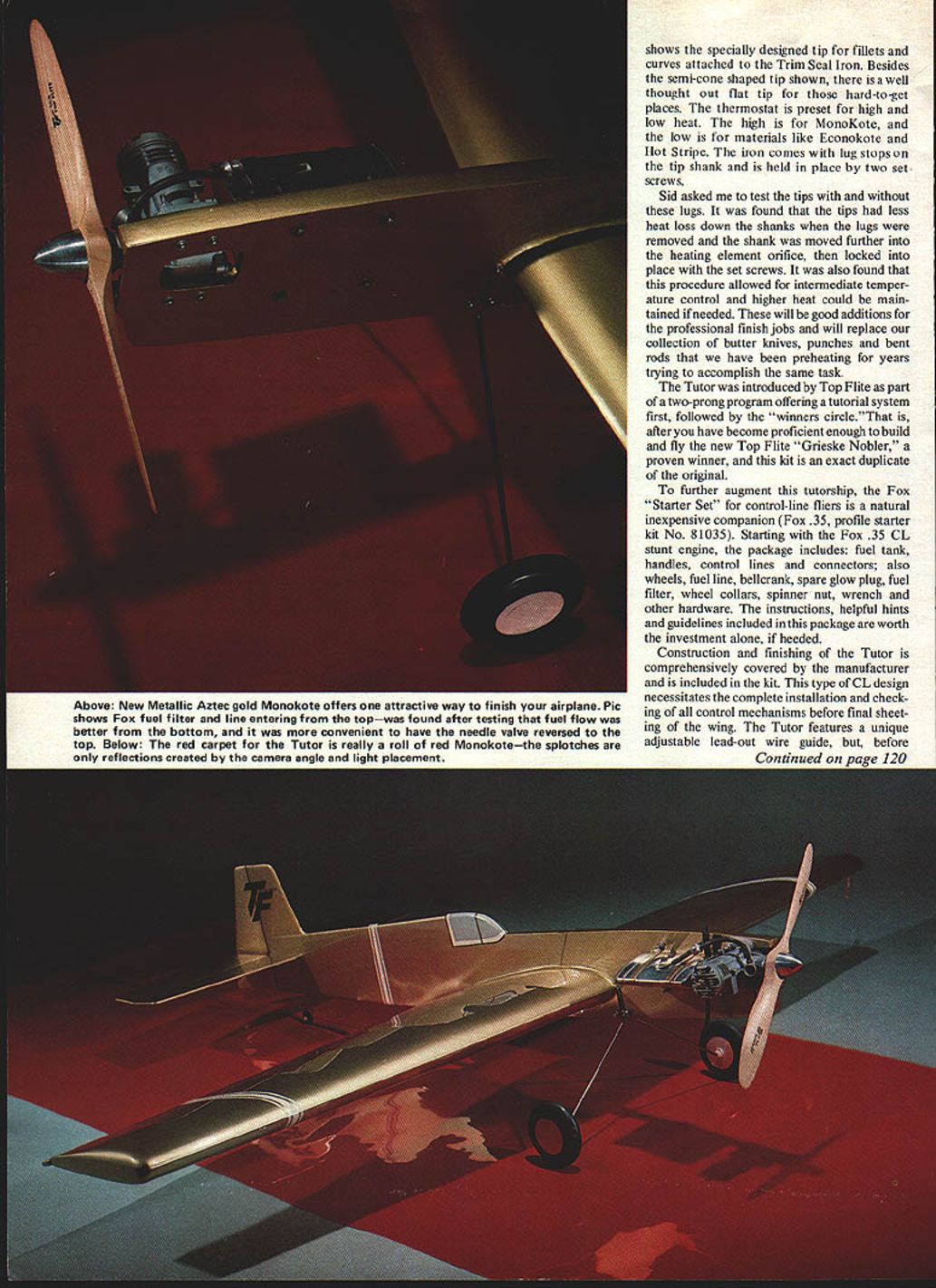 Adventures Modeling busy We-Fly-Lab comes two distinguished kits Top Flite Tutor CL Stunt Carl Goldbergs Falcon 56 MK II RC EBob Harrah PUTTING things perspective begin- ning Jim Walker creator U Control flying year 1940 U Control derived opposite Free Flight same struggles Gas-Powered Free Flight faced Rubber-Powered Free Flight including controversy surfaced compressed-air power competition gliders spite conflict state-of-the-art advance ment caused revolution among donttread-on-me modelers survived flourished now possible 14 sanctioned events can entered national competition level four international level course now called Control Line CL events names such G-Line Controliner ring awhile Historically have unique challenging developments CL facet sport couple impressive would Fox economy package Tutor make nifty flying combination package includes everything needed make machine go engine tank reelhobby shops have variety packages suit CL needs Perfect 4-oz tank installedand wheels Williams manufacturers publicity shot affords striking impression color schemes can make same airplane lookdifferent Iron-ons make man artistor artiste Tutor patterned after world championship Gieseke Noblerits lineage impeccable October1979 59 major challenge modelers today Mini Whirlaway speed model Berkeley Models vintage 1954 Ares National Stunt CL winner years Ambroid Models Mini could flown 049 Thermal Hopper Atwood Wasp engine preformed hollow aluminum wings plywood stabilizer rudder gutted solid balsa fuse lage catch wing span whop ping 8 inches Ares aside being consistent winning design required craftsman ship building techniques found sophisticated kits Ares featured inboard wing longer outboard Editors Note As did earlier Veco Chief et al instead equal wing lengths today weight added outboard wing such Tutor Both used elevator coupled full working flaps picture Tutor Jim Walker Fire Ball benefit familiar what CL has evolved Bunch 45 shown Originally Ohlsson & Rice 23 used uncommon see some using Ohlsson & Rice 60 middle forties Speed name game Fire Ball shown weighed out 32 ounces ready-to-fly Tutor 30 ounces less fuel over twice wing area Fire Ball originally built late Dale Wiley long-time modeler hobby shop owner Southern California area restored model scheduled 60 Model Aviation all-new Trim Seal Tool isa well-thought-out device forapplying MonoKote-type materials necessity luxury professional finish ge nto tight cornersand isa hL.b u-Fly-Lab fortesting application MonoKote hinges Above R Control surface fiat leading edge action Below L Control surface rounded leading edge action Center Using rounded squared edges MonoKote hingesnote sealing off increasing gap hinge moves rolling manner instead bending Below R Hinges undertest at500 cycles per minuteforover6OOOO cycles left counter microswitch used right variable power supply out plc total throw 2 two white lines black line leading edge fin NO OCR TEXT shows specially designed tip fillets curves attached Trim Seal Iron Besides semi-cone shaped tip shown isawell thought out flat tip hard-to-get places thermostat preset high low heat high MonoKote low materials like Econokote Hot Stripe iron comes lug stops tip shank held place two set screws Sid asked test tips lugs found tips less heat loss down shanks lugs removed shank moved further heating element orifice locked place set screws also found procedure allowed intermediate temper ature control higher heat could main tained needed will good additions professional finish jobs will replace collection butter knives punches bent rods have preheating years trying accomplish same task Tutor introduced Top Flite part two-prong program offering tutoril system first followed winners circleThat after have become proficient enough build fly new Top Flite Grieske Nobler proven winner kit exact duplicate original further augment tutorship Fox Starter Set control-line fliers natural inexpensive companion Fox 35 profile starter kit No 81035 Starting Fox 35 CL stunt engine package includes fuel tank handles control lines connectors also wheels fuel line bellcrank spare glow plug fuel filter wheel collars spinner nut wrench other hardware instructions helpful hints guidelines included package worth investment alone heeded Construction finishing Tutor comprehensively covered manufacturer included kit type CL design necessitates complete installation check ing control mechanisms before final sheet ing wing Tutor features unique adjustable lead-out wire guide before Continued v 120 Above New Metallic Aztec gold Monokote otters attractive way finish airplane Plc shows Fox fuel filter line entering topwas found after testing fuel flow better bottom convenient have needle valve reversed top Below red carpet Tutor really roll red Monokotethe splotches reflections created camera angle light placement Bob Haden Jeanette PA has already won three 1ST PLACE Helicopter trophies Tn Valley Static Show Pittsburgh PA WRAMS RIO Jam boree White Plains NY Toledo Weak Signals 24th RIO Exposition Toledo Ohio super sharp highly modified Kaven Bell Jet Ranger Bob says As can see photo Formula-U really helped make highly detailed paint job turn out great base color Flight Aluminum Raven Black nose Metallic Red Fiery Orange Aviation Yellow trim Im happy tell Formula-U stands up tool Prior photo model flown 6 times plus friction wear transporting shows events over country happy proud Bob pleased Formula-Us perform ance hope will give try next model Heres few winning reasons might consider 18 popular Gloss Metallic Flat flight line colors matching brush spray Quick Drying One-Step System OneCoat Coverage Higher Gloss Finish Fuel-Proof Mar-Resistant Lightweight Super Tough AND matches Pactras Solarfilm Colors NEED FINISHING HELP! Send $100 complete step-by-step fully illustrated instruction book covering PACTRA FINISHING SYSTEMS pwirn 7060 HOLLYWOOD BLVD LOS ANGELES CA 90028 decided couldnt beat us cubic inches theyd beat us cubic dollars ma
