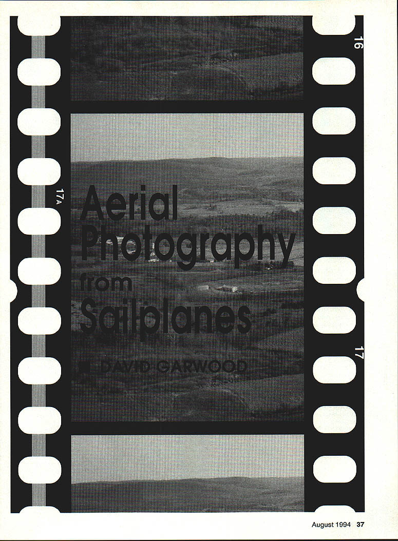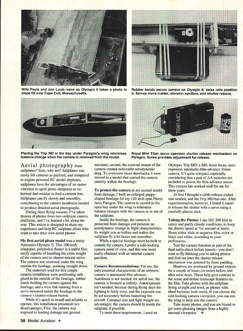 August1994 37 Aerial photography sailpianes Sure Sailpianes can easily lift cameras payload compared engine-powered RC model airplanes sailpianes have advantages no motor vibration spoil photo sharpness no burned-fuel residue foul camera lens Sailpianes can fly slowly smoothly contributing camera steadiness needed produce detailed aerial photographs During three flying seasons Ive taken dozens photos two sailplane camera platforms Ive learned bit along way article designed share experience help RC sailplane pilots want take own aerial photos first aerial-photo model trusty Airtronics Olympic II 100-inch wingspan polyhedral floater stable flier easily capable handling extra weight camera its shutter-release servo camera mounted under wing outside fuselage pointing straight down materials used simple camera installation positioning rails glued outside fuselage rubber bands holding camera against fuselage wire link running servo mounted inside fuselage cameras shutter-release button its quick install reliable operate installation presented two disadvantages First camera exposed landing damage ground moisture second external mount camera created noticeable aerodynamic drag overcome drawbacks soon moved model carried camera entirely within fuselage protect camera second model damage built enlarged guppyshaped fuselage 120-inch span Pierce Aero Paragon camera carried open bay under wing minimize balance changes camera out sailplane Inside fuselage camera protected damage presents no aerodynamic change flight characteristics Its weight acts ballast makes sailplane fly bit faster smoother special fuselage must built contain camera prefer side-looking camera point view easily obtained internal camera position Camera Recommendations essential characteristic airborne camera automated film advance Autofocus needed aerial use camera focused infinity Autoexposure isnt needed because during flying days lighting fairly exposure can set accurately before launching aircraft Compact size light weight advantages camera should fit inside sailplane possible meet requirements used Olympus Trip MD $60 fixed-focus autoexposure automatic-film-advance 35mm camera Its quite compact especially considering pair AA batteries included power film-advance motor camera has worked well three years first thought cable-release socket needed Trip MD has After experimentation however found easier release shutter servo using carefully placed stick Taking Photos use ISO 200 film sunny partly cloudy conditions keep shutter speed 1/250 second faster Shoot either slide negative film color black white according preferences Test camera function part final radio check before launchyou dont want fly thinking youre taking photos find out later shutter release mechanism jammed foam padding Shadows produced ground objects couple hours before after solar noon help give contrast scene define landscape features film Take photos sailplane flying straight level photos tilted horizons look weird choose side-looking camera viewpoint can use wing help aim camera Take photos bound get some pleasing images highly unusual viewpoint odel Aviation Paula son Louis wave Olympic Il takes photo Rubber bands secure camera Olympic II balsa rails position slope lift over Cape Cod Massachusetts Servos move rudder elevator spoilers shutter release Placing Trip MD bay under Paragons wing minimizes balance change camera removed model Royal Mini Titan servo operates shutter release mechanism Paragon Screw provides adjustment release