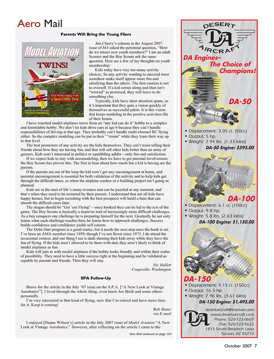 I enjoyed [Duane Wilson’s] article in the July 2007 issue of Model Aviation “A New