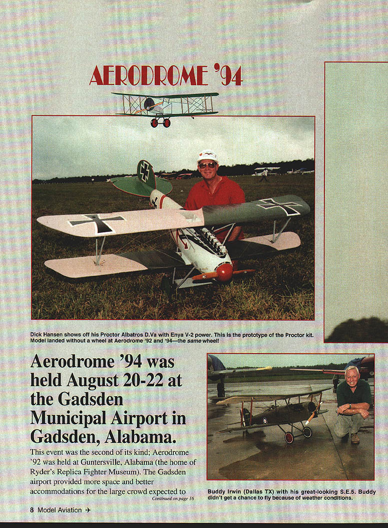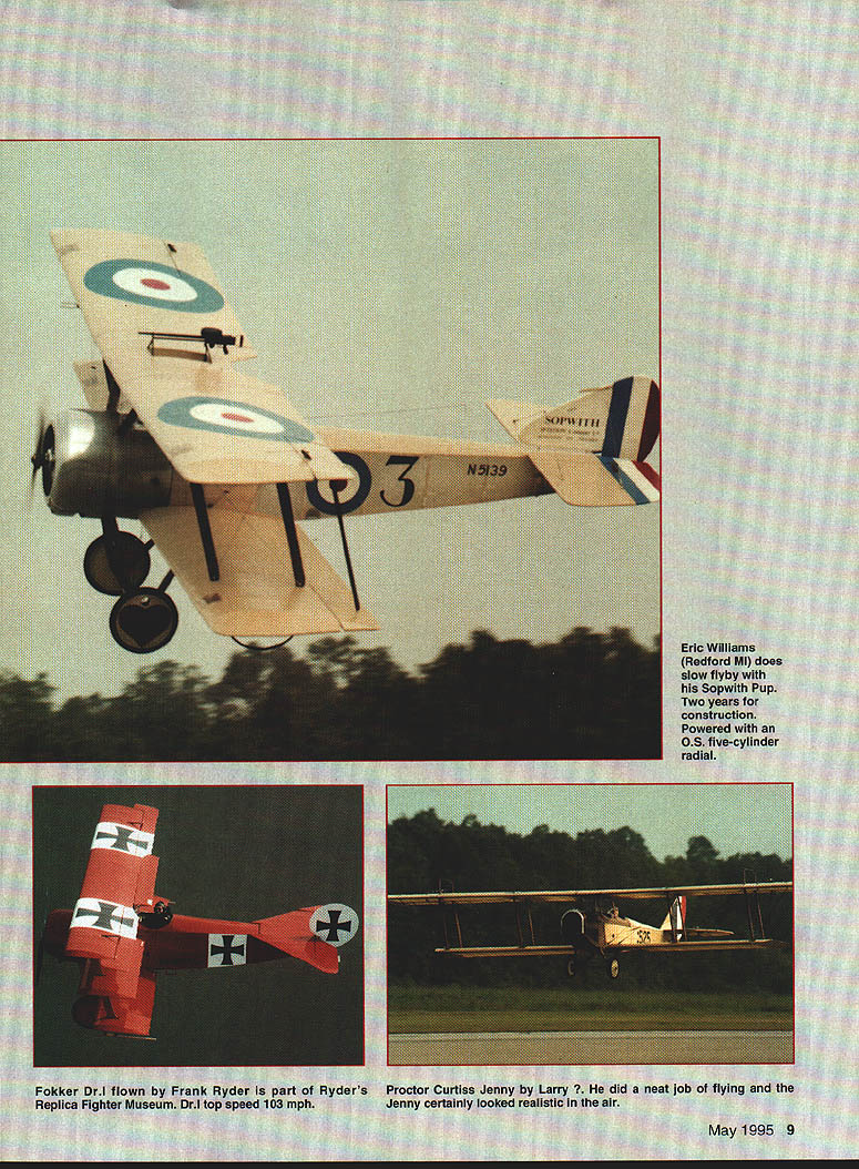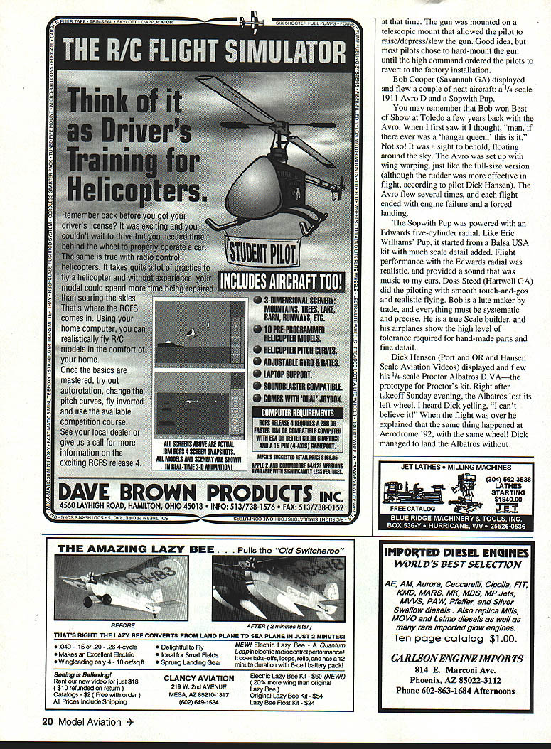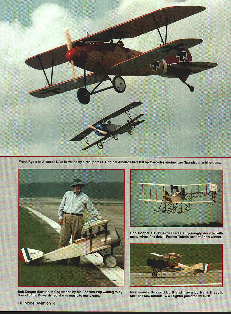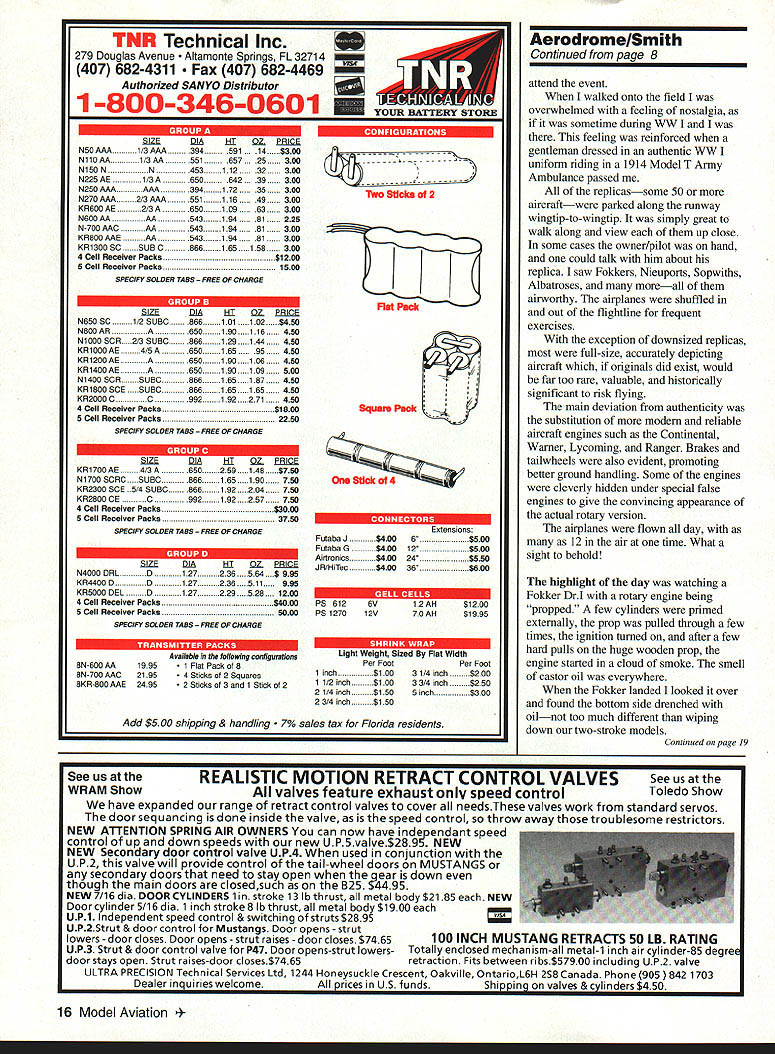NO OCR TEXT NO OCR TEXT NO OCR TEXT NO OCR TEXT TNR Technical Inc 279 Douglas Avenue monte Springs FL 32714 407 682-4311 407 682-4469 YSTI Authorized SANYO Distributor 1-800-346-0601 — SIZEDIAidIOZBJE N5OAAA 1/3AAA394 591.14$300 N110AA1/3AA551 65725300 NiSON 3112300 N225AE A650 642..39300 N250 AM AM394172 35300 N27OAAA2/3AAA551116 49300 KR600AE 213A650109300 N600AA AA543194 81225 N-700AAC AA543194 81300 KR800AAE AA543194 81300 KR1300SCSUBO866165158300 4 Cell ReceiverPacks$1200 5 Cell ReceiverPacks1500 SPECIFY SOLDER TABS FREE OF CHARGE SIZEDIAdiDZEBAE N6SOSC 2SUBC 6 101102$450 N800AR 116 . 450 NiOQO 5CR. 2/3 SUEC 6129144450 KR1000AE 5A65016595450 KR1200AE.. A650190106450 KR1400AE . 190109500 N1400 5CR C866165187450 KR1800SCE. SUBO866165165450 KR2000 C C992192271450 4 Cell Receiver Packs$1800 5 Cell Receiver Pecks2250 SPECIFY SOLDER TABS FREE OF CHARGE SIZEDIAdi DZ ACE KR1700AE 3A650259.. 148$750 N1700SCRC 866165. 190750 KR2300 5CE 5/4SUBC866192 50 KR2800 CE .. C192 50 4 Cell Receiver Packs$3000 5 Cell Receiver Packs3750 SPECIFY SOLDER TABS FREE OF CHARGE DIAHIDZ EB1E N4000 DAL0127236 $995 KR4400 DD236 511995 KRSOO0 DELD1 27229 .1200 4 Cell Receiver Packs $4000 5 Cell Receiver Packs 5000 SPECIFY SOLDER TABS FREE OF CHARGE 8N-600AA1995 8N-700 AAC2195 8KR-800 AAE2495 Available following configurations 1 FIat Pack 8 4 Sticks 2 Squares 2 Sticks 3 1 Stick 2 Thvo Sticks 2 lat Pack Square Pack Sit Extensions Fut abs I$4 006$500 Futaba 6$400 12$500 Airtronics$400 24$550 JR/HiTec$400 36$800 PS 6126V12AH$1200 PS 127012V7OAH$1995 Light Weight Sized Flat Width Per FootPer Foot 1 inch$10031/4 inch$200 11/2 inch$10033/4 inch$250 21/4inch$150Sinch$300 23/4 inch$150 Add $500 shipping & handling 7% sales tax Florida residents AerodromelSmith Continued page 8 attend event walked onto field overwhelmed feeling nostalgia sometime during WW I feeling reinforced gentleman dressed authentic WV uniform riding 1914 Model T Army Ambulance passed replicassome 50 aircraftwere parked along runway wingtip-to-wingtip simply great walk along view up close some cases owner/pilot hand could talk him about replica saw Fokkers Nieuports Sopwiths Albatroses moreall airworthy airplanes shuffled out flightline frequent exercises exception downsized replicas full-size accurately depicting aircraft originals did exist would far too rare valuable historically significant risk flying main deviation authenticity substitution modem reliable aircraft engines such Continental Warner Lycoming Ranger Brakes tailwheels also evident promoting better ground handling Some engines cleverly hidden under special false engines give convincing appearance actual rotary version airplanes flown day 12 air time What sight behold highlight day watching Fokker DrI rotary engine being propped few cylinders primed externally prop pulled through few times ignition turned after few hard pulls huge wooden prop engine started cloud smoke smell castor oil everywhere Fokker landed looked over found bottom side drenched oilnot too much different wiping down two-stroke models Continued page 19 16 Model Aviation usatthe REALISTIC MOTION RETRACT CONTROL VALVES Seeusatthe WRAM ShowAll valves feature exhaust speed controlToledo Show have expanded range retract control valves cover needsThese valves work standard servos door sequancing done inside valve speed control throw away troublesome restrictors NEW ATTENTION SPRING AIR OWNERS can now have inde5pendant speed control up down speeds new UP5valve$289 NEW Secondary door control valve UP4 used conjunction wIth UP2 valve will provide control tail-wheel doors MUSTANGS secondary doors need stay open gear down though main doors closedsuch B25 $74495 NEW 7/16 dia DOOR CYLINDERS un stroke 13 lb thrust metal body $2185 NEW Door cylinder 5/16 dia 1 inch stroke 8 lb thrust metal body $1900 UP1 Independent speed control & switching struts $2895 UP2Strut & door control Mustangs Door opens strut lowers-doorcloses Dooropens-strutraises-doorcloses$7465 100 INCH MUSTANG RETRACTS 50 LB RATING UP3 Strut & door control valve P47 Door opens-strut lowers-Totally enclosed mechanism-all metal-i inch air cylinder-85 degre door stays open Strut raises-door closes$7465retraction Fits between ribs$57900 including UP2 valve ULTRA PRECISION Technical Services Ltd 1244 Honeysuckle Crescent Oakville OntarioL6H 2S8 Canada Phone 905 1703 Dealer inquiries welcomeAll prices US fundsShipping valves & cylinders $450 Aerodrome/Smith Continued page 16 afternoon chance ride J-3 Cub some air-to-air photography fortune enough get good shot Roy McCaldin Tucson AZ 70% size DH4 Roy built replica several years ago microfilm copies original plans obtained Smithsonian Museum Washington Unmanned Aircraft RC contingent Aerodrome 94 headed up Hank Iltzsch Seekonk MA RCers given one-hour time slot fly morning hour evening however weather conditions prevented Saturday evening Sunday morning flights Weather grounded entire event 24 hours some greatlooking RC WW models flown displayed during better weather conditions Eric Williams Redford MI flew Sopwith Pup Pup Balsa USA kit modifications added give scale features contribute realism see photos took two years build Pup powered OS fivecylinder radial weighs 30 pounds covered Coverite Super Shrink workmanship exquisite Pup flew quite realistically Dick Parshall Holcomb NY displayed Airco/de Havilland DH2 unable fly Dick purist Scale builders researches models no end can tell fine detail about fittings airplane hand-made including 71 turnbuckles rigging Airco powered Quadra 35 pusher configuration required special driveshaft Dicks airplane weighs 21 pounds needs dummy engine detail complete full-size airplane first true Allied fighter WW ate Eindeckers breakfast Lewis 303 machine gun mounted front no prop shoot through gave distinct advantage MAD Power Rev RIC Engine Treatment 50-01 after run oil 2 4 cycle R/G engines few drops after day operation makes run cooler faster last much longer less maintenance L [VENOMOUS TI