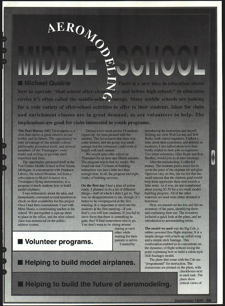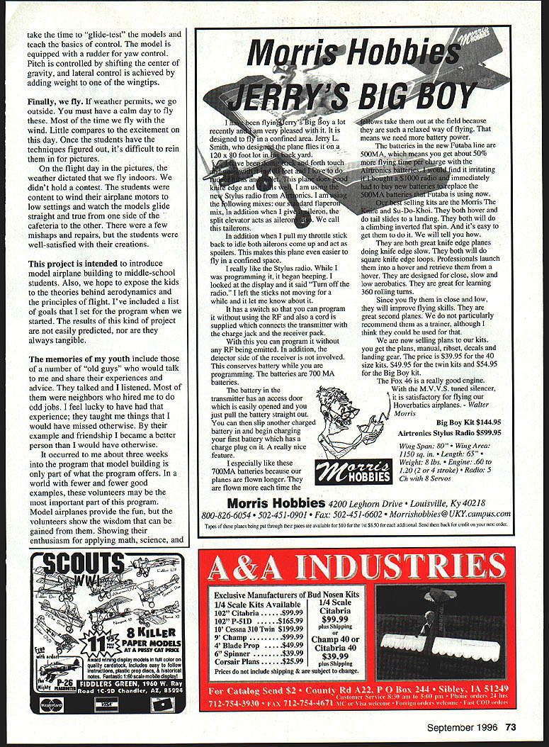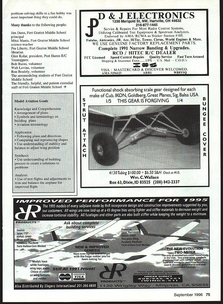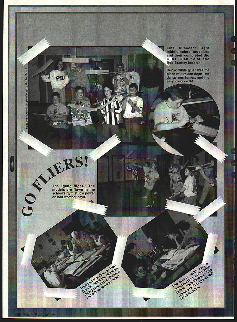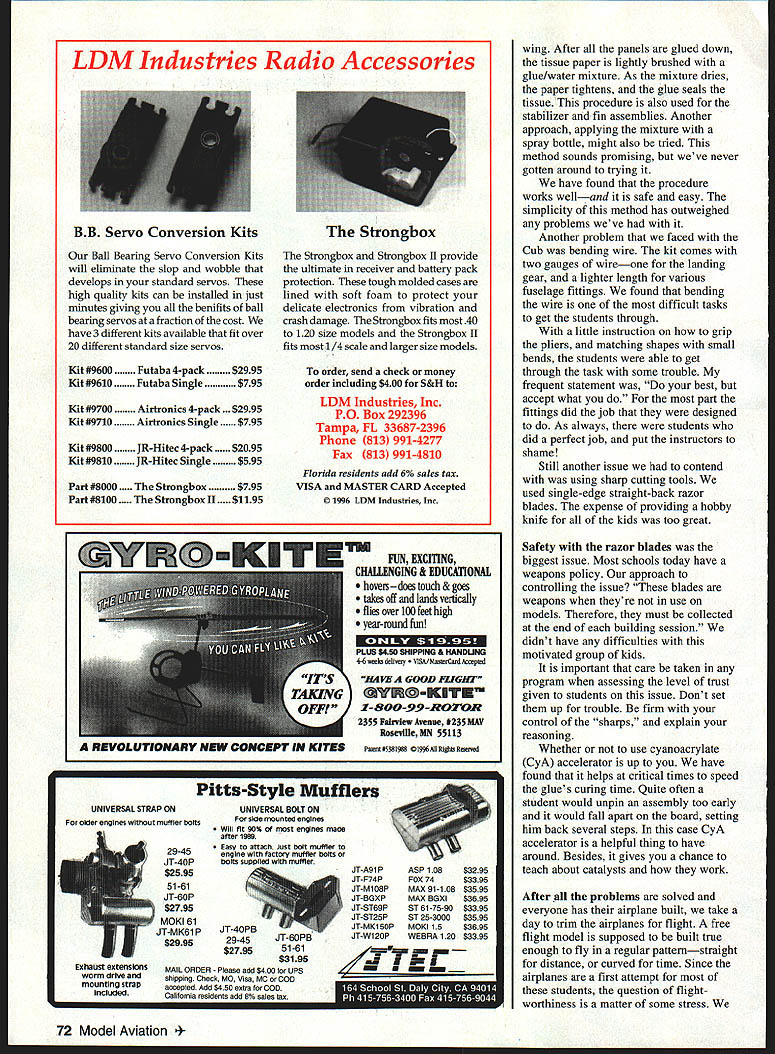 NO OCR TEXT U Volunteer programs Analog/Digital Inputs erature 32/485 Variometer h/Roll sure ine tude Voltage d o OPS Antenna Systems ifiers very Parachutes Links Loggers GUI Cockpit Display Software Modems rnal Auto Pilots lete Ground Stations Tracking Antennas complete source reliable accurate affordable wireless data acquisition products Only 1mm Aero Telemetry ader portable telemetry technology Military commercial racing applications Fully integrated systems available immediate delivery $1195 Visit us ut hffpY/wwwluinetcom/aerotelemetry Aluminum alloy tubing plug-in wings Includes special slip-fit phenolic sockets build wing panels Special lengths order 7/16 dia x 2 ft precision fit sockets$695 5/8 dia x 2 ft precision fit sockets$1095 7/8 dia x 2 ft precision fit sockets$1195 1-1/4diax2 ft$995 1-1/2 dia x 3 ft$1495 PLUG-IN ADJUSTABLE STAB KIT Now can optimize stab incidence best flight characteristical pair glass-filled nylon adjusters included provide simple quick micro screw adjustment smaller front stab tube Main tube alloy aluminum matching phenolic socket Complete Package$995 PLUG-IN WING ADJUSTER KIT New IIImproved Wing Adjuster Very Ii]/J\strong rigid w also light JJJN~17T eight Use two adjusters wing panel key panel fuselage allowing quick accurate alignment straight flight 4-Pack both wing panels $1295 GLASS CLOTH 7 oz/Sq Yard Fastest Filling Closest Weave Lightest Finished Weight Includes Detailed Instructions Big 3 Square Yard Pkg$895 R3713 Pompano Drive Pensacola FL 32514 GAl v Phone 904 494-0203 RIC Products Inc VlSAlMasterCard Welcomed $450 per item S&H esejents add 6% Tax several assemblies Some views require interpretation instructor students gain experience plans become easier follow program started checkboxes students showed instructors performed step instructor would check off task As students learned about read plans apply directions dropped check-off requirement allowed students grasped building techniques move ahead eventually join instructors helping other students found students enjoyed helping other feeling competency opportunity rethink what theyve already done good kids Eventually two other volunteers Ron Glen joined program brought own experience approaches model building gentlemen showed enthusiasm patience really ingratiated students During three years club has sponsoring Cub building program problems associated building airplanes have solved example using airplane dope cover wing tissue prohibitive Dope highly volatile causes dangerous fumes its recommended use teenagers closed classroom solution use white glue thinned water First panel tissue cut size bead unthinned white glue run around wing framework spread out fingertip covering can laid over framework rubbed lightly contacts white glue glue dries quickly covering bonded Worlds Best LASER CUT KITS RUBBER POWERED FF SCALE ldt tea fures Ikiest LASER CUT BALSA Contest Rutter Conufer Drawn Plans Complete Hardi, Pack AuthentIc Full Color Wateislide Decals Real Colored TIssue Complete InstructIons Please check local hobby dealer ftrsL kite avaIlable better hobby shops around world Catalog $200 Add $450 shipping kit Overseas cyders add 20% FL residents add 6% sales tax Made USA Lferr Engineering Corp 1431 Chaffee Dr SuIte 3 TituevIlle FL 32780 407 264-2488 worlds leader Laser Cut model aircraft M5 Daler Inquires invited 70 Model Aviation R Transmitter Up toll Channels 6 oz 11 unaneei Huodheld Receiver WING TUBE AND SOCKET SETS LDM Industries Radio Accessories Ball Bearing Servo Conversion Kits will eliminate slop wobble develops standard servos high quality kits can installed just minutes giving benifits ball bearing servos fraction cost have 3 different kits available fit over 20 different standard size servos Kit #9600Futaba 4-pack$2995 Kit #9610Futaba Single$795 Kit #9700 tronics 4-pack . $2995 Kit #9710 tronics Single Kit #9800JR-Hitec 4-pack$2095 Kit #9810JR-Hitec Single$595 Part #8000 ngbox 95 Part #8100 ngbox II$1195 UNIVERSAL STRAP ON older engines muffler bolts 11 29-45 JT-40P $2595 51-61 JT-60P $2795 MOKI 61 JT-MK61 P $2995 xh8ust extensIons worm drIve mountIng Stral Included Strongbox Strongbox II provide ultimate receiver battery pack protection tough molded cases lined soft foam protect delicate electronics vibration crash damage Strongbox fits 40 120 size models Strongbox II fits 1/4 scale larger size models order send check money order including $400 S&H LDM Industries Inc PO Box 292396 Tampa FL 33687-2396 Phone 813 991-4277 Fax 813 991-4810 Florida residents add 6% sales tax VISA MASTER CARD Accepted 1996 LDM Industries Inc Pitts-Style Mufflers UNIVERSAL BOLT ON side mounted engines Will fit 90% engines made after 1989 5 1-61 $3195 MAIL ORDER Please add $400 br UPS shipping Check MO Visa MC COD attepied Add $450 esira br COD Calilornia residenis add 8% sales lax C JT-A91 PASP 108$329S JT-F74PFOX 74$33 95 JT-M108PMAX 91-108$3595 JT-BGXPMAX BGXI$3695 JT-ST69PST 61-75-90$33 95 JT-5T25PST 25-3000$35 95 U JT-MK15OPMOKI 15$3695 JT-W12OPWEBRA 1 20$3395 wing After panels glued down tissue paper lightly brushed glue/water mixture As mixture dries paper tightens glue seals tissue procedure also used stabilizer fin assemblies Another approach applying mixture spray bottle might also tried method sounds promising weve never gotten around trying have found procedure works welland safe easy simplicity method has outweighed problems weve Another problem faced Cub bending wire kit comes two gauges wireone landing gear lighter length various fuselage fittings found bending wire difficult tasks get students through little instruction grip pliers matching shapes small bends students able get through task some trouble frequent statement best accept what part fittings did job designed As always students did perfect job put instructors shame Still another issue contend using sharp cutting tools used single-edge straight-back razor blades expense providing hobby knife kids too great Safety razor blades biggest i