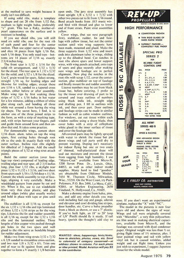 earlier Aeronca Chief about 1200 built between 1938 1942 todays standards Aeronca K somewhat underpowered Most produced Aeronca E-l 13 twocylinder horizontally-opposed aircooled engine 40 hp though little engine very reliable surely did vi brate airplane also available later 1937 smoother running four-cylinder Continental A-40 few years ago found 3-view fac tory drawing Aeronca K just about right size use building light indoor rubber-powered scale model spite small stabilizer very short nose moment might cause trouble built anyway fear unfounded because say flew right off drawing board making flights minute plus However necessary enlarge horizontal tail surface slightly landing gear lengthened bit accommodate 7-in diameter propeller Except deviations model scale 23/32 equals 1 ft giving wing span 25 7/8 Construction Begin laying side view fuse lage flat surface can easily push straight pins Anchor drawing surface pieces scotch tape like prevent parts sticking drawing start gluing cover clear thin plastic Saran wrap will waxed paper Use 1/16 sq fairly hard balsa longerons uprights Di agonal bracing can 1/32 x 1/16 medium balsa 1/32 sq want go out lightness Cement joints favorite glue go easytoo much adds weight Build second side right top first waiting cover glued joint first side small piece same type film used cover drawing Joining two fuselage sides perfect alignment can difficult sometimes experienced builder First glue two tail posts together station 10 aligning two sides over top view glue top bottom cross-pieces Sta 5 let dry thoroughly cabin sides rather curved Therefore previously glued joints complete ly dry will easier dampen wood ahead Sta 5 before bending simply hold parts curved under faucet However used water soluble glue better try continued page 78 Top When newnow 5-1/2 years oldthe K ultra light weight good 90 seconds Left assembling struts half wing panels can quickly attached removed travel details show clearly photo directly above does center section construction two dowel ends jutting side slide wing holes Model pix rebuilt after another in-flight model fell lightly doped yellow black trim lines Photos John Sites CL Navy Carrier continued page 28 modelers now receiving rules infor mation part services magazine should know what happening events Get views CLCB Ad visory Committee representatives NATS way excellent opportunity direct contact representative contest hoards advisory committees Colors Markings fact appropri ate paint schemes markings required Carrier models Profile included should come no surprise information appro priate paint markings hard find some areas make information available need will section column next few months will follow development US Navy coloring markings Since have numerous color schemes used US Navy aircraft over years Carrier events should never suffer lack variety Before WW Navy no standardized paint scheme no established US national marking internationally rec ognized US entry war standardized national marking necessary standard camouflage paint adopted Navy aircraft color used initially designated stone grey used entire aircraft 1920 color replaced silver parts aircraft except metal areas remained grey lighter shade grey troduced 1930 replaced six years later silver adopted basic color Navy aircraft color persisted until approach WW II camouflage again came desirable During period starting mid-1920s upper surfaces wing horizontal tail air craft painted chrome yellow aid vis ibility first standardized national marking car ried Navy aircraft red white blue star emblem shown drawing emblem carried both sides upper TRY SCALE ACCESSORIES KITS INE GUN KITS ENGINE KITS & CYLINDERS PILOTS LS PROPS & HANGERS SPINNERS INGS CANOPIES K COWLS ASK FOR OUR PRODUCTS AT YOUR DEALER OR SEND 25 FOR OUR CATALOG WILLIAMS BROSDEPT M 181 PAWNEE ST SAN MARCOS CA 92069 AMA NUMBERS TO MATCH AMA LETTERS 21/2 AND 15/5 TWO SETE--$175 FOUR EETE--$3 00 FROM MONTGOMERY SIGNS 409 STONESTREET AVENUE ROeRVILLE MO 20850 lower surfaces wings sup plemented vertical blue white red stripes rudder blue stripe appearing forward stripe standardize US markings allies Navy adopted roundel mark ing consisting white center blue inner ring red outer ring same time order tail stripes reversed red stripe forward blue stripe aft Following WW markings reverted hack original star tail stripes markings continued use until beginning WW II although tail stripes gradually replaced solid color tails used identify particular units next installment will cover some variations appeared during WW 11 New Products accompanying photo new throttle bellcrank put out G-S Prod ucts Corp Intl PO Box 488 La Grande Ore 97850 U-S bellcrank quite strong should handle heaviest Class II ship no fear bending anything having unit hind up bellerank operates very smoothly has throttle arm movement 1 1/4 inches about 50 percent Roberts unit bellcranks come both upright inverted units either short long elevator belleranks giving total four combinations choose photo shows short upright version As can see elevator control arm re versed forward line up line elevator horn mounted below elevator throttle arm shaped allow use clevis type connector terference problems U-S Products will also market handle go bellerank unit U-S handle required take full advantage full throttle range U-S bellerank hut bellerank can used Roberts handle will still give about 25 percent throt tle movement Roberts bellerank price bellerank $495 handle $995 units should available time read Aeronca K continued page 31 damp place structure over top view bend two sides match draw ing Block pin structure place add remaining cross pieces 1/16 sq Cut Sta 2 former instrument panel Sta 3 1/16 sheet glue place space between Sta 2 & 3 covered light weight 1/32 sheet preferably 1/64 have wood grain should run fore aft direction Add re maining diagonal braces top bottom Carve upper nose piece soft balsa block about 3/4 x x /2 hollow out about 3/32 thick Dont