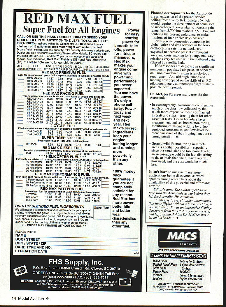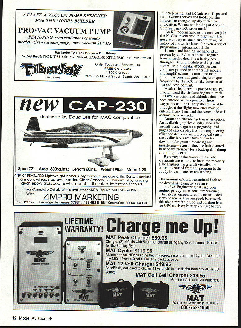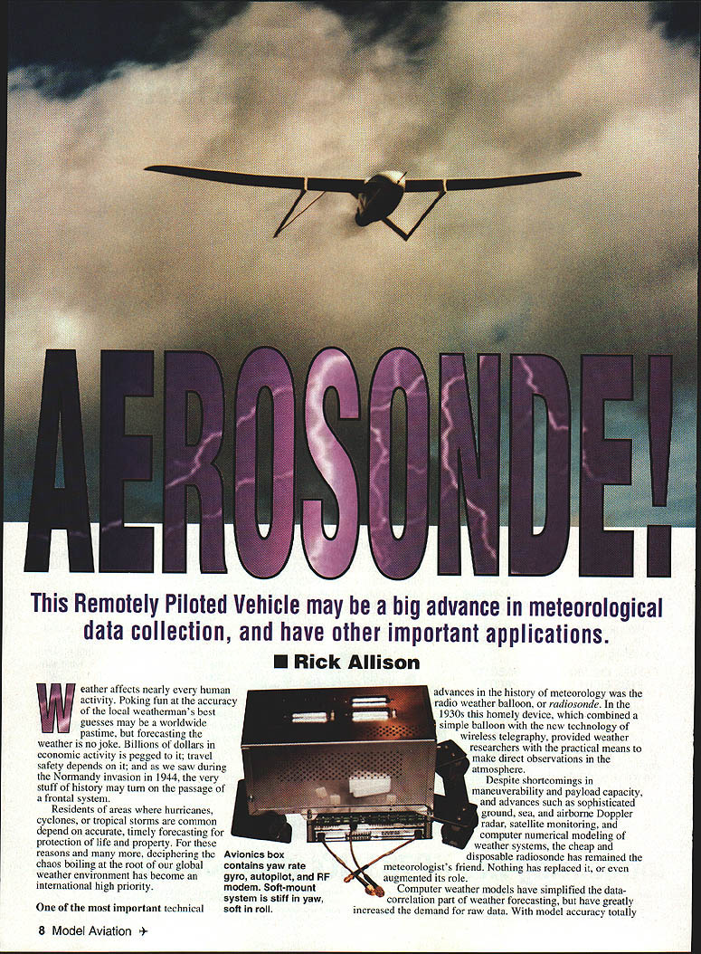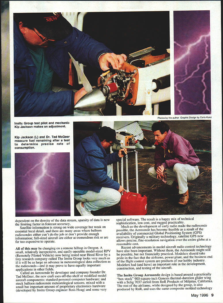 This Remotely Piloted Vehicle may big advance meteorological data collection have other important applications U Rick Allison eather affects nearly human activity Poking fun accuracy local weathermans best guesses may worldwide pastime forecasting weather no joke Billions dollars economic activity pegged travel safety depends saw during Normandy invasion 1944 very stuff history may turn passage frontal system Residents areas hurricanes cyclones tropical storms common depend accurate timely forecasting protection life property reasons deciphering chaos boiling root global weather environment has become international high priority Avionics box contains yaw rate gyro autopilot RF modem Soft-mount system stiff yaw important technical soft roll advances history meteorology radio weather balloon radiosonde 1930s homely device combined simple balloon new technology wireless telegraphy provided weather researchers practical means make direct observations atmosphere Despite shortcomings maneuverability payload capacity advances such sophisticated ground sea airborne Doppler radar satellite monitoring computer numerical modeling weather systems cheap disposable radiosonde has remained meteorologists friend Nothing has replaced augmented its role Computer weather models have simplified data correlation part weather forecasting have greatly increased demand raw data model accuracy totally 8 Model Aviation ndent density data stream sparsity data now limiting factor forecast accuracy Satellite information strong wide coverage weak essential local detail areas balloon radiosondes either cant job dont provide enough information full-sized aircraft either tremendous risk far too expensive operate may changing remote hilltop Oregon small relatively inexpensive easily operable model-sized RPV Remotely Piloted Vehicle now being tested near Hood River tiny research company called Insitu Group looks very much will large advance meteorological data collection radiosondeand may prove have equally important applications other fields Called Aerosonde developer company founder Dr Tad McGeer new craft uses off-the-shelf modified model aircraft components standard personal-computer hardware stock balloon radiosonde meteorological sensors mixed small important amount proprietary electronics hardware developed Insitu Group engineer Ross Hoag some very special software result happy mix technical sophistication low cost rugged practicality Much development early radio made radiosonde possible Aerosonde has become feasible result availability commercial Global Positioning System GPS receivers Originally military technology satellite GPS now allows precise fine-resolution navigation over entire globe reasonable cost Recent advancements model aircraft radio control technology have also important Without Aerosonde might still possible financially practical Modelers should take pride fact airframe power plant business end flight control system products hobby industry Modelers have important role development construction testing aircraft Insitu Group Aerosonde design based around practically box stock 900-square-inch Genesis thermal-duration glider wing Selig 7037 airfoil RnR Products Milpitas California rest airframe designed group also produced RnR uses same composite molded technology May1996 9 lnsitu Group test pilot mechanic Kip Jackson makes adjustment Kip Jackson L Dr Tad McGeer measure fuel remaining after test determine precise rate consumption Photos autho nhi flinn hv flarla Kunz pioneered company configuration twin-boom pusher inverted V-tail allows correct weight distribution relatively heavy fuel avionics payload provides all-important sensors up front clear air work operational weight range 16-26 pounds depending fuel load avionics package Aerosonde has kept small practical small scale allows airframe extremely robust largeaircraft standards important because primary missions will storm penetration reconnaissanceup including cyclones hurricanes Insitu means site hoped turbulence would shred ordinary airplane will prove little barrier Aerosonde although occasional losses due icing expected use standard RC model components existing hobby industry expertise manufacturing capability means per-unit cost Aerosonde can kept very low RPV standards purchased reasonable quantities may cost little $10000 per copy including standard avionics package projected lifespan 1000 flight hours would mean amortized operating costs approximately $100 per houran astonishing figure type data collection low price means airplane can considered consumable resource cheap enough sent harms way sometimes lost national weather services research scientists will use rather expensive item capital equipment must risked sturdy compact Aerosonde requires no undercarriage can easily launched catapult simple cartop carrier belly landed small field reasonably competent RC pilot pusher power plant substantially modified Enya 1 20R running 100 lowlead avgas economy purposes no lubricant mixed fuel engine oiling accomplished small tank unique gravity feed/check-valve oilrecycling system direction engine rotation has reversed allow regular tractor props used pusher configuration Walbro WT332 carburetor used custom intake manifold custom-made inflight mixture control Both throttle mixture servos mounted directly carburetor small 30-volt brushless generator modified electric RC car can motor turned engine drive washer belt-and-pulley arrangement capacitive discharge ignition system C&H Electronics paired custom ignition-timing system provide spark custom-made six-liter bladder tank Aerotech Labs completes setup Power output goodabout 900kW 1 HP 6000 rpm stock APC 20 x 8 propbut isnt amazing part Insitu Group chief test pilot mechanic longtime modeler AMA member Kip Jackson has developed custom systems fine-tuned Enya its associated hardware produce rock-solid tick-over idle 1500-1600 rpm instantaneous no-stumble transition full power unbelievably low opera