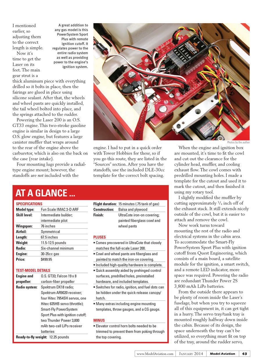 Radio system: Spektrum DX18 radio; Spektrum AR9020 receiver; four Hitec 7954SH servos, one Hitec 635HB servo (throttle); Smart-Fly PowerSystem Sport Plus with ignition cutoff; two Thunder Power 3,800 mAh two-cell LiPo receiver batteries