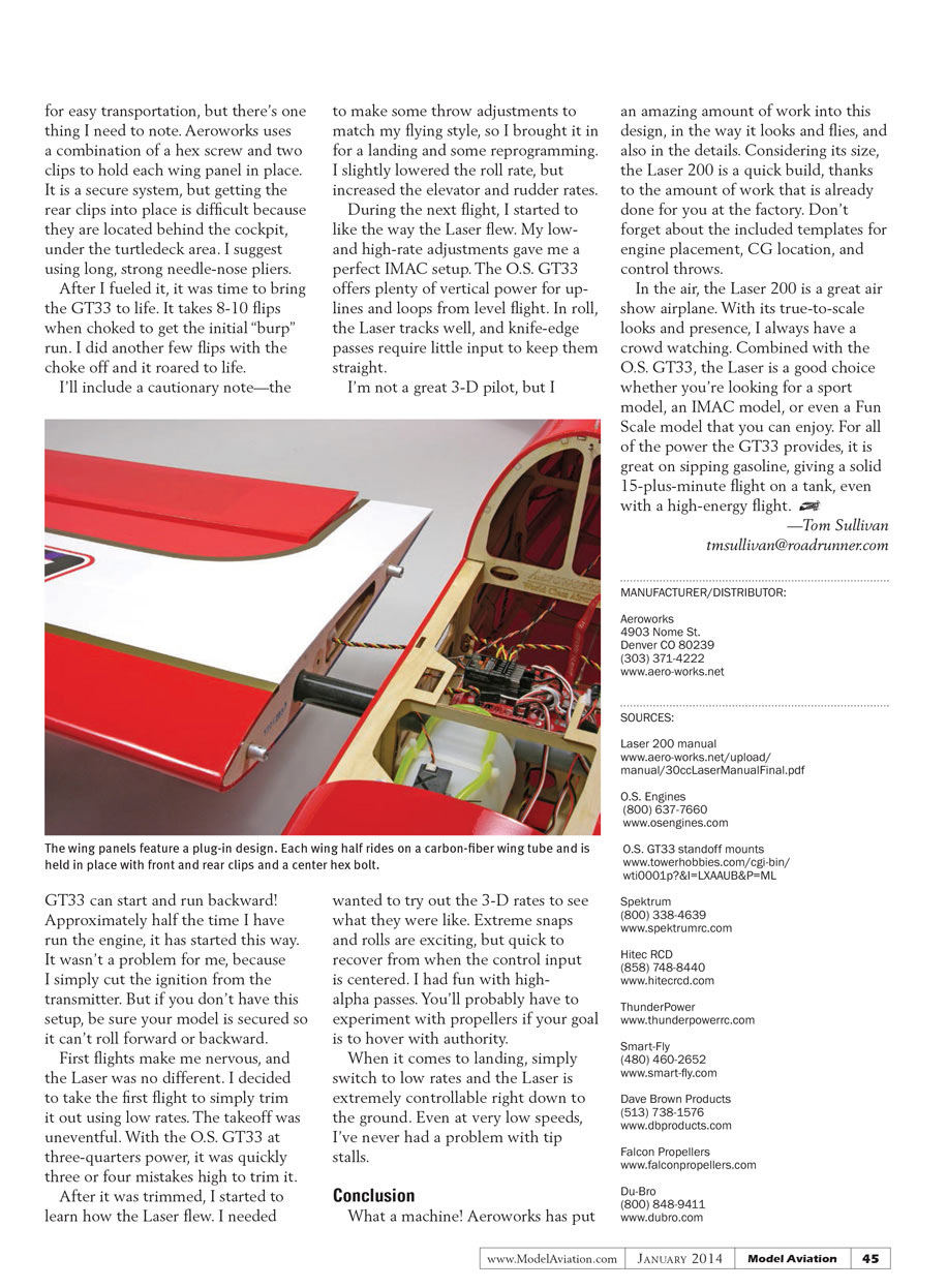 With a low parts count and much of the work done at the factory, the Laser 200 assembles quickly. I’ll touch on a few steps here, but to see all that’s involved, download the manual from the AeroWorks website, listed in the “Sources” section.