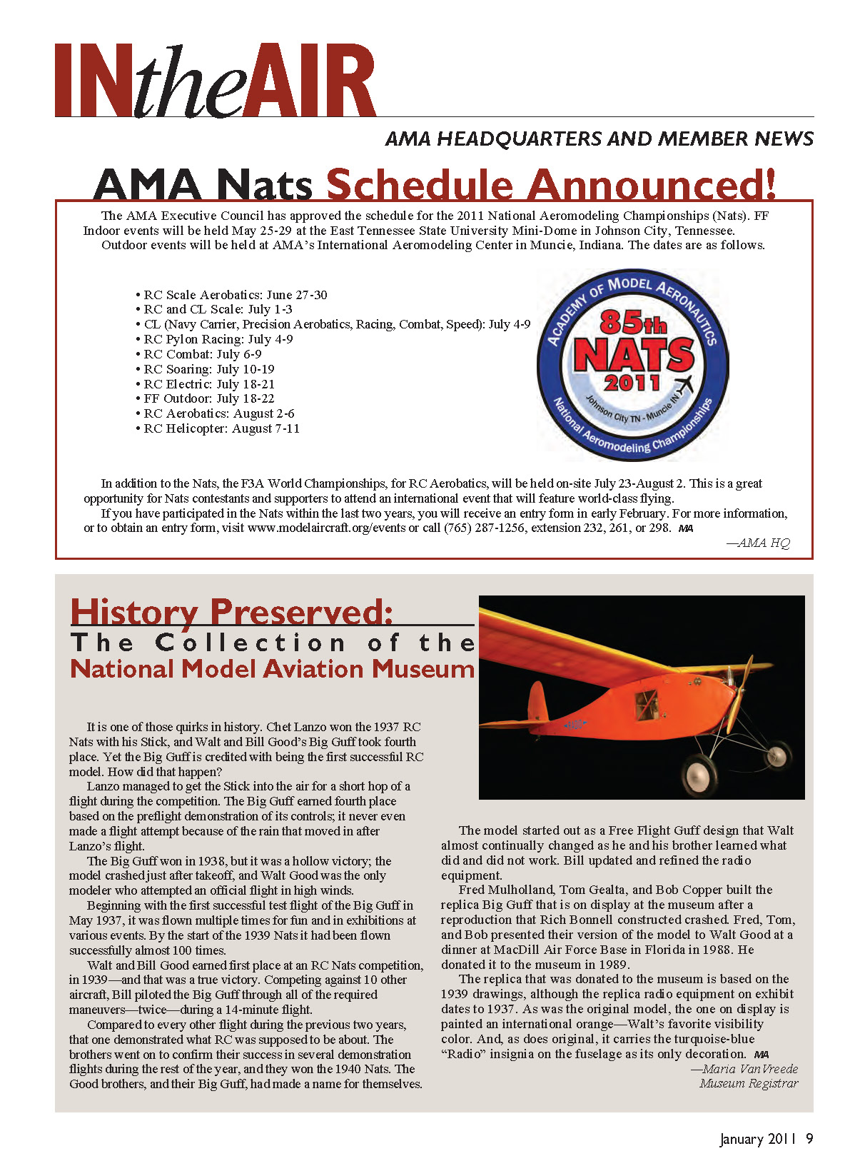 The AMA Executive Council has approved the schedule for the 2011 National Aeromodeling Championships (Nats). FF