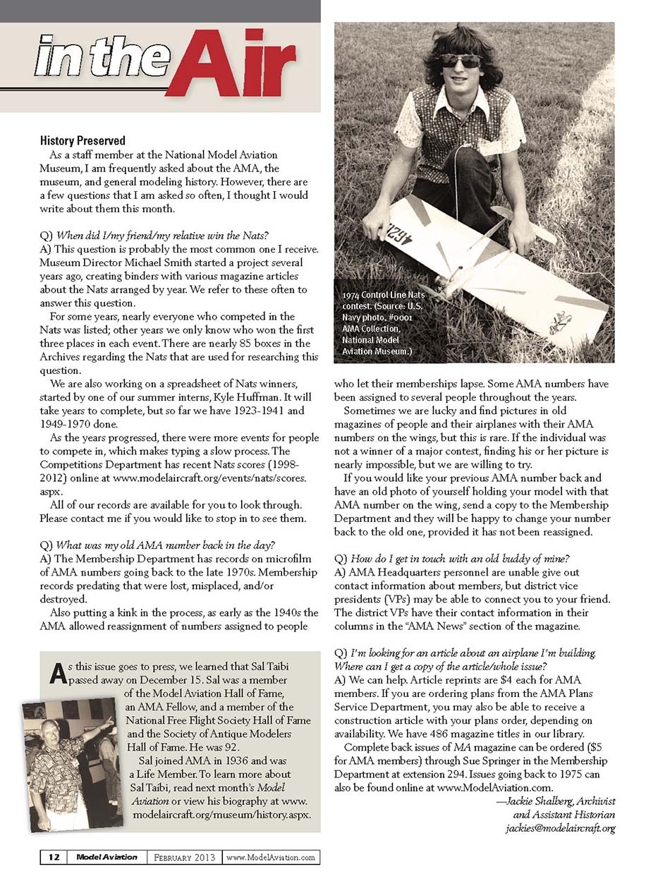 History PreservedAs a staff member at the National Model Aviation Museum, I am frequently asked about the AMA, the museum, and general modeling history. However, there are a few questions that I am asked so often, I thought I would write about them this month.Q) When did I/my friend/my relative win the Nats?A) This question is probably the most common one I receive. Museum Director Michael Smith started a project several years ago, creating binders with various magazine articles about the Nats arranged by year. We refer to these often to answer this question. For some years, nearly everyone who competed in the Nats was listed; other years we only know who won the fi rst three places in each event. There are nearly 85 boxes in the Archives regarding the Nats that are used for researching this question. We are also working on a spreadsheet of Nats winners, started by one of our summer interns, Kyle Huffman. It will take years to complete, but so far we have 1923-1941 and 1949-1970 done. As the years progressed, there were more events for people to compete in, which makes typing a slow process. The Competitions Department has recent Nats scores (1998-2012) online at www.modelaircraft.org/events/nats/scores.aspx. All of our records are available for you to look through. Please contact me if you would like to stop in to see them.Q) What was my old AMA number back in the day? A) The Membership Department has records on microfi lm of AMA numbers going back to the late 1970s. Membership records predating that were lost, misplaced, and/or destroyed. Also putting a kink in the process, as early as the 1940s the AMA allowed reassignment of numbers assigned to people As this issue goes to press, we learned that Sal Taibi passed away on December 15. Sal was a member of the Model Aviation Hall of Fame, an AMA Fellow, and a member of the National Free Flight Society Hall of Fame and the Society of Antique Modelers Hall of Fame. He was 92. Sal joined AMA in 1936 and was a Life Member. To learn more about Sal Taibi, read next month’s Model Aviation or view his biography at www.modelaircraft.org/museum/history.aspx. who let their memberships lapse. Some AMA numbers have been assigned to several people throughout the years. Sometimes we are lucky and fi nd pictures in old magazines of people and their airplanes with their AMA numbers on the wings, but this is rare. If the individual was not a winner of a major contest, fi nding his or her picture is nearly impossible, but we are willing to try. If you would like your previous AMA number back and have an old photo of yourself holding your model with that AMA number on the wing, send a copy to the Membership Department and they will be happy to change your number back to the old one, provided it has not been reassigned.Q) How do I get in touch with an old buddy of mine? A) AMA Headquarters personnel are unable give out contact information about members, but district vice presidents (VPs) may be able to connect you to your friend. The district VPs have their contact information in their columns in the “AMA News” section of the magazine.Q) I’m looking for an article about an airplane I’m building. Where can I get a copy of the article/whole issue?A) We can help. Article reprints are $4 each for AMA members. If you are ordering plans from the AMA Plans Service Department, you may also be able to receive a construction article with your plans order, depending on availability. We have 486 magazine titles in our library. Complete back issues of MA magazine can be ordered ($5 for AMA members) through Sue Springer in the Membership Department at extension 294. Issues going back to 1975 can also be found online at www.ModelAviation.com.—Jackie Shalberg, Archivist and Assistant Historianjackies@modelaircraft.org1974 Control Line Nats contest. (Source: U.S. Navy photo, #0001 AMA Collection, National Model Aviation Museum.)12Model Aviation FEBRUARY 2013www.ModelAviation.comAirAirinthe