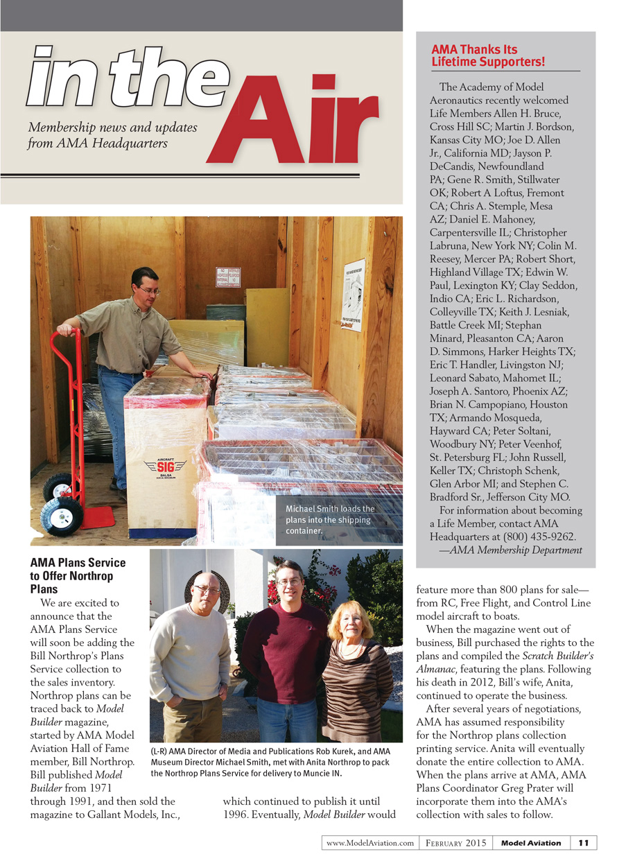 The Academy of Model Aeronautics recently welcomed Life Members Allen H. Bruce, Cross Hill SC; Martin J. Bordson, Kansas City MO; Joe D. Allen Jr.; California MD; Jayson P. DeCandis, Newfoundland PA; Gene R. Smith, Stillwater OK; Robert A Loftus, Fremont CA; Chris A. Stemple, Mesa AZ; Daniel E. Mahoney, Carpentersville IL; Christopher Labruna, New York NY; Colin M. Reesey, Mercer PA; Robert Short, Highland Village TX; Edwin W. Paul, Lexington KY; Clay Seddon, Indio CA; Eric L. Richardson, Colleyville TX; Keith J. Lesniak, Battle Creek MI; Stephan Minard, Pleasanton CA; Aaron D. Simmons, Harker Heights TX; Eric T. Handler, Livingston NJ; Leonard Sabato, Mahomet IL; Joseph A. Santoro, Phoenix AZ; Brian N. Campopiano, Houston TX; Armando Mosqueda, Hayward CA; Peter Soltani, Woodbury NY; Peter Veenhof, St. Petersburg FL; John Russell, Keller TX; Christoph Schenk, Glen Arbor MI; and Stephen C. Bradford Sr., Jefferson City MO.
