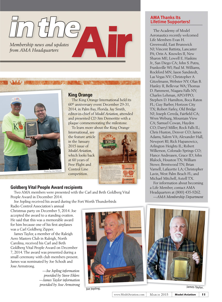 The King Orange International held its 60th anniversary event December 29-31, 2014, in Palm Bay, Florida. Jay Smith, editor-in-chief of Model Aviation magazine, attended the event and presented CD Jim Demeritte with a plaque commemorating the milestone.