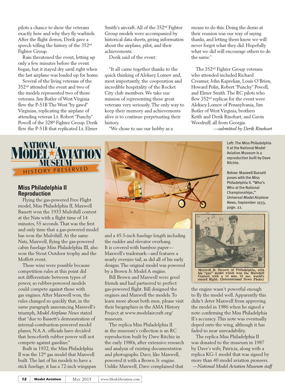 Flying the gas-powered Free Flight model, Miss Philadelphia II, Maxwell Bassett won the 1933 Mulvihill contest at the Nats with a flight time of 14 minutes, 55 seconds. That was the first and only time that a gas-powered model has won the Mulvihill. At the same Nats, Maxwell, flying the gas-powered cabin fuselage Miss Philadelphia III, also won the Stout Outdoor trophy and the Moffett event.