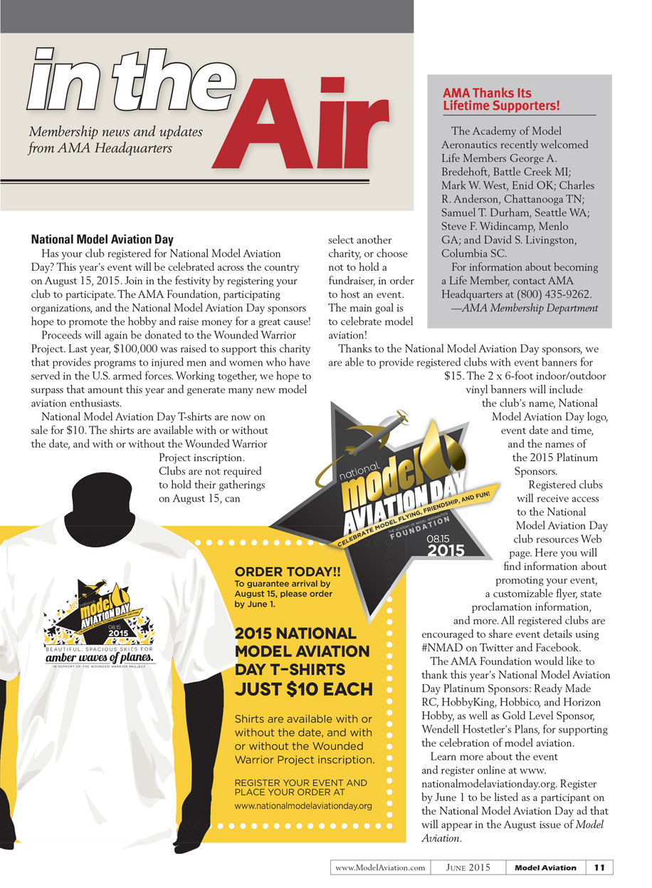 Learn more and register online at www.nationalmodelaviationday.org. Register by June 1 to be listed as a participant on the National Model Aviation Day ad that will appear in the August issue of Model Aviation.
