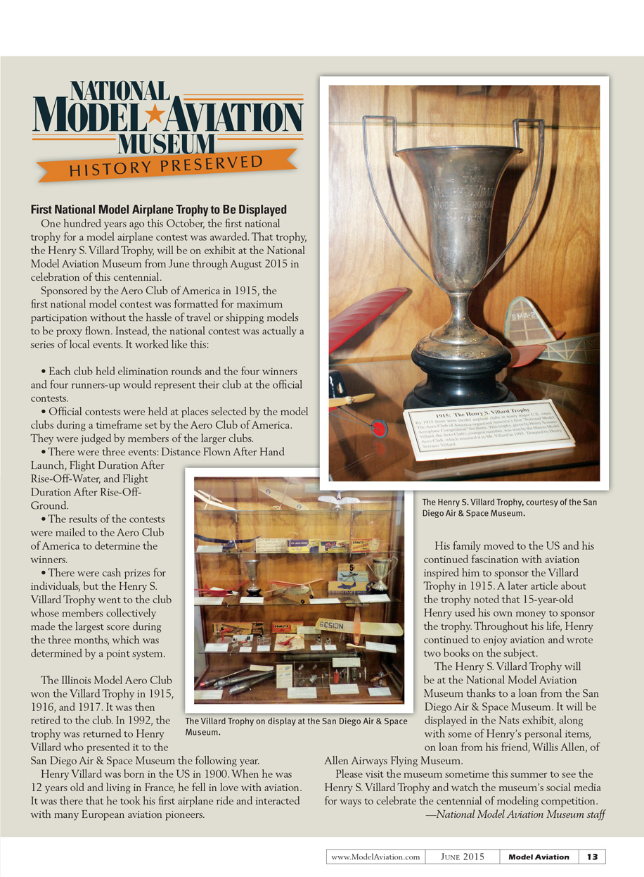 One Hundred years ago this October, the first national trophy for a model airplane contest was awarded. That trophy, the Henry S. Villard Trophy, will be on exhibit at the National Model Aviation Museum from June to August 2015 in celebration of this centennial.