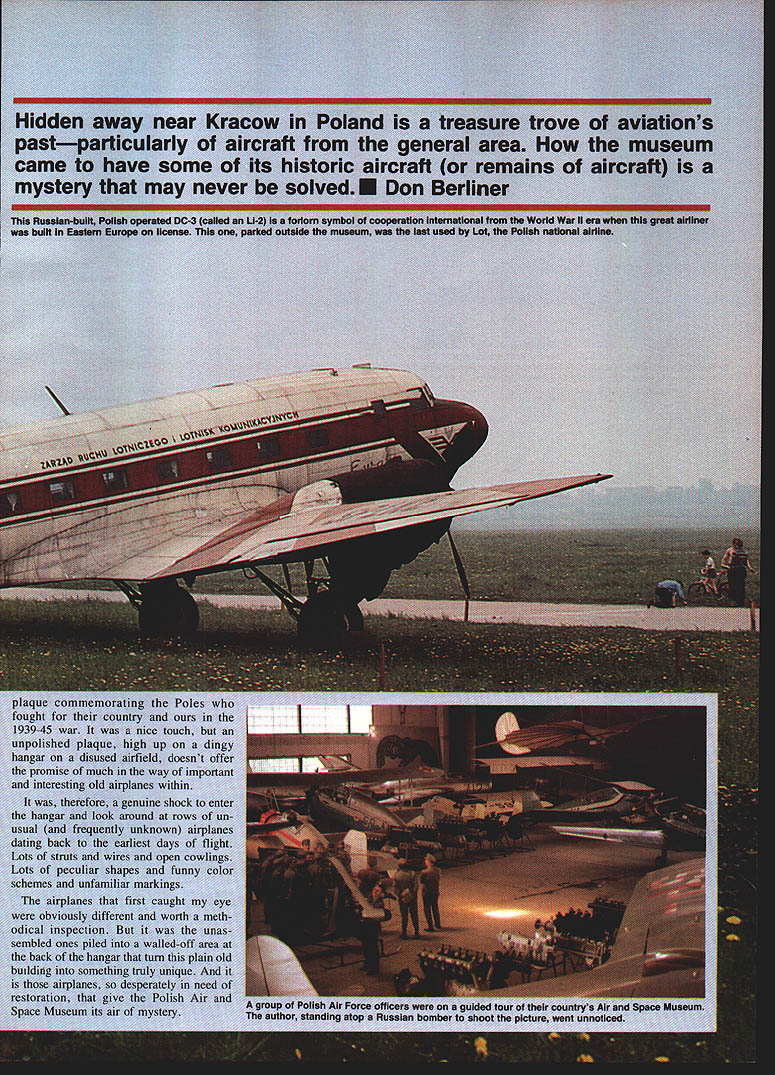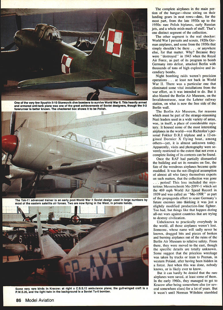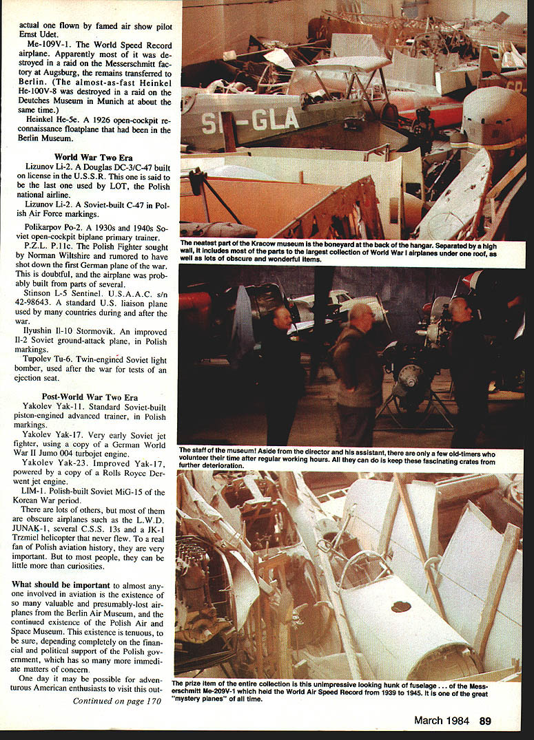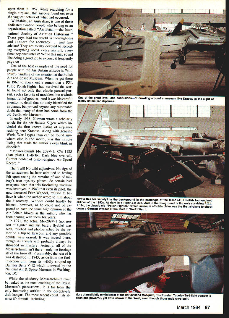 of ha puZZIe Generally thats whether arts aeronautical air museum run flow Air ikr matter ig exception [useum m shington numbe~ twi Pensac , WI places e werent n museums cow Poland Asi oldest doesnt have tli ay museum isnt v veral miles out tl nin Steel Works uie great youre n visit irecti y UII 1 mise st iii thp Its an. cuIiar d unfar inspe ed ones ck th operated DC license e touch up Id doesri i way important ies within shock d at row wn uays open d fun gs ali Icoq N wU II 86 Model Aviation complete airplanes main por tion hangarthose sitting landing gears neat rowsdate part late 1930s up 1950s rare Polish biplanes early Russian jets whole mish-mash stuff Thats distinct segment collection other segment real shocker World War pursuits scouts 1920s Ger man airplanes some 1930s simply shouldnt ywhere else matter Because destroyed 1943 Royal Air Force part its program bomb Germany defeat attacked Berlin thousands tons high explosive cendiary bombs Night bombing raids werent precision operations ast back World War II particular eliminated some vital installations war effort intended also blasted Berlin Air Museum Invalidenstrasse near Lehrter railway station what now free side Berlin wall Berlin Air Museum reasons must part strange-reasoning Nazi leaders used wide variety areas itself place considerable mys tery housed some interesting airplanes worldvon Richtofens per sonal Fokker DRI triplane 12-en gined Dornier X flying boat among othersyet almost unknown today Apparently visits photography se verely restricted extent complete listing its contents can found Once RAF partially dismantled building set its remains fire fate wondrous airplanes became quite muddled not-illogical assumption almost fancy themselves experts such matters collection gone period loss included mys terious Messerschmitt Me-209V- 1 set 469 mph World Air Speed Record 1939 called Me-109R part propaganda effort scare Germanys future enemies thinking just slightly modified production-line fighter Too bad things like happen during all-out wars against countries trying destroy civilization Unbeknown practically everybody world airplanes werent lost Someone name will sadly never known dragged bits pieces broken burning airplanes out ruins Berlin Air Museum relative safety moved east though specific details totally unknown Some suggest priceless wreckage taken trucks train Poznan western Poland after having hidden forest Just done nobody knows likely ever know can hardly denied rare airplanes saved least some early 1960s managed get Kracow after being somewhere else sev eral somewhere elses lot years wasnt until Norman Wiltshire stumbled Orisevery CUJJVP UVUflU CU, armored anti-tarm grebementsuuaflerS though 11-2 forerunner better known checkered box Shuwa very rare oiras rracuw 81 rigni arna p1808 108 guuu-wulugao urati Ia 8 PWS26 light twin background Soviet Tu-6 bomber upon 1967 searching single airplane anyone found out vaguest details what occurred Wilthshire Australian dedicated aviation people belong organization called Air Britainthe Inter national Society Aviation Historians guys lead world thoroughness concern accuracy n aticism totally devoted record ing everything about aircraft time encounter may sound like doing good job excess frequently pays off best examples need people Air Britain attitude Wilt shires handling situation Polish Air Space Museum got 1967 check out rumor PZL P1 lc Polish Fighter survived war found classic parasol pur suit such favorite modelers whole hangar full goodies careful attention detail identified airplanes proved beyond reasonable doubt come old Berlin Air Museum early 1968 Norman wrote scholarly article Air Britain Digest cluded first known listing airplanes residing near Kracow Along genuine World War types can found else world simple listing made authors eyes blink disbelief Messerschmitt 209V-l C/n 1185 data plate D-INJR Dark blue over-all Current holder piston-engined Air Speed Record Thats No wild adjectives No sign amazement later admitted having felt upon seeing remains torys true mystery planes So certain everyone fascinating machine destroyed 1943 its pilot now deceased Fritz Wendel refused lieve author wrote him about discovery Wendel could hardly blamed however could ex pected have same high opinion Air Britain blokes author has dealing years 1971 actual Me-209V- 1 sort fighter just barely flyable seen touched photographed au thor trip Kracow possible doubts erased indeed though its travels will probably always shrouded mystery Actually Messerschmitt isnt thereonly fuselage aft firewall Presumably rest destroyed 1943 aside fuelinjection unit its wildly souped-up Daimler Benz V-12 owned National Air & Space Museum Washing ton DC shadowy Messerschmitt must ranked exciting Polish Museums possessions far interesting artifact deceptively drab hangar recent count lists al 60 aircraft including UU man siigntiy reminiscent ie deilavifland Mosquito Russian Tu., uu,nr w clean powerful yet ilttie known West though thousands buiit Ne-World War Era 1890-96 Lilienthal glider Probably re production though Berlin Museum owned highly-flammable wings real Lilienthal scraps could have used 1909 Antoinette monoplane Probably Berlin Air Museum owned early airplanes no serial numbers can checked 1910 Farman F4 reproduction Built pioneer Polish pilots flown extensively 191 1 Rumpler Taube Designed Et rich Probably Berlin Museum 1911 1912 AEG Euler Either first second airplane built AEG probably Berlin Air Museum 1912 Fokker Spin likely Berlin Museum though complete listing collection doesnt include 1913 Jeannin Taube Similar Rumpler R 11 LC probably Berlin Museum 1913 Geeste Moewe Similar Rumpler no doubt Berlin Mu seum World War Era Albatross B-l la Marked MG imilar airplane Berlin collection Albatross C-I Serial number 197/15 definitely Berlin Museum Albatross H-I Serial number 10114 Siemens Schukert DIV modified after war high-altitude research Almost surely Berlin Museum Albatross L 101 D-EKY