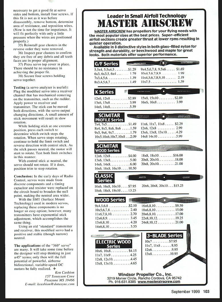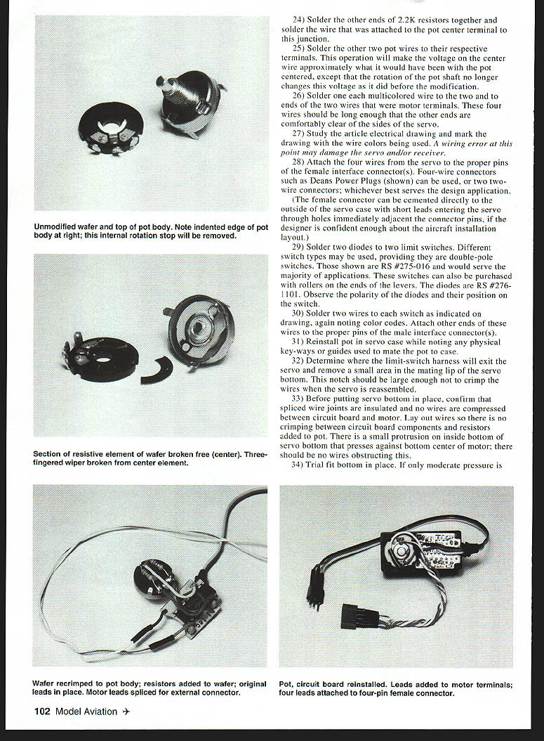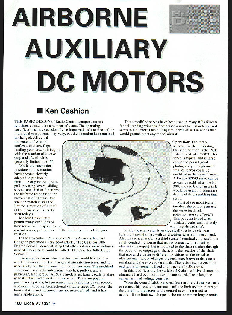 AIRBORNE AUXILIARY DC OTORS U Ken Cashion THE BASIC DESIGN Radio Control components has remained constant number years operating specifications may occasionally improved sizes individual components may vary operation has remained unchanged actual movement control surfaces spoilers flaps landing gear etc still begins rotation servo output shaft generally limited 45O mechanical reactions rotation have become cleverly adapted produce multitude push-pull pullpull pivoting levers sliding servos similar functions airframe response movement transmitter stick switch still limited tion shaft linear servo rarely seen today Modern transmitters permit variations servos will respond control sticks yet still limitation 45-degree rotation November 1998 issue Model Aviation Richard Carignan presented very good article Case 180Degree Servos demonstrating other options sometimes needed article could called Case 360-Degree Servos occasions designer would like have another power source changes aircraft structures necessarily just movement control surfaces modified servo can drive rack-and-pinons winches pulleys particular lead screws As Scale models get larger scale landing gear structure operation expected popular pneumatic systems presented another power source powerful airborne bidirectional variable-speed DC motor limits its resulting movement user-defined has applications modified servos have used RC sailboats sail-tending winches Some used modified standard-sized servo tend 600 square inches sail winds would ground model aircraft Operation The servo selected demonstrating modification RCD Hitec Standard HS-300 servo typical large enough permit good photography though much smaller servos could modified same manner Futaba S3003 servo can easily modified HS 300 Carignan article would useful acquiring details disassembling servo Most modification involves output gear servo feedback potentiometer pot pot consists rear insulated wafer body threads shaft Inside rear wafer electrically resistive element forming near-full arc electrical terminal end Also rear wafer third center terminal connected small conducting spring makes contact rotating clement wiper mounted shaft running through body output gear shaft rotation shaft moves wiper different positions resistive element thereby changes resistance between center terminal two end terminals resistance between end terminals remains fixed generally 5K ohms modification variable 5K ohm resistive element eliminated two fixed resistors added keep center terminal voltage constant control stick moved neutral servo starts rotate rotation continues until limit switch interrupts current motor control stick returned neutral limit switch opens motor can no longer rotate 100 Model Aviation os author Graphic Design Jill Ann Cavanaugh direction however diode across switch permits reverse current drive motor opposite direction reversing current occurs control stick moved past neutral opposite direction As soon motor starts rotating opposite direction limit switch closes again permitting motor again rotate either direction Another switch diode limits rotation other end travel farther control stick moved faster motor rotates Modification The modification difficult user has moderate soldering skills following steps adhered Editors note reminder modifications servos will almost certainly void manfacturers warranties items 1 Remove servo horn 2 Remove four screws servo bottom 3 Remove top carefully keep gear clusters place 4 Remove bottom 5 Note rotation-limit stops inside upper case stop output gear Step 10 stop gear will removed permit 360-degree rotation gear 6 Remove spacer top output gear remove output gear prying lightly between case gear bottom center screwdriver Caution damage output gear teeth during operation gear light press-fit feedback pot shaft 7 Remove gear-clusters obvious sequence taking care protect gear teeth best remove center gear pulling lightly gears shaft Set gears aside sequence removed tops gears facing up 8j necessary remove gear grease gears will handled very little 9 At point shaft can rotated hand Determine has built-in limit stop Hitec does 10 Remove limit stop gear Caution very careful gears during operation Make sure stop material remains interfere adjacent gears II Pivot bottom circuit board free case end away motor 12 Record color location three wires soldered pot same two wires motor 13 Remove pot removing nut washer top servo Some Futaba servos have pot clipped some servos have pot element secured small screws 14 Unsolder wires pot 15 Unsolder wires motor 16 To free pot wafer uncrimp three tabs securing pot wafer back pot body 17 On pot body locate three-fingered wiper use needle-nose pliers break off wiper shaft structure 18 Identify resistive element wafer knife pry under element break section free pot electrically disconnects pot terminals can used support resistors will added later 19 Now rotation-stop inside pot body must removed easiest way to rotate shaft until free access indentation metal frame pot body Lay outer edge pot over hard surface use small punch tap flatten indentation pot shaft will have easy 3600 rotation 20 A small drop light machine oil point pin may placed inside pot shaft remove shaft 21 Place rear wafer back pot body test free full rotation should rotate easily 22 Confirm wafer properly aligned body reassemble pot crimping three back place compress assembly 23 Solder two 22K -watt resistors outside terminal rear pot wafer Resistors Radio Shack RS #271-1325 Keep resistors flat against pot wafer facilitate reassembly Unmodified servo top removed Rotation limit stop output drive gear blackened photo will removed Servo pot gear clusters removed Note stop has now removed output gear September 1999 101 Unmodified servo bottom removed showing circuit board motor top feedback pot Unmodified wafer top pot body Note indented edge pot body right internal rotation stop will removed 24 Solder other ends 22K resistors together solder