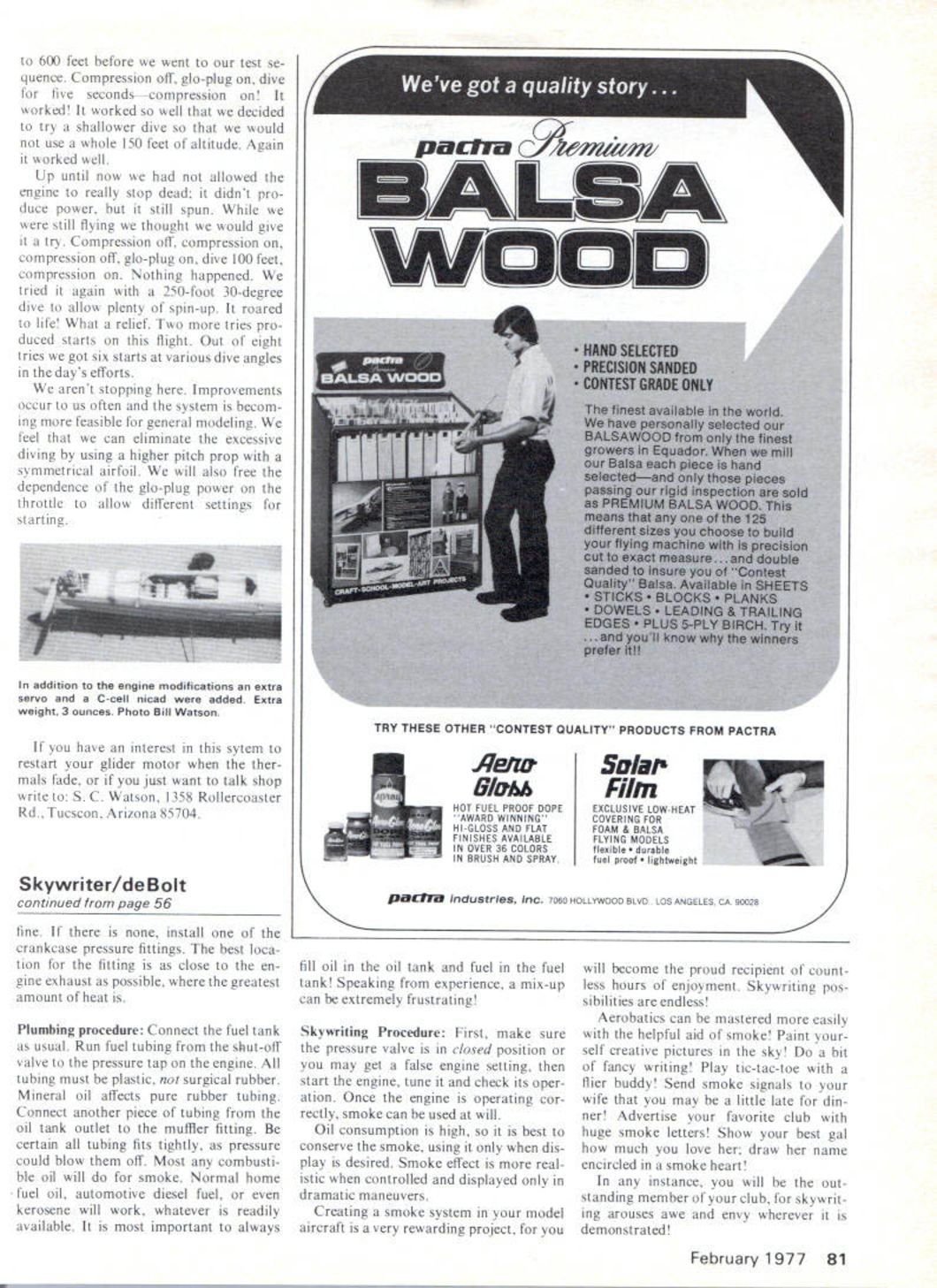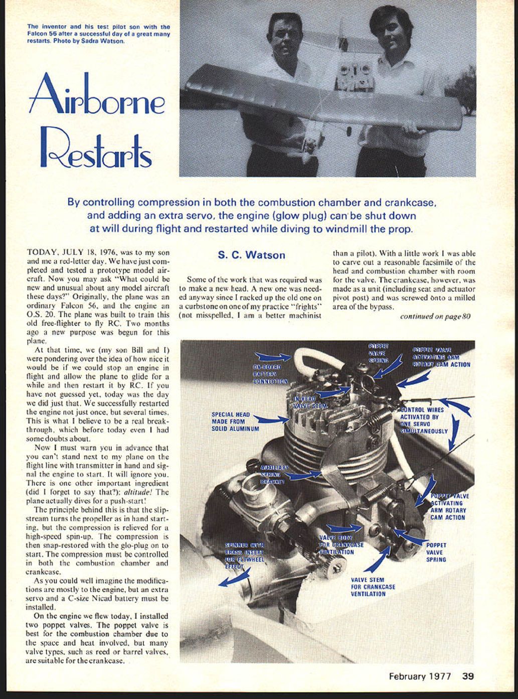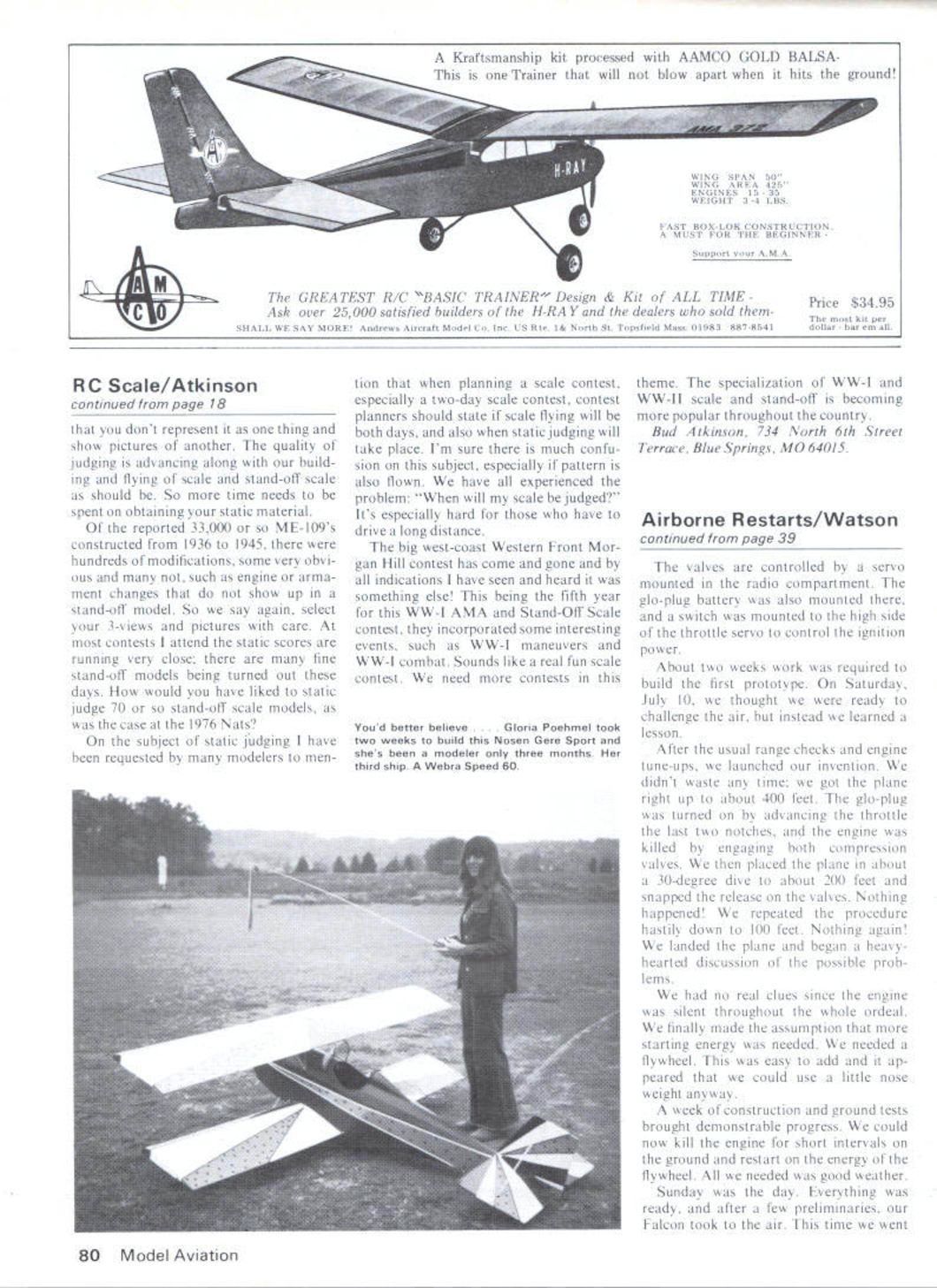 The inventor test pilot son Falcon 56 after successful day great restarts Photo Sadra Watson ontrolling compression both combustion chamber crankcase adding extra servo engine glow plug can shut down will during flight restarted diving windmill prop TODAY JULY 18 1976 son red-letter day have just com pleted tested prototype model air craft Now may ask What could new unusual about model aircraft days Originally plane ordinary Falcon 56 engine OS 20 plane built train old free-fighter fly RC Two months ago new purpose begun plane time son Bill pondering over idea nice would could stop engine flight allow plane glide restart RC have guessed yet today day did just successfully restarted engine just once several times what believe real break through before today some doubts about Now must warn advance cant stand next plane flight line transmitter hand sig nal engine start will ignore other important ingredient did forget say altitude plane actually dives push-start principle behind slip stream turns propeller hand start ing compression relieved high-speed spin-up compression snap-restored gb-plug start compression must controlled both combustion chamber crankcase As could well imagine modifica tions mostly engine extra servo C-size Nicad battery must installed engine flew today installed two poppet valves poppet valve best combustion chamber due space heat involved valve types such reed barrel valves suitable crankcase S C Watson Some work required make new head new need ed anyway since racked up old curbstoneononeofmypractice frights misspelled am better machinist pilot little work able carve out reasonable facsimile head combustion chamber room valve crankcase however made unit including seat actuator pivot post screwed dnto milled area bypass February 1 977 39 continued page 80 VALVE STEM FOR CRANKCASE VENTILATION dont represent thing show pictures another quality judging advancing along build ing flying scale stand-off scale should So time needs spent obtaining static material reported 33000 ME-109s constructed 1936 1945 hundreds modifications some very obvi ous such engine arma ment changes show up stand-off model So say again select 3-views pictures care contests attend static scores running very close fine stand-off models being turned out days would have liked static judge 70 stand-off scale models case 1976 Nats subject static fudging have requested modelers mention planning scale contest especially two-day scale contest contest planners should state scale flying will both days also static judging will take place Im sure much confu sion subject especially pattern also flown have experienced problem will scale judged Its especially hard have drive long distance big west-coast Western Front Mor gan Hill contest has come gone indications have seen heard something else being fifth year WW-l AMA Stand-Off Scale contest incorporated some interesting events such WW-l maneuvers WW-I combat Sounds like real fun scale contest need contests Youd better believe loria Poehmel took two weeks build Nosen Gere Sport shes modeler three months third ship Webra Speed 60 theme specialization WW-I WW-II scale stand-off becoming popular throughout country Bud Atkinson 734 North 6th Street Terrace Blue Springs MO 64015 Airborne Restarts/Watson continued page 39 valves controlled servo mounted radio compartment gb-plug battery also mounted switch mounted high side throttle servo control ignition power About two weeks work required build first prototype Saturday July 10 thought ready challenge air instead learned lesson After usual range checks engine tune-ups launched invention didnt waste time got plane right up about 400 feet gb-plug turned advancing throttle last two notches engine killed engaging both compression valves placed plane about 30-degree dive about 200 feet snapped release valves Nothing happened repeated procedure hastily down 100 feet Nothing again landed plane began heavy hearted discussion possible prob ems no real clues since engine silent throughout whole ordeal finally made assumption starting energy needed needed flywheel easy add ap peared could use little nose weight anyway week construction ground tests brought demonstrable progress could now kill engine short intervals ground restart energy flywheel needed good weather Sunday day Everything ready after few preliminaries Falcon took air time went 80 Model Aviation Kraftsmanship kit processed AAMCO GOLD BALSAThis Trainer will blow apart hits ground Price $3495 kit per dollar bar em alL RC Scale/Atkinson continued page 18 GREATEST R/C "BASIC TRAINER Design & Kit ALL TIME Ask over 25000 satisfied builders H-RAY dealers sold themSHALL WE SAY MORE Andrews Ajerraft Model Css lnr US Ete 1& North St Topstield Mass 0t983 887-8541 600 feet before went test se quence Compression off gb-plug dive five secondscompression worked worked well decided try shallower dive would use whole 150 feet altitude Again worked well Up until now allowed engine really stop dead didnt pro duce power still spun still flying thought would give try Compression off compression compression off gb-plug dive 100 feet compression Nothing happened tried again 250-foot 30-degree dive allow plenty spin-up roared life What relief Two tries pro duced starts flight Out eight tries got six starts various dive angles days efforts arent stopping Improvements occur us often system becom ing feasible general modeling feel can eliminate excessive diving using higher pitch prop symmetrical airfoil will also free dependence gb-plug power throttle allow different settings starting addition engine modifications extra servo C-cell nicad added Extra weight 3 ounces Photo Bill Watson have interest sytem restart glider motor ther mals fade just want talk shop write SC Watson 1358 Rollercoaster Rd Tuescon Arizona 85704 Skywriter/de Bolt continued page 56 fine install crankcase pressure fittings best loca tion fitting close en gine exhaust possible greatest amount heat Plumbing procedure Conn