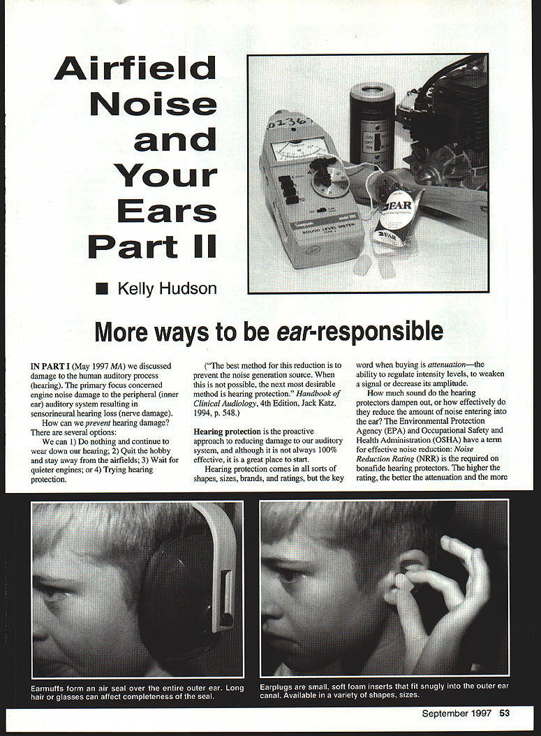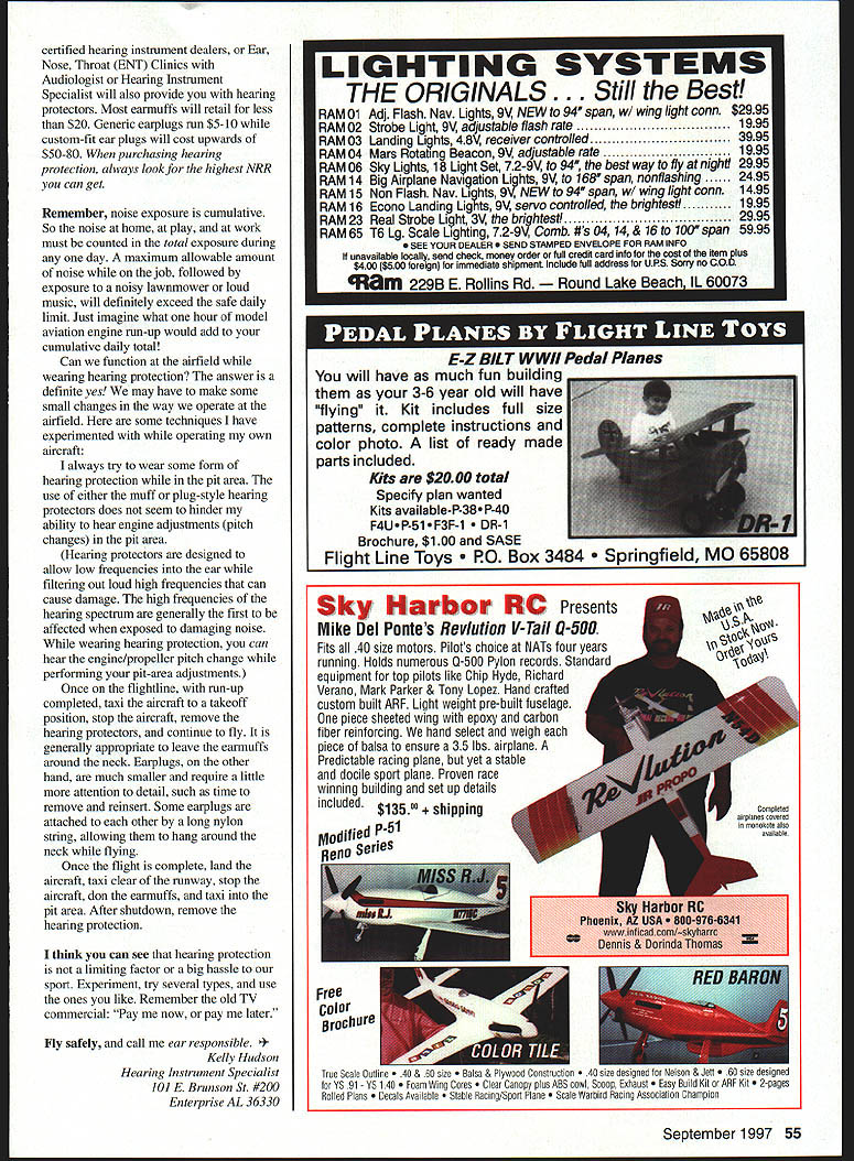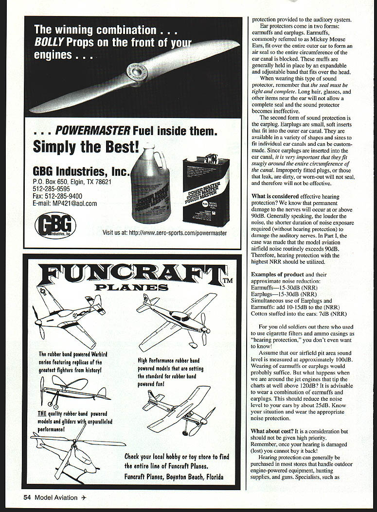 Airfield Noise Ears Part II U Kelly Hudson ways ear-responsible IN PART May 1997 MA discussed damage human auditory process hearing primary focus concerned engine noise damage peripheral inner ear auditory system resulting sensorineural hearing loss nerve damage can prevent hearing damage several options can 1 nothing continue wear down hearing 2 Quit hobby stay away airfields 3 Wait quieter engines 4 Trying hearing protection best method reduction prevent noise generation source possible next desirable method hearing protection Handbook Clinical Audiology 4th Edition Jack Katz 1994 p 548 Hearing protection proactive approach reducing damage auditory system although always 100% effective great place start Hearing protection comes sorts shapes sizes brands ratings key word buying attenuationthe ability regulate intensity levels weaken signal decrease its amplitude much sound hearing protectors dampen out effectively reduce amount noise entering ear Environmental Protection Agency EPA Occupational Safety Health Administration OSHA have term effective noise reduction Noise Reduction Rating NRR required bonafide hearing protectors higher rating better attenuation September 1997 55 Simply Bestr GBG Industries Inc PO Box 650 Elgin TX 78621 512-285-9595 Fax 512-285-9400 E-mail MP421@aolcom iIIn protection provided auditory system Ear protectors come two forms earmuffs earplugs Earmuffs commonly referred Mickey Mouse Ears fit over entire outer ear form air seal entire circumference ear canal blocked muffs generally held place expandable adjustable band fits over head wearing type sound protector remember seal must tight complete Long hair glasses other items near ear will allow complete seal sound protector becomes ineffective second form sound protection earplug Earplugs small soft inserts fit outer ear canal available variety shapes sizes fit individual ear canals can custommade Since earplugs inserted ear canal very important fit snugly around entire circumference canal Improperly fitted plugs leak dirty worn-out will seal therefore will effective What considered effective hearing protection know permanent damage nerves will occur above 90dB Generally speaking louder noise shorter duration noise exposure required hearing protection damage auditory nerves Part case made model aviation airfield noise routinely exceeds 90dB Therefore hearing protection highest NRR should utilized Examples product approximate noise reduction Earmuffs15-3OdB NRR Earplugsl 5-30dB NRR Simultaneous use Earplugs Earmuffs add 10-15dB NRR Cotton stuffed ears 7dB NRR old soldiers out used use cigarette filters ammo casings hearing protection dont want know Assume airfield pit area sound level measured approximately 100dB Wearing earmuffs earplugs would probably suffice what happens around jet engines tip charts well above 120dB advisable wear combination earmuffs earplugs should reduce noise level ears about 25dB Know situation wear appropriate noise protection What about cost consideration should given high priority Remember once hearing damaged lost cannot buy back Hearing protection can generally purchased stores handle outdoor engine-powered equipment hunting supplies guns Specialists such 54 Model Aviation RMASTER Fuel inside Visit us http//wwwaero-sportscom/powermaster rubber band powered Warbird series featuring replicas theHigh Performance rubber band greatest fighters historypowered models setting standard rubber band powered fun Th quality rubber band powered models gliders wit unparalleled Check local hobby toy store find entire line Funcraft Planes Funcraft Planes Boynton Beach Florida certified hearing instrument dealers Ear Nose Throat ENT Clinics Audiologist Hearing Instrument Specialist will also provide hearing protectors Most earmuffs will retail less $20 Generic earplugs run $5-b custom-fit ear plugs will cost upwards $50-80 purchasing hearing protection always look highest NRR can get Remember noise exposure cumulative So noise home play work must counted total exposure during day maximum allowable amount noise job followed exposure noisy lawnmower loud music will definitely exceed safe daily limit Just imagine what hour model aviation engine run-up would add cumulative daily total Can function airfield wearing hearing protection answer definite yes may have make some small changes way operate airfield some techniques have experimented operating own aircraft always try wear some form hearing protection pit area use either muff plug-style hearing protectors does seem hinder ability hear engine adjustments pitch changes pit area Hearing protectors designed allow low frequencies ear filtering out loud high frequencies can cause damage high frequencies hearing spectrum generally first affected exposed damaging noise wearing hearing protection can hear engine/propeller pitch change performing pit-area adjustments Once flightline run-up completed taxi aircraft takeoff position stop aircraft remove hearing protectors continue fly generally appropriate leave earmuffs around neck Earplugs other hand much smaller require little attention detail such time remove reinsert Some earplugs attached other long nylon string allowing hang around neck flying Once flight complete land aircraft taxi clear runway stop aircraft don earmuffs taxi pit area After shutdown remove hearing protection think can see hearing protection limiting factor big hassle sport Experiment try several types use ones like Remember old TV commercial Pay now pay later Fly safely call ear responsible y Hudson Hearing Instrument Specialist 101 E Brunson St #200 Enterprise AL 36330 E-Z BILT WWII Pedal Planes will have much fun building 3-6 year old will have flying Kit includes full size patterns complete instructions color photo list ready made parts included Kits $2000 total Specify plan wanted Kits available-P-38 P-40 F4UP-51F3F-1 Brochure $100 SASE Flight Line Toys ox 3484 Springfield Sky Harbor RG Presents Mike Del Pontes Reviution V-Tail 0-500 