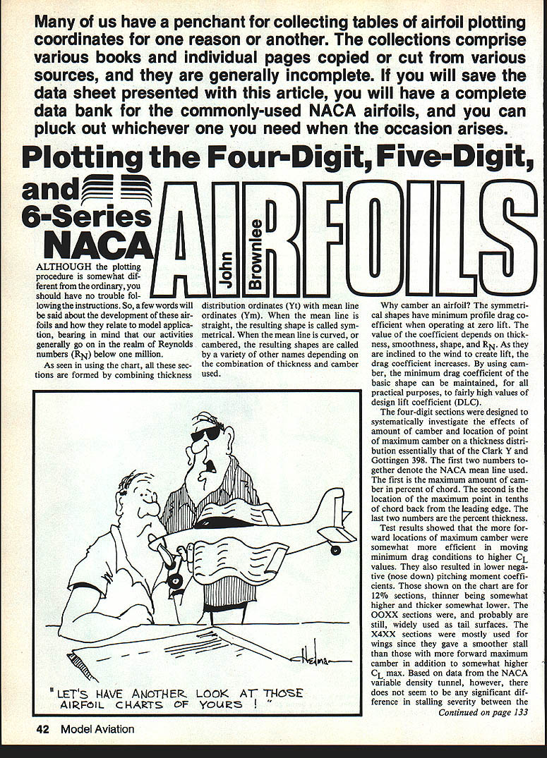 Many us have penchant collecting tables airfoil plotting coordinates reason another collections comprise various books individual pages copied cut various sources generally incomplete will save data sheet presented article will have complete data bank commonly-used NACA airfoils can pluck out whichever need occasion arises Plotting FourDigit Five-Digit ries 1 0 NAC ALTHOUGH plotting procedure somewhat dif ferent ordinary should have no trouble fol lowingthe instructions So afew words will distribution ordinates Yt mean line camber airfoil symmetri said about development air- ordinates Yin mean line iscal shapes have minimum profile drag co foils relate model applica- straight resulting shape called sym-efficient operating zero lift don bearing mind activities metrical mean line curved orvalue coefficient depends thickgenerally go realm Reynolds cambered resulting shapes calledness smoothness shape RN As numbers RN below million variety other names depending onare inclined wind create lift As seen using chart sec- combination thickness camberdrag coefficient increases using cam tions formed combining thickness usedber minimum drag coefficient basic shape can maintained practical purposes fairly high values design lift coefficient DLC four-digit sections designed systematically investigate effects amount camber location point maximum camber thickness distil bution essentially Clark Y Gottingen 398 first two numbers gether denote NACA mean line used first maximum amount cam ber percent chord second location maximum point tenths chord back leading edge last two numbers percent thickness Test results showed ward locations maximum camber somewhat efficient moving minimum drag conditions higher CL values also resulted lower nega tive nose down pitching moment coeffi cients shown chart 12% sections thinner being somewhat higher thicker somewhat lower OOXX sections probably still widely used tail surfaces X4XX sections mostly used wings since gave smoother stall forward maximum camber addition somewhat higher CL max Based data NACA variable density tunnel however LETS NAVE ANoTt4 E[. LOOK TNOEdoes seem significant dif RFO IL C N ARTS F yo rence stalling severity between Continued page 133 42 Model Aviation S KY FOX SPORT FLYER Wing Span Wing Area Length Weight Engine Radio SEE YOUR 54 Inches 620 Sq 43 Inches 55 Lbs 4050 4 Channel DEALER RLA MODELS513 859-7839 P 0 BOX 640 WEST CARROLLTON OHIO 45449 Direct Orders Send check money order pay shipping handling Ohio residents add 6% Sales Tax $8995 trols adjustments its transmitter two adjust stick-centering force lacks Collective Pitch Trim Collective Pitch Curve Adjustments have things presetting belicrank angles adjusting ball snaplinks mind system has features other could use Both long long way Basic Airplane Radio four-functions nine controls Kraft systems flight pack feeding Kraft gyro KPR-8FDS receiver five KPS-24 servos delivers 150 mA servos stationary two servos moving freely easily-duplicated condition current drain jumps 550 mA use 5R900 pack gives about two hours operating time operating conditions better some voltage measurements before flight stop flying instant flight pack voltage drops below 48 VDC under load you ask Both Kraft Airtronics transmitter have built-in ESVs Flight Pack both come long cord plugs helicopters Charging Jack purpose assess ing flight pack voltage Use before flight know its little inconvenient carry because nei ther transmitter provides storage packet test cords So make yourself no excuse will undo crash damage Ive done little testing now meters red-lined 48 volts needle drops below point head charger Never mind 44 volts stuff. thats charge exhausted basic continuous drain Helicopter gyro over 150 mA flight time remaining after 47 volts has reached desperately shortI estimate generally less time burn tank fuel Baron 20 tank lasts 10 minutes flight Heli Boy tank lasts 27 minutes could exhaust batteries flight either case after youve lifted off 47 volts speak experience Dont neglect transmitter batteries either Kraft strongly advises stop flying transmitter pack reaches 96 volts judging way system degenerated let run down below point ground tests agree dont like built-in meters alternatives ESVs Ex panded-Scale Voltmeters built-in load resistors available ac cessory market Just sure use some thing Ive asked Which better Synthe sized RF PCM no better case because different things both can used same transmitter fact Ill very surprised Futaba Circus dont add synthe sizer PCM sets next year George M Myers 70 Froehlich Farm Rd Hicksville NY 11801 AirfoilslBrownlee Continued page 42 symmetrical cambered sections RN below million showing smooth stall tendency Large negative pitching moments undesirable higher efficient values CL unless center gravity located behind center pressure wing Otherwise tall will have develop down load trim wing will turn have lift addition aircraft weight added induced drag resulting can substantial five-digit sections devised solve problem retaining same thickness distribution changing equations mean line first three numbers together denote NACA mean line sections variously cam bered DLC 015 times first number second two numbers gether twice distance percent Qf chord point maximum camber last two numbers again thick ness results successful showing very low pitching moments particularly 18-21 07o thickness range Another series 1 middle place 0 devised give theoretical zero pitching moment used sections have reputation violent stalls full scale should tame realm shape basic thickness distri bution four- five-digit sections results minimum pressure maximum velocity air flow 75 1007o back leading edge RN 9 10 million range flow turbulent over about 80-85% surface well below flight RN large fast aircraft objective 6-series sec tions develop basic thickness shapes would move minimum pressure point far back possible provide controlled drop pressure trigger premature transition laminar turbulent flow 6