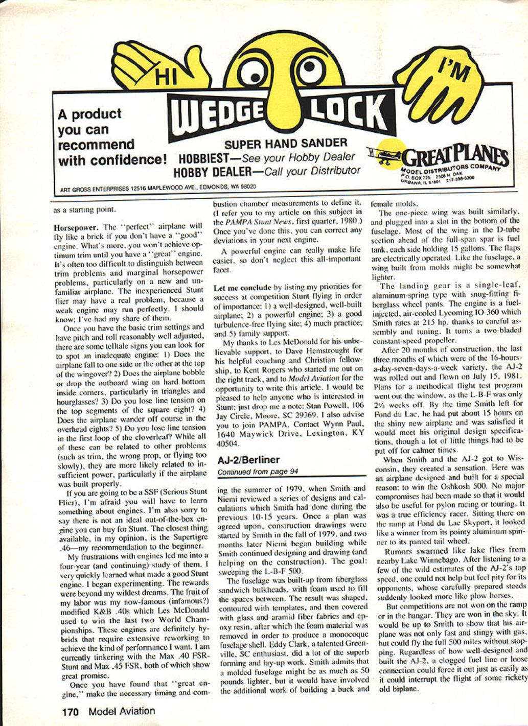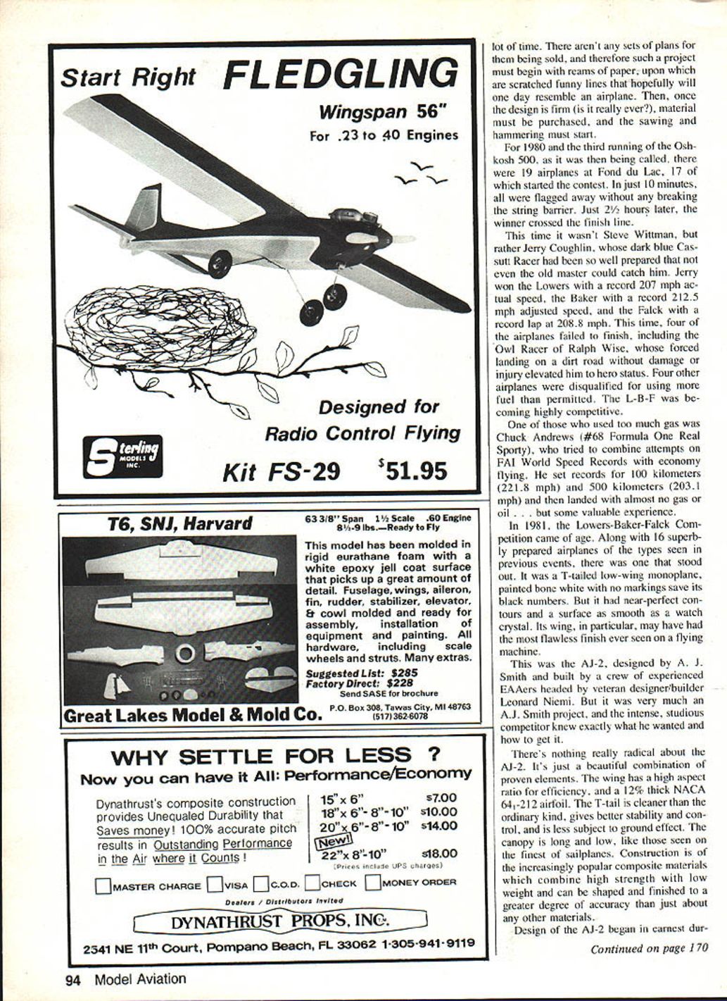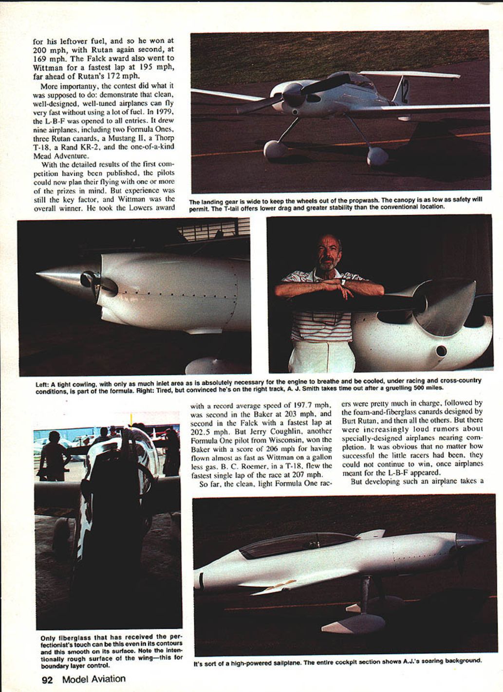 NO OCR TEXT NO OCR TEXT leftover fuel won 200 mph Rutan again second 169 mph Faick award also went Wittman fastest lap 195 mph far ahead Rutans 172 mph importantly contest did what supposed demonstrate clean well-designed well-tuned airplanes can fly very fast using lot fuel 1979 L-B-F opened entries drew nine airplanes including two Formula Ones three Rutan canards Mustang II Thorp T-18 Rand KR-2 one-of-a-kind Mead Adventure detailed results first com petition having published pilots could now plan flying prizes mind experience still key factor Wittman overall winner took Lowers award Left A tight cowling much inlet area absolutely necessary engine breathe cooled under racing cross-country conditions part formula Right Tired convinced hes right track J Smith takes time out after gruelling 500 miles Only fiberglass has received per fectionists touch can its contours end smooth its surface Note inten tionally rough surface wingthis boundary layer control record average speed 1977 mph second Baker 203 mph second Faick fastest lap 2025 mph Jerry Coughlin another Formula pilot Wisconsin won Baker score 206 mph having flown almost fast Wittman gallon less gas B C Roemer T-18 flew fastest single lap race 207 mph So far clean light Formula rac ers pretty much charge followed foam-and-fiberglass canards designed Burt Rutan others increasingly loud rumors about specially-designed airplanes nearing com pletion obvious no matter successful little racers could continue win once airplanes meant L-B-F appeared developing such airplane takes Its sort high-powered sailplane entire cockpit section shows AJs soaring background 92 Model Aviation landing gear wide keep wheels out propwash canopy low safety will permit T-tail offers lower drag greater stability conventional location -I 0 ROOT RIB SECTION A-AEE CC DC FUSELAGE SECTIONS E o2 NBAJ-E AC0 WINGSPAN 23B AJ -2 LENGTH226 2 198310 UNAWN B LI NT 44 SMITHINKED BY DICK GLEASON September 1983 93 model has molded rigid eurathane foam white epoxy jell coat surface picks up great amount detail Fuselage wings aileron fin rudder stabilizer elevator & cowl molded ready assembly installation equipment painting hardware including scale wheels struts extras Suggested List $285 Fact ery Direct $228 Send SASE brochure Great Lakes Model & mola ox 308TawasCity Ml 48763 WHY SETTLE FOR LESS can have PerformanCe/COflOmY Dynathrusts composite construction provides Unequaled Durability Saves moneyl 100% accurate pitch results Outstanding Performance Air Counts $700 $1000 s1400 15x 6 18x 6- 8"10 20x 6- 8- 10 _________22x 8-10 $1800 Prices inclede UPS sharges D MASTER CHARGE DVISA DCOD DOHECK DMONEY ORDER Dealers / DistributorS incited THRUST PROPS ING 2541 NE 11th Court Pompano Beach FL 33062 13059419119 lot time arent sets plans being sold therefore such project must begin reams paper upon scratched funny lines hopefully will day resemble airplane once design firm really ever material must purchased sawing hammering must start 1980 third running Osh kosh 500 being called 19 airplanes Fond du Lac 17 started contest just 10 minutes flagged away breaking string barrier Just 2 hours later winner crossed finish line time wasnt Steve Wittman rather Jerry Coughlin dark blue Cas sutt Racer well prepared old master could catch him Jerry won Lowers record 207 mph ac tual speed Baker record 2125 mph adjusted speed Falck record lap 2088 mph time four airplanes failed finish including Owl Racer Ralph Wise forced landing dirt road damage injury elevated him hero status Four other airplanes disqualified using fuel permitted L-B-F coming highly competitive used too much gas Chuck Andrews #68 Formula Real Sporty tried combine attempts FAI World Speed Records economy flying set records 100 kilometers 2218 mph 500 kilometers 2031 mph landed almost no gas oil me valuable experience 1981 Lowers-Baker-Falck Com petition came age Along 16 superb ly prepared airplanes types seen previous events stood out T-tailed low-wing monoplane painted bone white no markings save its black numbers near-perfect con tours surface smooth watch crystal Its wing particular may have flawless finish ever seen flying machine AJ-2 designed J Smith built crew experienced EAAers headed veteran designer/builder Leonard Niemi very much AJ Smith project intense studious competitor knew exactly what wanted get Theres nothing really radical about AJ-2 Its just beautiful combination proven elements wing has high aspect ratio efficiency 12% thick NACA 641-2l2 airfoil T-tail cleaner ordinary kind gives better stability con trol less subject ground effect canopy long low like seen finest sailplanes Construction increasingly popular composite materials combine high strength low weight can shaped finished greater degree accuracy just about other materials Design AJ-2 began earnest dur Continued page 1 70 94 Model Aviation Start Right FLEDGLING x Wingspan 56 23 40 Engines Designed Radio Control Flying Kit FS-29 TS SN Harvard 5195 63318 Span 11/2 Scale 60 Engine B/2-9 IbsReady fly product can II recommendSUPER HAND SANDER confidence HOBBIESTSee Hobby Dealer Y DEALERCa/l Distributor ANy ART GROSS ENTERPRISES 12516 MAPLEWOOD AVE EDMONDS WA 98020 starting point Horsepower ect airplane will fly like brick dont have good engine Whats wont achieve op timum trim until have great engine Its often too difficult distinguish between trim problems marginal horsepower problems particularly new un familiar airplane inexperienced Stunt flier may have real problem because weak engine may run perfectly should know Ive share Once have basic trim settings have pitch roll reasonably well adjusted some telltale signs can look spot inadequate engine Does airplane fall side other top wingover 2 Does airplane bobble drop outboard wing hard bottom inside corners particularly triangles hourglasses 3 lose line tension top segments square eight 4 Does airplane wander off course overhead eights 5 lose line tension first loop cloverleaf can related other problems