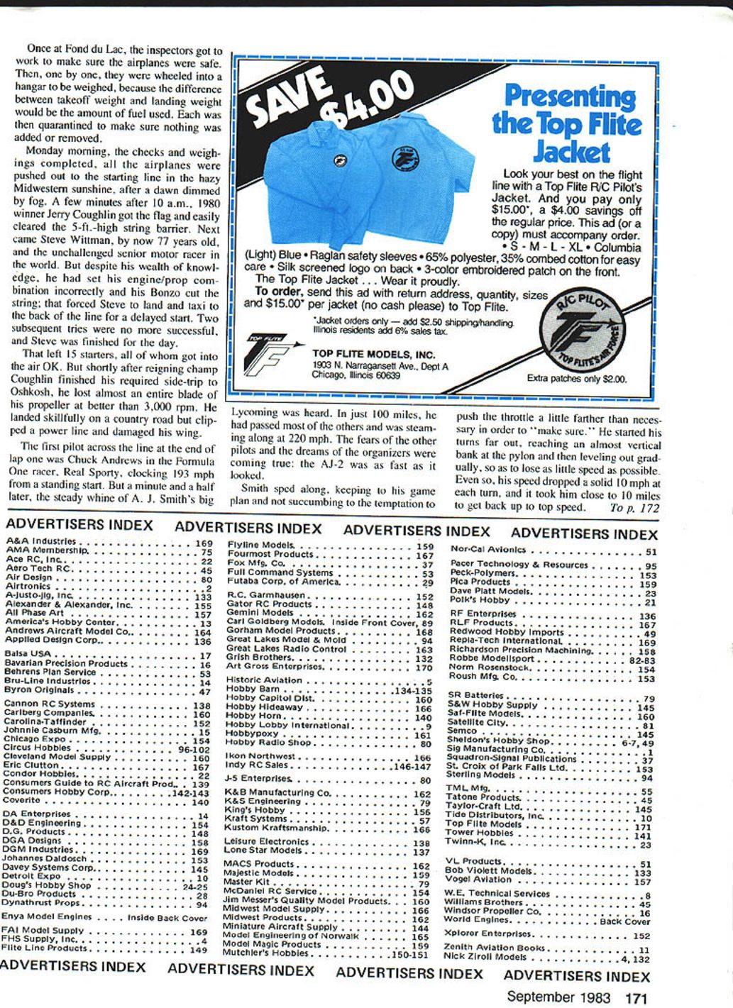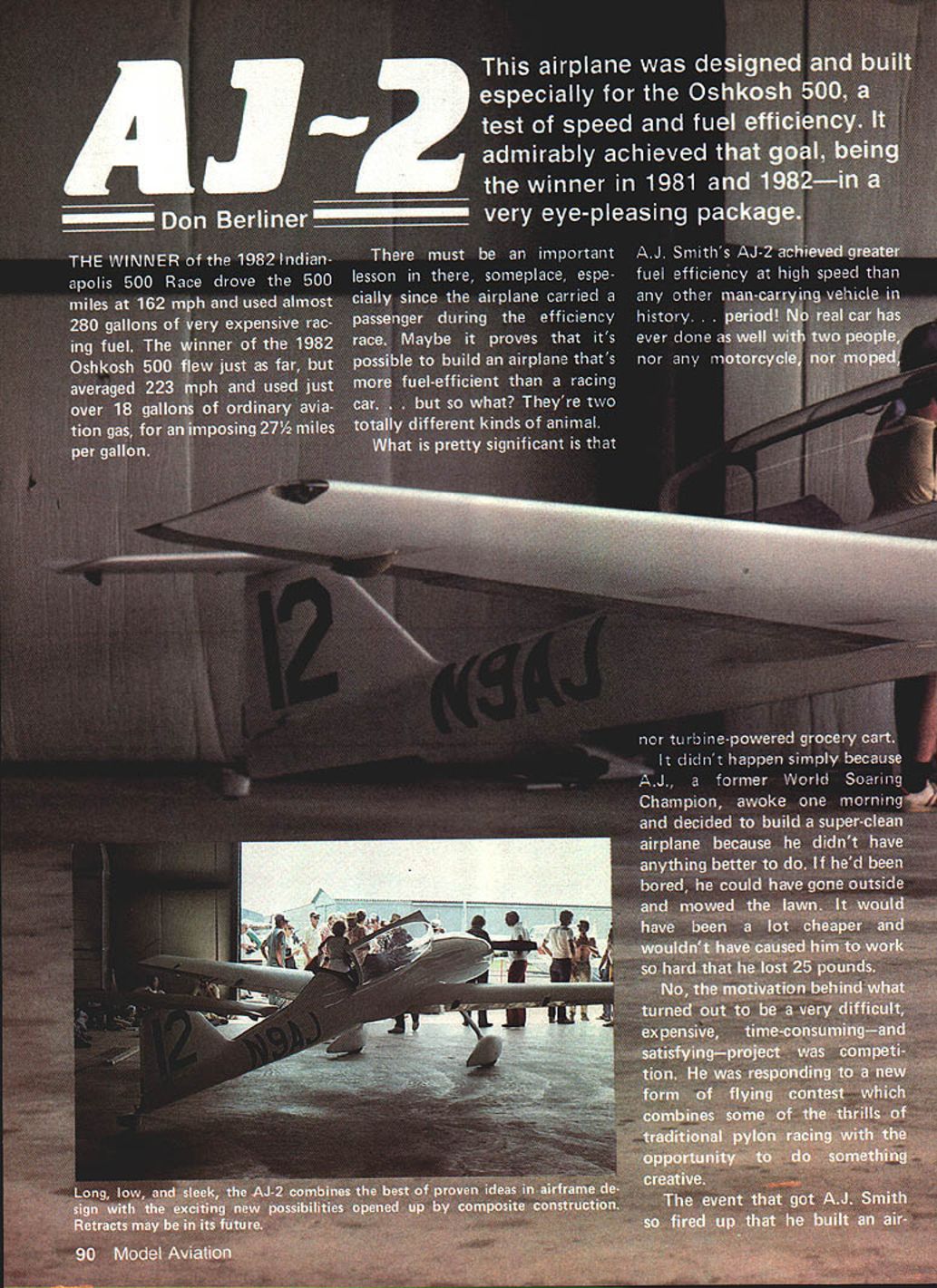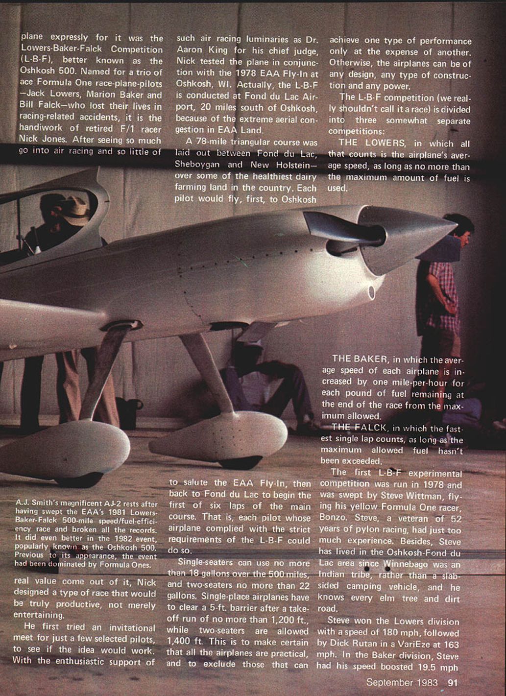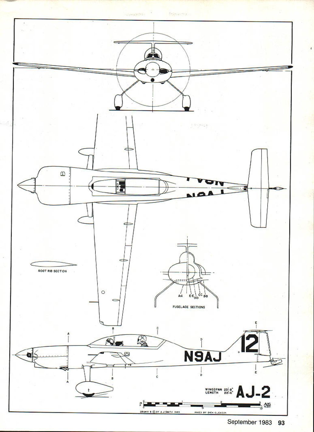 NO OCR TEXT NO OCR TEXT leftover fuel won 200 mph Rutan again second 169 mph Faick award also went Wittman fastest lap 195 mph far ahead Rutans 172 mph importantly contest did what supposed demonstrate clean well-designed well-tuned airplanes can fly very fast using lot fuel 1979 L-B-F opened entries drew nine airplanes including two Formula Ones three Rutan canards Mustang II Thorp T-18 Rand KR-2 one-of-a-kind Mead Adventure detailed results first com petition having published pilots could now plan flying prizes mind experience still key factor Wittman overall winner took Lowers award Left A tight cowling much inlet area absolutely necessary engine breathe cooled under racing cross-country conditions part formula Right Tired convinced hes right track J Smith takes time out after gruelling 500 miles Only fiberglass has received per fectionists touch can its contours end smooth its surface Note inten tionally rough surface wingthis boundary layer control record average speed 1977 mph second Baker 203 mph second Faick fastest lap 2025 mph Jerry Coughlin another Formula pilot Wisconsin won Baker score 206 mph having flown almost fast Wittman gallon less gas B C Roemer T-18 flew fastest single lap race 207 mph So far clean light Formula rac ers pretty much charge followed foam-and-fiberglass canards designed Burt Rutan others increasingly loud rumors about specially-designed airplanes nearing com pletion obvious no matter successful little racers could continue win once airplanes meant L-B-F appeared developing such airplane takes Its sort high-powered sailplane entire cockpit section shows AJs soaring background 92 Model Aviation landing gear wide keep wheels out propwash canopy low safety will permit T-tail offers lower drag greater stability conventional location -I 0 ROOT RIB SECTION A-AEE CC DC FUSELAGE SECTIONS E o2 NBAJ-E AC0 WINGSPAN 23B AJ -2 LENGTH226 2 198310 UNAWN B LI NT 44 SMITHINKED BY DICK GLEASON September 1983 93 model has molded rigid eurathane foam white epoxy jell coat surface picks up great amount detail Fuselage wings aileron fin rudder stabilizer elevator & cowl molded ready assembly installation equipment painting hardware including scale wheels struts extras Suggested List $285 Fact ery Direct $228 Send SASE brochure Great Lakes Model & mola ox 308TawasCity Ml 48763 WHY SETTLE FOR LESS can have PerformanCe/COflOmY Dynathrusts composite construction provides Unequaled Durability Saves moneyl 100% accurate pitch results Outstanding Performance Air Counts $700 $1000 s1400 15x 6 18x 6- 8"10 20x 6- 8- 10 _________22x 8-10 $1800 Prices inclede UPS sharges D MASTER CHARGE DVISA DCOD DOHECK DMONEY ORDER Dealers / DistributorS incited THRUST PROPS ING 2541 NE 11th Court Pompano Beach FL 33062 13059419119 lot time arent sets plans being sold therefore such project must begin reams paper upon scratched funny lines hopefully will day resemble airplane once design firm really ever material must purchased sawing hammering must start 1980 third running Osh kosh 500 being called 19 airplanes Fond du Lac 17 started contest just 10 minutes flagged away breaking string barrier Just 2 hours later winner crossed finish line time wasnt Steve Wittman rather Jerry Coughlin dark blue Cas sutt Racer well prepared old master could catch him Jerry won Lowers record 207 mph ac tual speed Baker record 2125 mph adjusted speed Falck record lap 2088 mph time four airplanes failed finish including Owl Racer Ralph Wise forced landing dirt road damage injury elevated him hero status Four other airplanes disqualified using fuel permitted L-B-F coming highly competitive used too much gas Chuck Andrews #68 Formula Real Sporty tried combine attempts FAI World Speed Records economy flying set records 100 kilometers 2218 mph 500 kilometers 2031 mph landed almost no gas oil me valuable experience 1981 Lowers-Baker-Falck Com petition came age Along 16 superb ly prepared airplanes types seen previous events stood out T-tailed low-wing monoplane painted bone white no markings save its black numbers near-perfect con tours surface smooth watch crystal Its wing particular may have flawless finish ever seen flying machine AJ-2 designed J Smith built crew experienced EAAers headed veteran designer/builder Leonard Niemi very much AJ Smith project intense studious competitor knew exactly what wanted get Theres nothing really radical about AJ-2 Its just beautiful combination proven elements wing has high aspect ratio efficiency 12% thick NACA 641-2l2 airfoil T-tail cleaner ordinary kind gives better stability con trol less subject ground effect canopy long low like seen finest sailplanes Construction increasingly popular composite materials combine high strength low weight can shaped finished greater degree accuracy just about other materials Design AJ-2 began earnest dur Continued page 1 70 94 Model Aviation Start Right FLEDGLING x Wingspan 56 23 40 Engines Designed Radio Control Flying Kit FS-29 TS SN Harvard 5195 63318 Span 11/2 Scale 60 Engine B/2-9 IbsReady fly product can II recommendSUPER HAND SANDER confidence HOBBIESTSee Hobby Dealer Y DEALERCa/l Distributor ANy ART GROSS ENTERPRISES 12516 MAPLEWOOD AVE EDMONDS WA 98020 starting point Horsepower ect airplane will fly like brick dont have good engine Whats wont achieve op timum trim until have great engine Its often too difficult distinguish between trim problems marginal horsepower problems particularly new un familiar airplane inexperienced Stunt flier may have real problem because weak engine may run perfectly should know Ive share Once have basic trim settings have pitch roll reasonably well adjusted some telltale signs can look spot inadequate engine Does airplane fall side other top wingover 2 Does airplane bobble drop outboard wing hard bottom inside corners particularly triangles hourglasses 3 lose line tension top segments square eight 4 Does airplane wander off course overhead eights 5 lose line tension first loop cloverleaf can related other problems