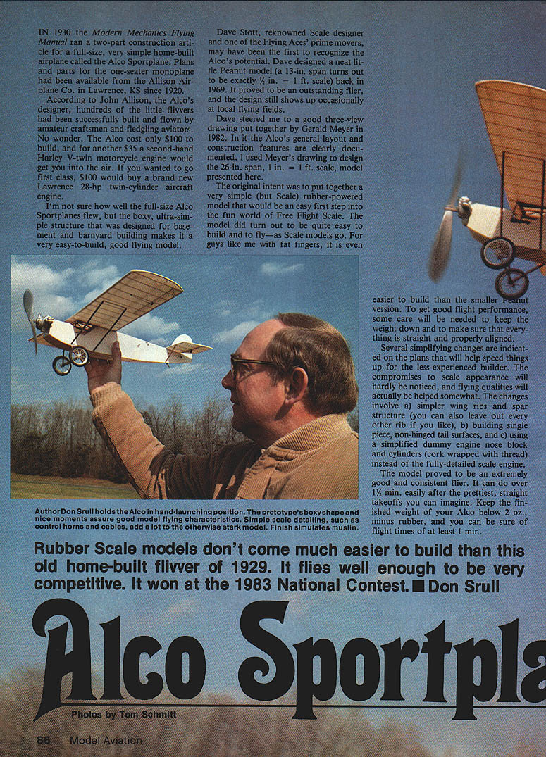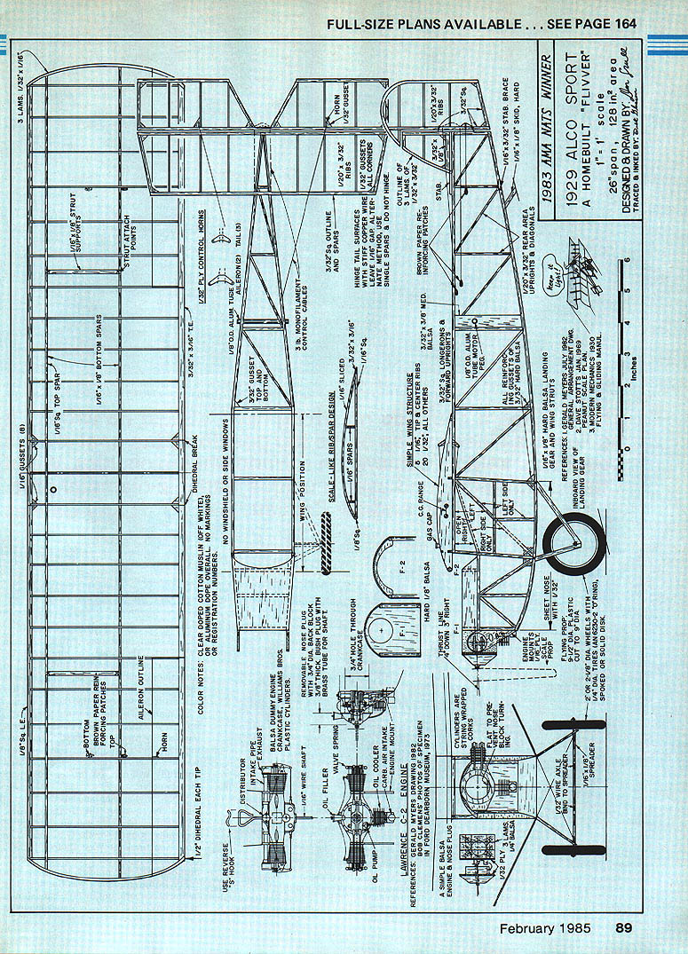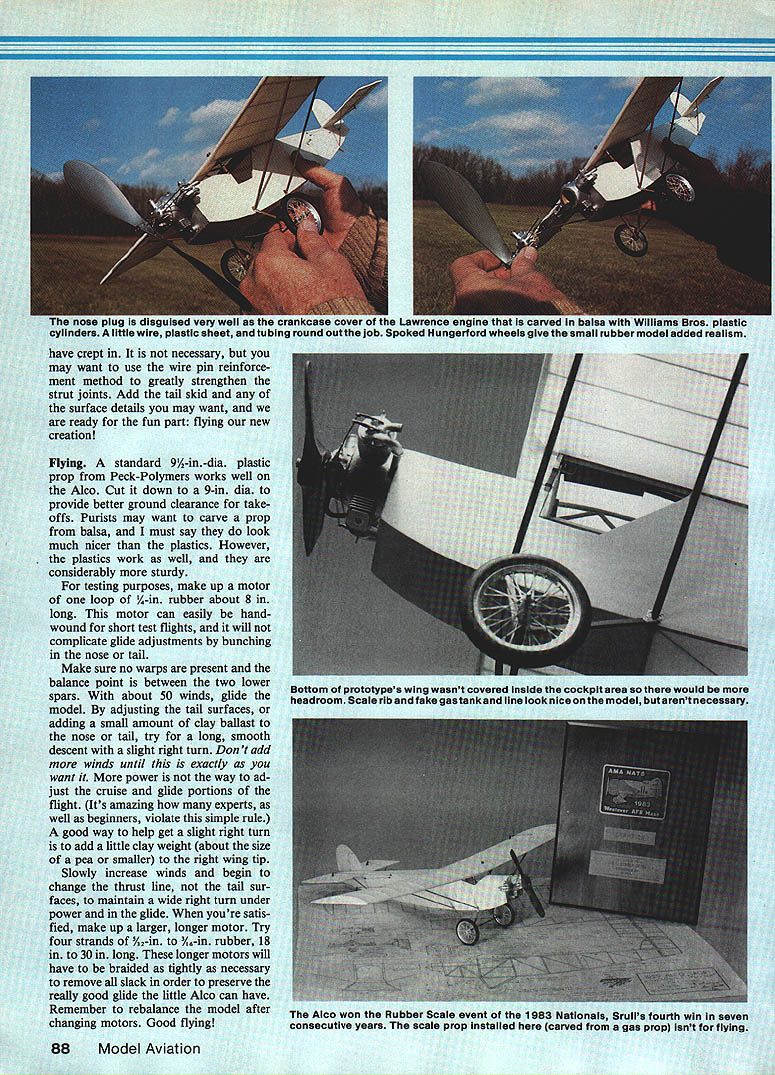 NO OCR TEXT NO OCR TEXT IU sheet tubing round out job Spoked Hungerford wheels .e arsa. ded r -have crept necessary may want use wire pin reinforce ment method greatly strengthen strut joints Add tail skid surface details may want ready fun part flying new creation Flying standard 91A-in-dia plastic prop Peck-Polymers works well Alco Cut down 9-in dia provide better ground clearance take offs Purists may want carve prop balsa must say look much nicer plastics However plastics work well considerably sturdy testing purposes make up motor loop A-in rubber about 8 long motor can easily handwound short test flights will complicate glide adjustments bunching nose tail Make sure no warps present balance point between two lower spars about 50 winds glide model adjusting tail surfaces adding small amount clay ballast nose tail try long smooth descent slight right turn Dont add winds until exactly want power way ad just cruise glide portions flight Its amazing experts well beginners violate simple rule good way help get slight right turn add little clay weight about size pea smaller right wing tip Slowly increase winds begin change thrust line tail sur faces maintain wide right turn under power glide youre satis fied make up larger longer motor Try four strands %2-in Y6-in rubber 18 30 long longer motors will have braided tightly necessary remove slack order preserve really good glide little Alco can have Remember rebalance model after changing motors Good flying 88Model Aviation Bottom prototypes wing wasnt covered inside cockpit area would headroom Scale rib fake gastankand line look nice model butarent necessary Alco won Rubber Scale event 1983 Nationals Sruils fourth win seven consecutive years scale prop installed carved gas prop isnt flying Eli VBS LE 1/16 GUSSETS 183 LAMS I/32x I/I6 0 I/I6Sq TOP SPAR I/I6x I/B STRUT SUPPORTS BOTTOM BROWN PAPER REINI/16x I/B BOTTOM SPARS FORCING PATCH S TOP TRUT ATTACH AILERON OUTLINE HORN 1/2 DIHEDRAL EACH TIPCOLOR NOTES CLEAR DOPED COTTON MUSLIN 10FF WHITE____________________ OR ALUMINUM DOPE OVERALL NO MARKINGS OR REGISTRATION NUMBERS USE REVERSE BALSA DUMMYENGINEI CRANKCASE WILLIAMS BROSI PLASTIC CYLINDERS 1/16 WIRE SHAFTREMOVABLE NOSE PLUG WITH 3/4 DIA BACK BLOCK 3/BTHICK BUSH PLUG WITH I ____________1 RIBSI/32GUSSE r [v32][b-1-10-1-10]]i/16SoWITH STIFF COPPER WIRE 1/32 GUSSETS L PUMPOIL COOLER SINGLE SPARS S DO NOT HINGErn LAWRENCEC-2 NE-u REFERENCES GERALD MYERS DRAWING 1982 BOB cLEMENS PHOTOS OF SPECIMEN IN FORD DEARBORMUSEUM 1973HARD B BALSAGAS 20 V32 ALL OTHERS3/32x 3/B MEDINFORCING PATCHESZ 3/32jcI/20i 3/32 SIMPLE BALSA ENGINE B NOSE PLUG w IBLOCK CDII/16x 3/32 STAB BRACE 03/32 HARD BALSA II/16x I/B SKID HARDrn C I SCALESHEET NOSEI/16x V8 HARD BALSA LANDING1983 AMA HATS WINNER rn CD TII/I6 1/82OR 2-1/B CUT TO 9 DIA ARD VIEW OF STOTTS JAN 1969 9 LC 0 S P0 R T DIA WHEELS WITHIMODERN MECHANICS 1930A HOMEBUILT FLIVVER _____________________________26span 1281nareaTn ______________________-a 0123456 InchOsTRACED S INKED BY __ II