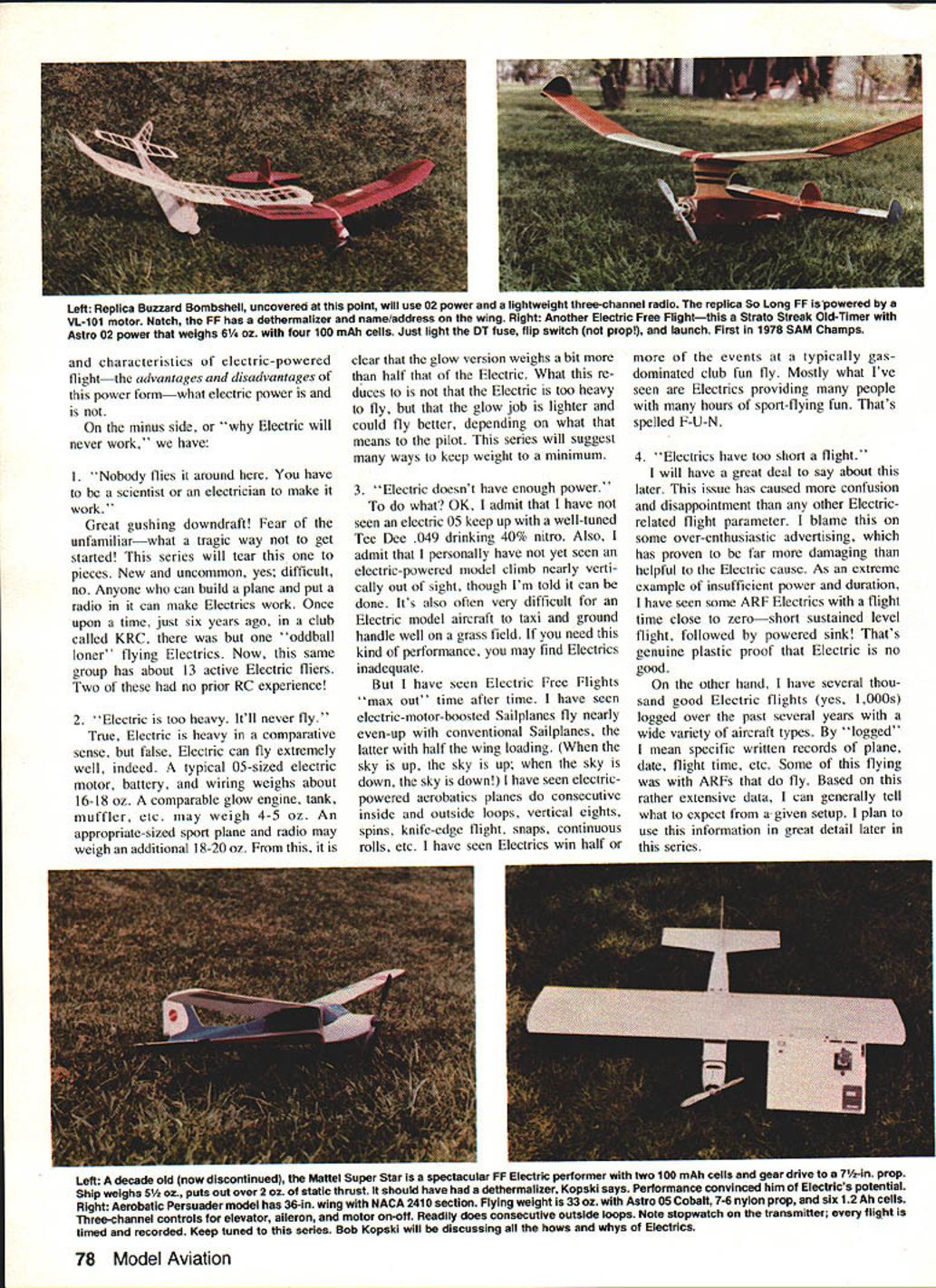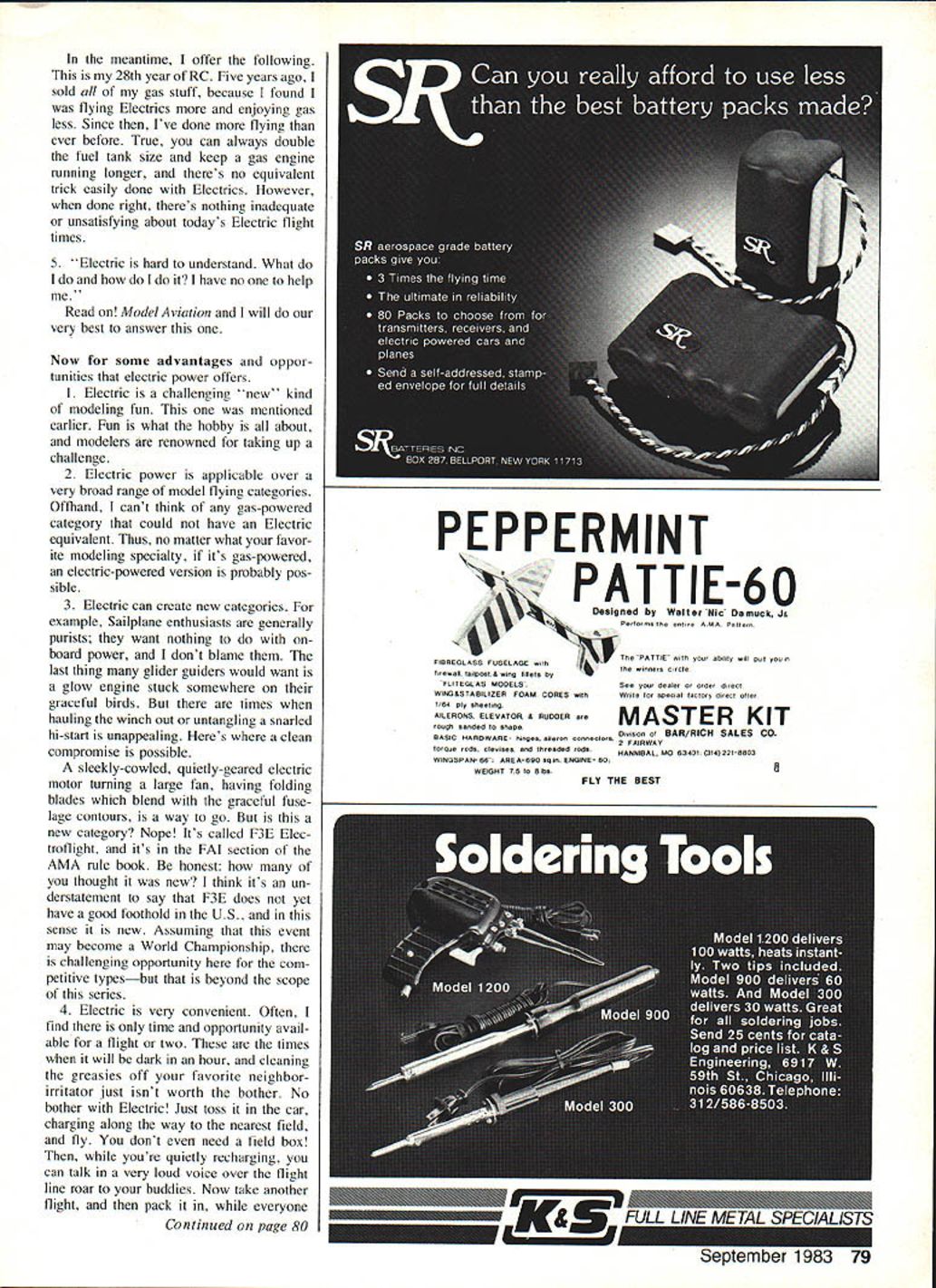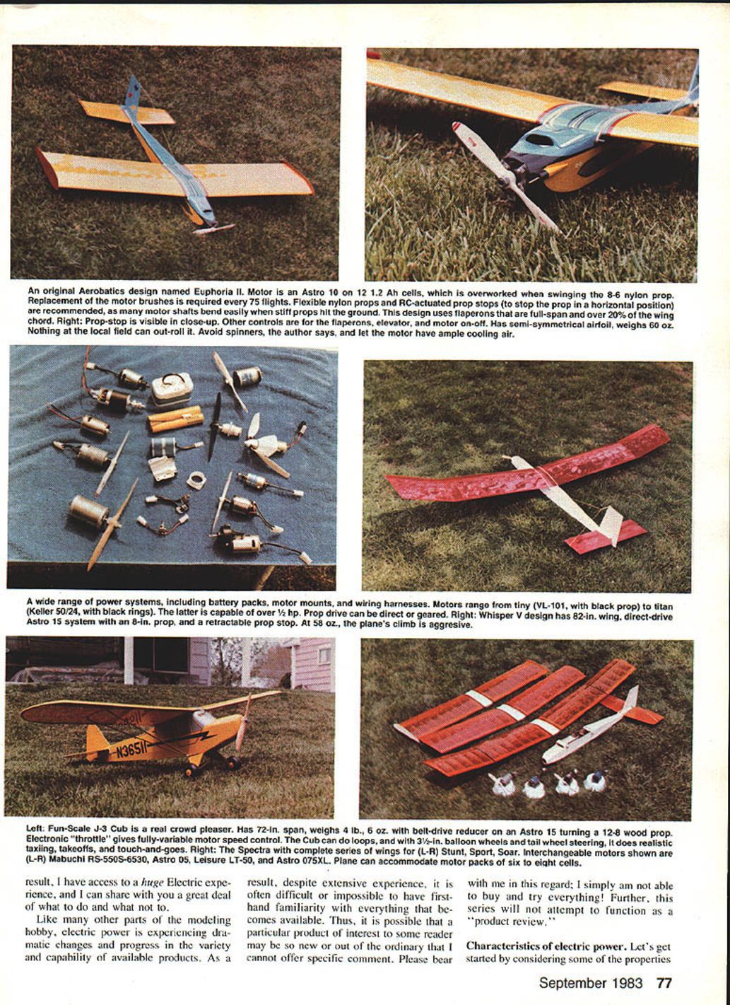 uhF 1111111 Part mans present fleet Electrics includes Radio Control Free Flightwith subdivisions Soaring Scale Aerobatics Old-Timers everyday sport flying authors earlier Electrics now owned flown others Keystone AC Club AEROMODELING wondrous hobby sport Take look through pages magazine consider large variety specialized modeling interests Too often lose sight forms model building flying can take Free Flight Radio Control Control Line indoor outdoor flying rubber power CO-2 gas en gines hand launching towline dura tion aerobatics Scale Helicopters Com bat Old-Timers Pylon Racing on varieties combinations make up wonderful matrix modeling fun Some specialities have around long timeHand-Launched Glider Free Flight Gas instance Others relatively new RC Helicopters Giant Scale Some model power sources well-established like rubber gas newest model power source electric difficult say old electric Im sure some unknown pioneering modeler dabbling power source long ago practical pur poses however think its reasonably safe say electric power US about decade old because early Seventies Boucher brothers offered workable production electric power systems modeling use about same time fantastic toy Mattel Super Star marketed electricpowered wonder could flown either Free Flight tether incredible performer did use tether found out convinced no question mind electric-powered model aircraft impres sive capability now capability popularity will grow come significant part modeling fu ture some electric power may become future all-too-familiar loss fields due noise continues others electric power can source renewed fun exciting complement alterna tive present interests have seen people get hobby first time because electric power other end scale some older folks have long retired hobby now tracted back ease convenience Electrics Now know electric power has around awhile its viable capable model power source its fun part hobby whats stopping giving try its what Electrics please continue reading series intended introduce basics electric-powered flight will sume reader has either no prior Electric experience worse disap pointing specific goal help assure interested trying Electrics will enjoy immediate success examples applications dis cussed will based electric-powered RC aircraft information applicable both Free Flight Control Line As appears now will probably several-part series culminating construc tion project RC model presented will multi-purpose design can built sport stunt soaring capa ble utilizing wide variety motor battery combinations design known SpectraSport Stunt Soar proven has flown members Keystone RC Club Hatfield PA host club annual Electric Fly will policy writer pre sent experience-guided information techniques As writing am begin ning eleventh year electric-powered flying have shared years numerous local Electric fliers As 76 Model Aviation An original Aerobatics design named Euphoria II Motor Astro 10 12 12 Ah cells overworked swinging 8-6 nylon prop Replacement motor brushes required 75 flights Flexible nylon props RC-actuated prop stops stop prop horizontal position recommended motor shafts bend easily stiff props hit ground design uses flaperons full-span over 20% wing chord Right Prop-stop visible close-up Other controls flaperons elevator motor on-oft Has semi-symmetrical airfoil weighs 60 oz Nothing local field can out-roll Avoid spinners author says let motor have ample cooling air wide range power systems including battery packs motor mounts wiring harnesses Motors range tiny VL-101 black prop titan Keller 50/24 black rings latter capable over rop drive can direct geared Right Whisper V design has 82-in wing direct-drive Astro 15 system 8-in prop retractable prop stop 58 oz planes climb aggresive Left Fun-Scale J-3 Cub real crowd pleaser Has 72-in span weighs 4 lb 6 oz belt-drive reducer Astro 15 turning 12-8 wood prop Electronic throttle gives fully-variable motor speed control Cub can loops 31/2-in balloon wheels tail wheel steering does realistic taxiing takeoffs touch-and-goes Right Spectra complete series wings L-R Stunt Sport Soar Interchangeable motors shown L-R Mabuchi RS-5505-6530 Astro 05 Leisure LT-50 Astro 075XL Plane can accommodate motor packs six eiqht cells result have access huge Electric expe rience can share great deal what what Like other parts modeling hobby electric power experiencing dra matic changes progress variety capability available products As result despite extensive experience regard simply am able often difficult impossible have first- buy try everything Further hand familiarity everything be- series will attempt function comes available Thus possible product review particular product interest some reader may new out ordinary Characteristics ot electric power Lets get cannot offer specific comment Please bear started considering some properties September 1983 77 Left Replica Buzzard Bombshell uncovered point will use 02 power lightweight three-channel radio replica So Long FF powered VL-1O1 motor Natch FF has dethermalizer name/address wing Right Another Electric Free Flightthis Strato Streak Old-Timer Astro 02 power weighs 61/4 OZ four 100 mAh cells Just light DT fuse flip switch prop launch First 1978 SAM Champs characteristics electric-powered flightthe advantages disadvantages power formwhat electric power is minus side Electric will never work have I Nobody flies around have scientist electrician make work Great gushing downdraft Fear unfamiliarwhat tragic way get started series will tear pieces New uncommon yes difficult no Anyone can build plane put radio can make Electrics work Once upon time just six years ago club called KRC oddball loner flying Electrics Now same group has about 13 active Electric fliers Two no prior RC experience 2 Electric too heavy Itll never fly True Electric heavy comparative sense false Electric can fly extremely well indeed typical 05-sized electric motor battery wiring weighs about 16-18 oz comparable glow engin