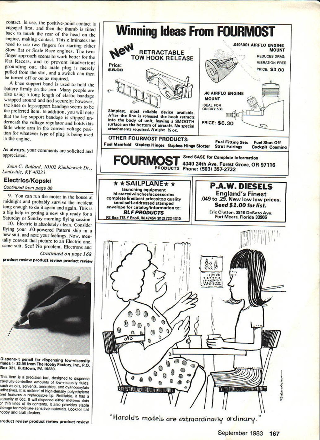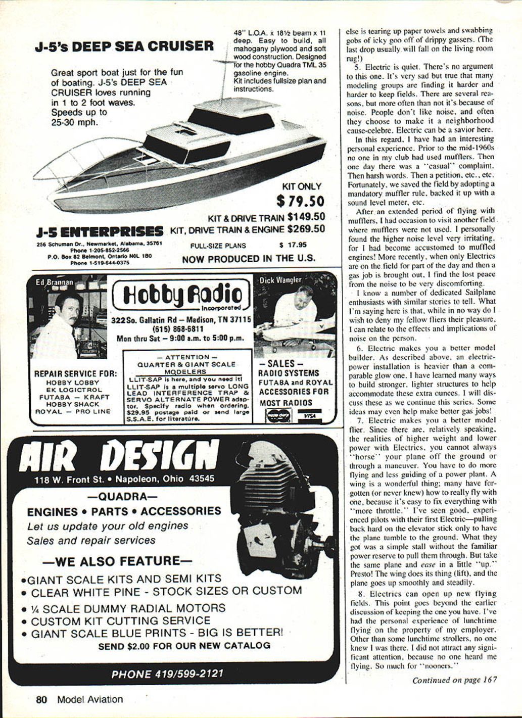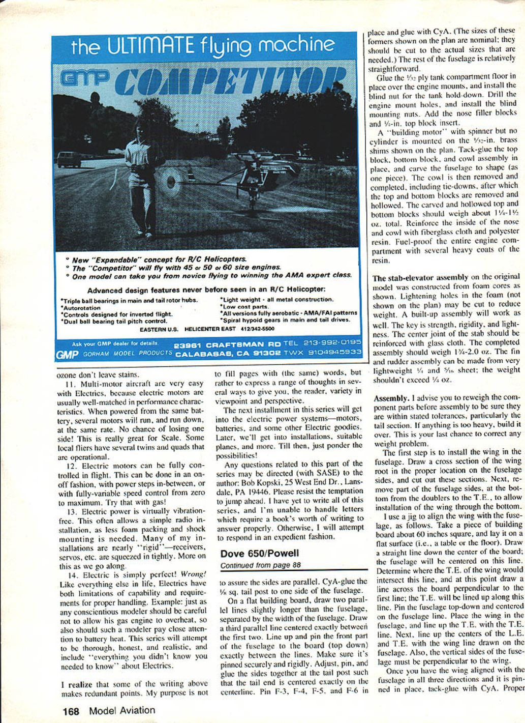 uhF 1111111 Part mans present fleet Electrics includes Radio Control Free Flightwith subdivisions Soaring Scale Aerobatics Old-Timers everyday sport flying authors earlier Electrics now owned flown others Keystone AC Club AEROMODELING wondrous hobby sport Take look through pages magazine consider large variety specialized modeling interests Too often lose sight forms model building flying can take Free Flight Radio Control Control Line indoor outdoor flying rubber power CO-2 gas en gines hand launching towline dura tion aerobatics Scale Helicopters Com bat Old-Timers Pylon Racing on varieties combinations make up wonderful matrix modeling fun Some specialities have around long timeHand-Launched Glider Free Flight Gas instance Others relatively new RC Helicopters Giant Scale Some model power sources well-established like rubber gas newest model power source electric difficult say old electric Im sure some unknown pioneering modeler dabbling power source long ago practical pur poses however think its reasonably safe say electric power US about decade old because early Seventies Boucher brothers offered workable production electric power systems modeling use about same time fantastic toy Mattel Super Star marketed electricpowered wonder could flown either Free Flight tether incredible performer did use tether found out convinced no question mind electric-powered model aircraft impres sive capability now capability popularity will grow come significant part modeling fu ture some electric power may become future all-too-familiar loss fields due noise continues others electric power can source renewed fun exciting complement alterna tive present interests have seen people get hobby first time because electric power other end scale some older folks have long retired hobby now tracted back ease convenience Electrics Now know electric power has around awhile its viable capable model power source its fun part hobby whats stopping giving try its what Electrics please continue reading series intended introduce basics electric-powered flight will sume reader has either no prior Electric experience worse disap pointing specific goal help assure interested trying Electrics will enjoy immediate success examples applications dis cussed will based electric-powered RC aircraft information applicable both Free Flight Control Line As appears now will probably several-part series culminating construc tion project RC model presented will multi-purpose design can built sport stunt soaring capa ble utilizing wide variety motor battery combinations design known SpectraSport Stunt Soar proven has flown members Keystone RC Club Hatfield PA host club annual Electric Fly will policy writer pre sent experience-guided information techniques As writing am begin ning eleventh year electric-powered flying have shared years numerous local Electric fliers As 76 Model Aviation An original Aerobatics design named Euphoria II Motor Astro 10 12 12 Ah cells overworked swinging 8-6 nylon prop Replacement motor brushes required 75 flights Flexible nylon props RC-actuated prop stops stop prop horizontal position recommended motor shafts bend easily stiff props hit ground design uses flaperons full-span over 20% wing chord Right Prop-stop visible close-up Other controls flaperons elevator motor on-oft Has semi-symmetrical airfoil weighs 60 oz Nothing local field can out-roll Avoid spinners author says let motor have ample cooling air wide range power systems including battery packs motor mounts wiring harnesses Motors range tiny VL-101 black prop titan Keller 50/24 black rings latter capable over rop drive can direct geared Right Whisper V design has 82-in wing direct-drive Astro 15 system 8-in prop retractable prop stop 58 oz planes climb aggresive Left Fun-Scale J-3 Cub real crowd pleaser Has 72-in span weighs 4 lb 6 oz belt-drive reducer Astro 15 turning 12-8 wood prop Electronic throttle gives fully-variable motor speed control Cub can loops 31/2-in balloon wheels tail wheel steering does realistic taxiing takeoffs touch-and-goes Right Spectra complete series wings L-R Stunt Sport Soar Interchangeable motors shown L-R Mabuchi RS-5505-6530 Astro 05 Leisure LT-50 Astro 075XL Plane can accommodate motor packs six eiqht cells result have access huge Electric expe rience can share great deal what what Like other parts modeling hobby electric power experiencing dra matic changes progress variety capability available products As result despite extensive experience regard simply am able often difficult impossible have first- buy try everything Further hand familiarity everything be- series will attempt function comes available Thus possible product review particular product interest some reader may new out ordinary Characteristics ot electric power Lets get cannot offer specific comment Please bear started considering some properties September 1983 77 Left Replica Buzzard Bombshell uncovered point will use 02 power lightweight three-channel radio replica So Long FF powered VL-1O1 motor Natch FF has dethermalizer name/address wing Right Another Electric Free Flightthis Strato Streak Old-Timer Astro 02 power weighs 61/4 OZ four 100 mAh cells Just light DT fuse flip switch prop launch First 1978 SAM Champs characteristics electric-powered flightthe advantages disadvantages power formwhat electric power is minus side Electric will never work have I Nobody flies around have scientist electrician make work Great gushing downdraft Fear unfamiliarwhat tragic way get started series will tear pieces New uncommon yes difficult no Anyone can build plane put radio can make Electrics work Once upon time just six years ago club called KRC oddball loner flying Electrics Now same group has about 13 active Electric fliers Two no prior RC experience 2 Electric too heavy Itll never fly True Electric heavy comparative sense false Electric can fly extremely well indeed typical 05-sized electric motor battery wiring weighs about 16-18 oz comparable glow engin