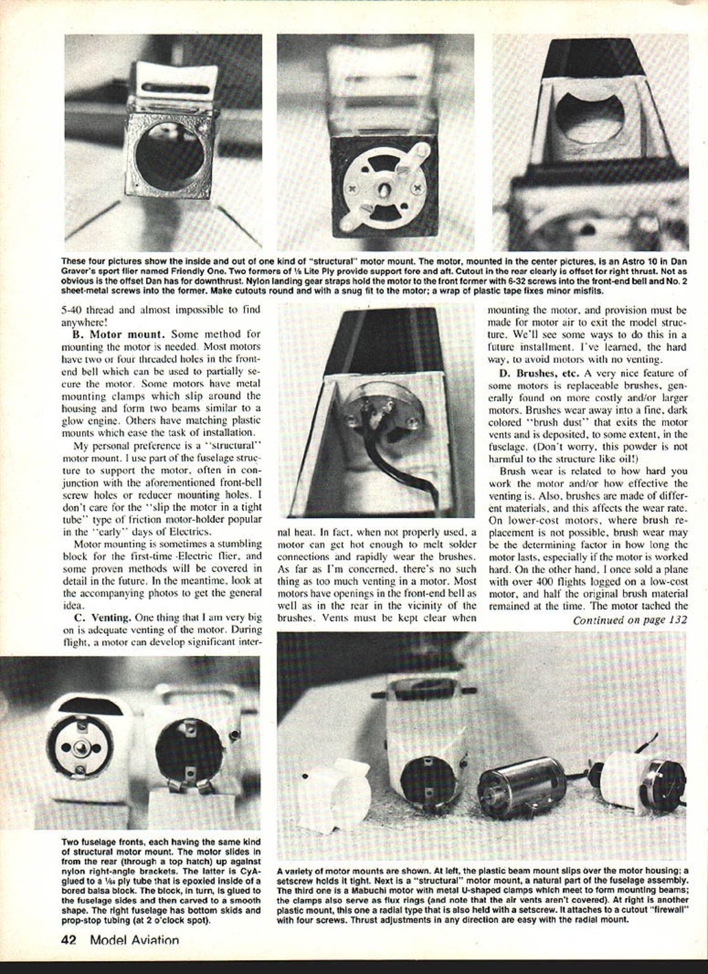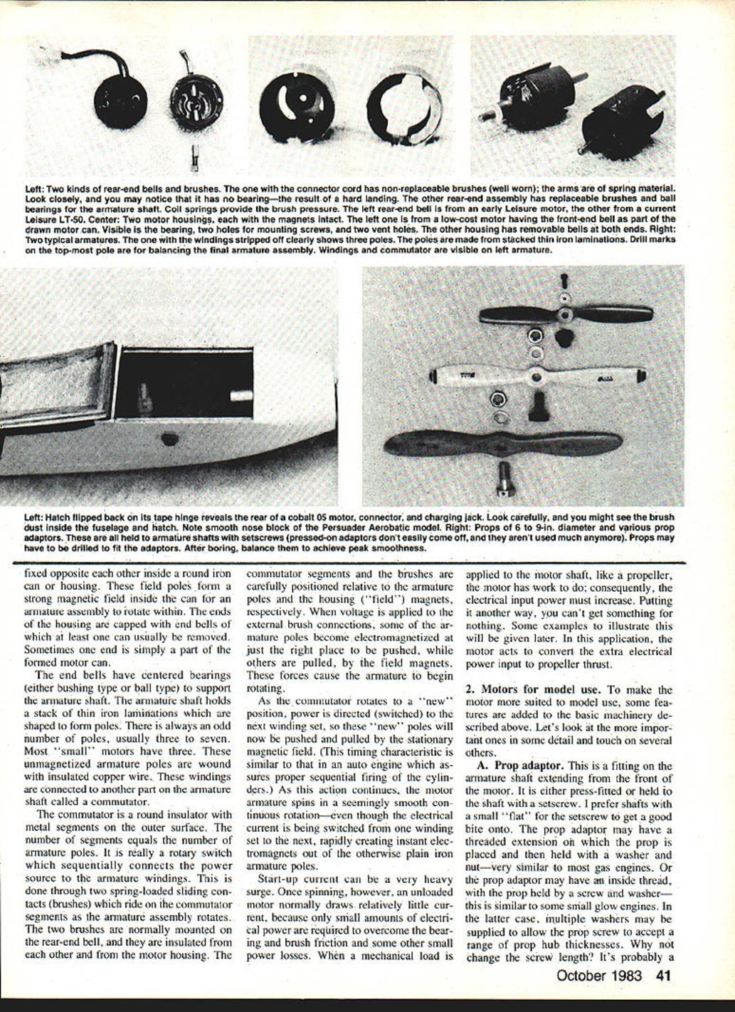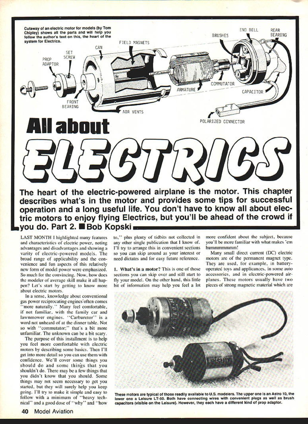 Cutaway electric motor models Tom Chipley shows parts will help follow authors text heart system Electrics CAN SET SCREW ADAP FRONT BEARING about FIELD MAGNETS END BELLREAR BRUSHESBEARING 3 N\~ COMMUTATOR_ ARMATURE_CAPACITOR V. POLARIZED CONNECTOR w w w heart electric-powered airplane motor chapter describes whats motor provides some tips successful operation long useful life dont have know about elec tric motors enjoy flying Electrics youll ahead crowd Part 2 U Bob Kopski LAST MONTH highlighted features characteristics electric power noting advantages disadvantages showing varity electric-powered models broad range applicability con venience fun aspects relatively new form model power emphasized So much convincing Now does modeler average skill make hap pen Lets start getting know about electric motors sense knowledge about conventional gas power reciprocating enginesoften comes naturally feel comfortable familiar family car lawnmower engines Carburetor word unheard dinner table commutator thats bit unfamiliar unknown can bit scary purpose installment help feel comfortable electric motors describing some basics Ill get detail can use confidence Well cover some things should some things shouldnt may few things didnt know should Some things may seem necessary get started will surely help keep going Ill try make simple easy follow minimum heavy tech nical good dose plus plenty tidbits collected other single publication know Ill try arrange convenient sections can skip around interest need dictates easy future reference 1 Whats motor sections can skip over still start fly model other hand little bit information may help feel lot confident about subject because youll familiar what makes em hummmmmmm small direct current DC electric motors permanent magnet type used example batteryoperated toys applicances some auto accessories electric-powered air planes motors usually have two pieces strong magnetic material 40 Model Aviation motors typical readily available US modelers upper Astro 10 lower Leisure LT-50 Both have connecting wires convenient plugs well brush capacitors visible Leisure However have different kind prop adaptor i SQ Left Two kinds rear-end bells brushes connector cord has non-replaceable brushes well worn arms spring material Look closely may notice has no bearingthe result hard landing other rear-end assembly has replaceable brushes ball bearings armature shaft Coil springs provide bruah pressure left rear-end bell early Leisure motor other current Leisure LT-50 Center Two motor housings magnets intact left low-cost motor having front-end bell part drawn motor can Visible bearing two boles mounting screws two vent holes other housing has removable bells both ends Right Two typical armatures windings stripped oft clearly shows three poles poles made stacked thin iron laminations Drill marks top-most pole balancing final armature assembly Windings commutator visible left armature Left Hatch flipped back its tape hinge reveals rear cobalt 05 motor connector charging jack Look carefully might see brush dust inside fuselage hatch Note smooth nose block Persuader Acrobatic model Right Props 6 9-in diameter various prop adaptors held armature shafts setscrews pressed-on adaptors dont easily come off arent used much anymore Props may have drilled fit adaptors After boring balance achieve peak smoothness fixed opposite other inside round iron can housing field poles form strong magnetic field inside can armature assembly rotate within ends housing capped end bells ai least can usually removed Sometimes end simply part formed motor can end bells have centered bearings either bushing type ball type support armature shaft armature shaft holds stack thin iron laminations shaped form poles always odd number poles usually three seven Most small motors have three unmagnetized armature poles wound insulated copper wire. windings connected another part armature shaft called commutator commutator round insulator metal segments outer surface number segments equals number armature poles really rotary switch sequentially connects power source armature windings done through two spring-loaded sliding con tacts brushes ride ihe commutator segments armature assembly rotates two brushes normally mounted rear-end bell insulated other motor housing commutator segments bi-ushes carefully positioned relative armature poles housing field magnets respectively voltage applied external brush connections some ar mature polcs become electromagnetized just right place pushed others pulled field magnets forces cause armature begin rotating As commutator rotates new position power directed switched next winding set new poles will now pushed pulled stationary magnetic field timing characteristic similar auto engine sures proper sequential firing cylin ders As action continues motor armature spins seemingly smooth con tinuous rotationeven though electrical current being switched winding set next rapidly creating instant elec tromagnets out otherwise plain iron armature poles Start-up current can very heavy surge Once spinning however unloaded motor normally draws relatively little cur rent because sniall amounts electri cal power required overcome bear ing brush friction some other small power losses mechanical load applied motor shaft like propeller motor has work consequently electrical input power must increase Putting another way cant get something nothing Some examples illustrate will given later tn application motor acts convert extra electrical power input propeller thrust 2 Motors model use make motor suited model use some fea tures added basic machinery de scribed above Lets look impor tant ones some detail touch several others Prop adaptor fitting armature shaft extflding front motor either press-fitted held io shaft setscrew prefer shafts small flat setscrew get good bite onto prop adaptor may have threaded extension oh Which prop placed held washer nutvery similar gas engines prop adaptor may have inside 