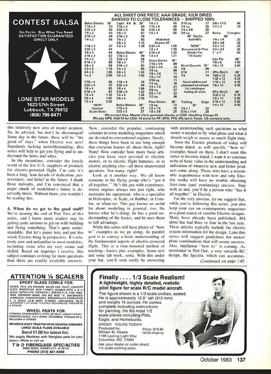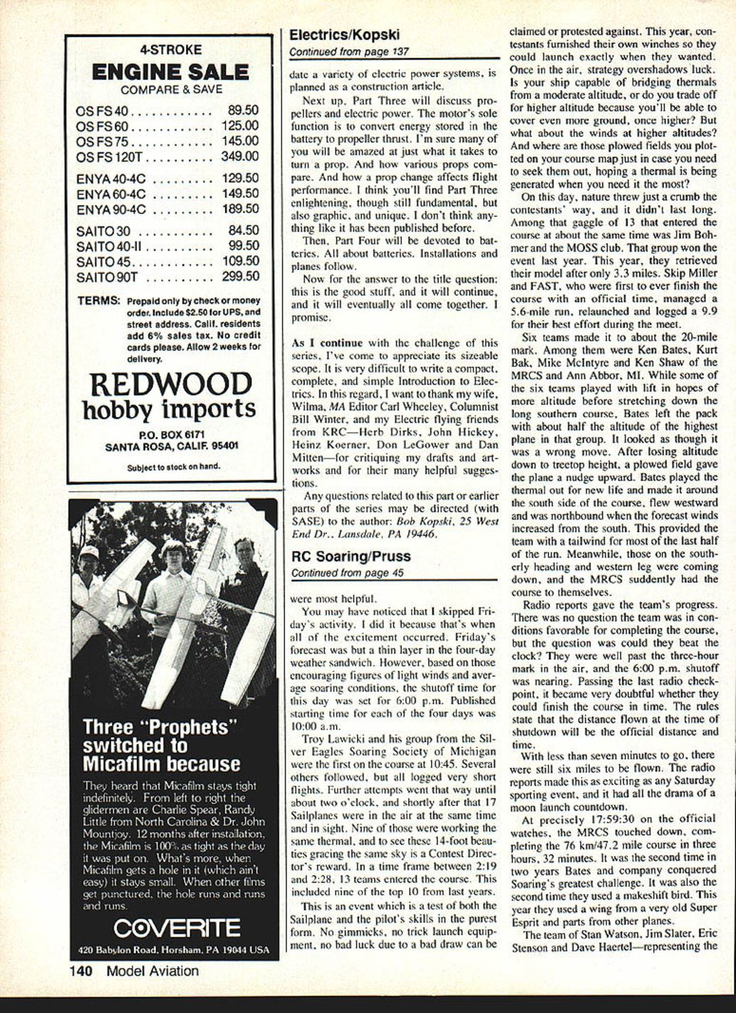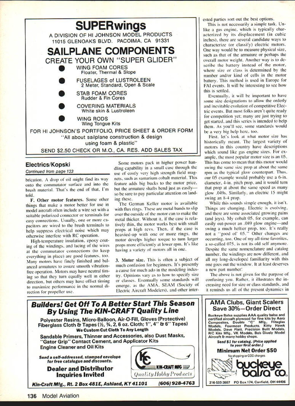 Cutaway electric motor models Tom Chipley shows parts will help follow authors text heart system Electrics CAN SET SCREW ADAP FRONT BEARING about FIELD MAGNETS END BELLREAR BRUSHESBEARING 3 N\~ COMMUTATOR_ ARMATURE_CAPACITOR V. POLARIZED CONNECTOR w w w heart electric-powered airplane motor chapter describes whats motor provides some tips successful operation long useful life dont have know about elec tric motors enjoy flying Electrics youll ahead crowd Part 2 U Bob Kopski LAST MONTH highlighted features characteristics electric power noting advantages disadvantages showing varity electric-powered models broad range applicability con venience fun aspects relatively new form model power emphasized So much convincing Now does modeler average skill make hap pen Lets start getting know about electric motors sense knowledge about conventional gas power reciprocating enginesoften comes naturally feel comfortable familiar family car lawnmower engines Carburetor word unheard dinner table commutator thats bit unfamiliar unknown can bit scary purpose installment help feel comfortable electric motors describing some basics Ill get detail can use confidence Well cover some things should some things shouldnt may few things didnt know should Some things may seem necessary get started will surely help keep going Ill try make simple easy follow minimum heavy tech nical good dose plus plenty tidbits collected other single publication know Ill try arrange convenient sections can skip around interest need dictates easy future reference 1 Whats motor sections can skip over still start fly model other hand little bit information may help feel lot confident about subject because youll familiar what makes em hummmmmmm small direct current DC electric motors permanent magnet type used example batteryoperated toys applicances some auto accessories electric-powered air planes motors usually have two pieces strong magnetic material 40 Model Aviation motors typical readily available US modelers upper Astro 10 lower Leisure LT-50 Both have connecting wires convenient plugs well brush capacitors visible Leisure However have different kind prop adaptor i SQ Left Two kinds rear-end bells brushes connector cord has non-replaceable brushes well worn arms spring material Look closely may notice has no bearingthe result hard landing other rear-end assembly has replaceable brushes ball bearings armature shaft Coil springs provide bruah pressure left rear-end bell early Leisure motor other current Leisure LT-50 Center Two motor housings magnets intact left low-cost motor having front-end bell part drawn motor can Visible bearing two boles mounting screws two vent holes other housing has removable bells both ends Right Two typical armatures windings stripped oft clearly shows three poles poles made stacked thin iron laminations Drill marks top-most pole balancing final armature assembly Windings commutator visible left armature Left Hatch flipped back its tape hinge reveals rear cobalt 05 motor connector charging jack Look carefully might see brush dust inside fuselage hatch Note smooth nose block Persuader Acrobatic model Right Props 6 9-in diameter various prop adaptors held armature shafts setscrews pressed-on adaptors dont easily come off arent used much anymore Props may have drilled fit adaptors After boring balance achieve peak smoothness fixed opposite other inside round iron can housing field poles form strong magnetic field inside can armature assembly rotate within ends housing capped end bells ai least can usually removed Sometimes end simply part formed motor can end bells have centered bearings either bushing type ball type support armature shaft armature shaft holds stack thin iron laminations shaped form poles always odd number poles usually three seven Most small motors have three unmagnetized armature poles wound insulated copper wire. windings connected another part armature shaft called commutator commutator round insulator metal segments outer surface number segments equals number armature poles really rotary switch sequentially connects power source armature windings done through two spring-loaded sliding con tacts brushes ride ihe commutator segments armature assembly rotates two brushes normally mounted rear-end bell insulated other motor housing commutator segments bi-ushes carefully positioned relative armature poles housing field magnets respectively voltage applied external brush connections some ar mature polcs become electromagnetized just right place pushed others pulled field magnets forces cause armature begin rotating As commutator rotates new position power directed switched next winding set new poles will now pushed pulled stationary magnetic field timing characteristic similar auto engine sures proper sequential firing cylin ders As action continues motor armature spins seemingly smooth con tinuous rotationeven though electrical current being switched winding set next rapidly creating instant elec tromagnets out otherwise plain iron armature poles Start-up current can very heavy surge Once spinning however unloaded motor normally draws relatively little cur rent because sniall amounts electri cal power required overcome bear ing brush friction some other small power losses mechanical load applied motor shaft like propeller motor has work consequently electrical input power must increase Putting another way cant get something nothing Some examples illustrate will given later tn application motor acts convert extra electrical power input propeller thrust 2 Motors model use make motor suited model use some fea tures added basic machinery de scribed above Lets look impor tant ones some detail touch several others Prop adaptor fitting armature shaft extflding front motor either press-fitted held io shaft setscrew prefer shafts small flat setscrew get good bite onto prop adaptor may have threaded extension oh Which prop placed held washer nutvery similar gas engines prop adaptor may have inside 