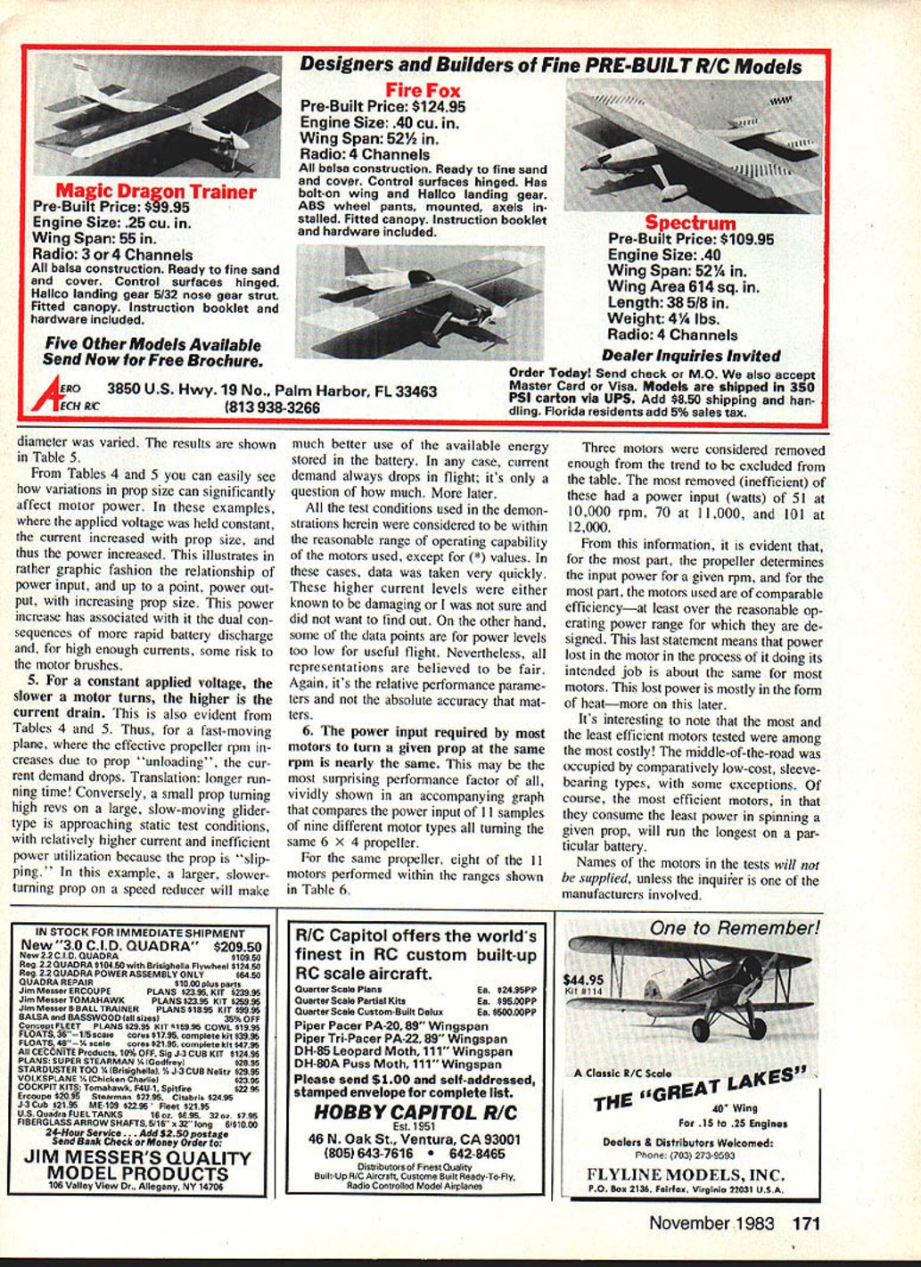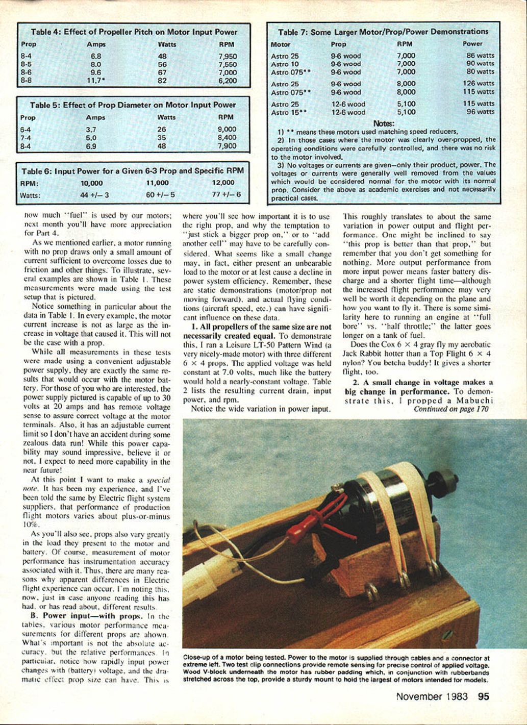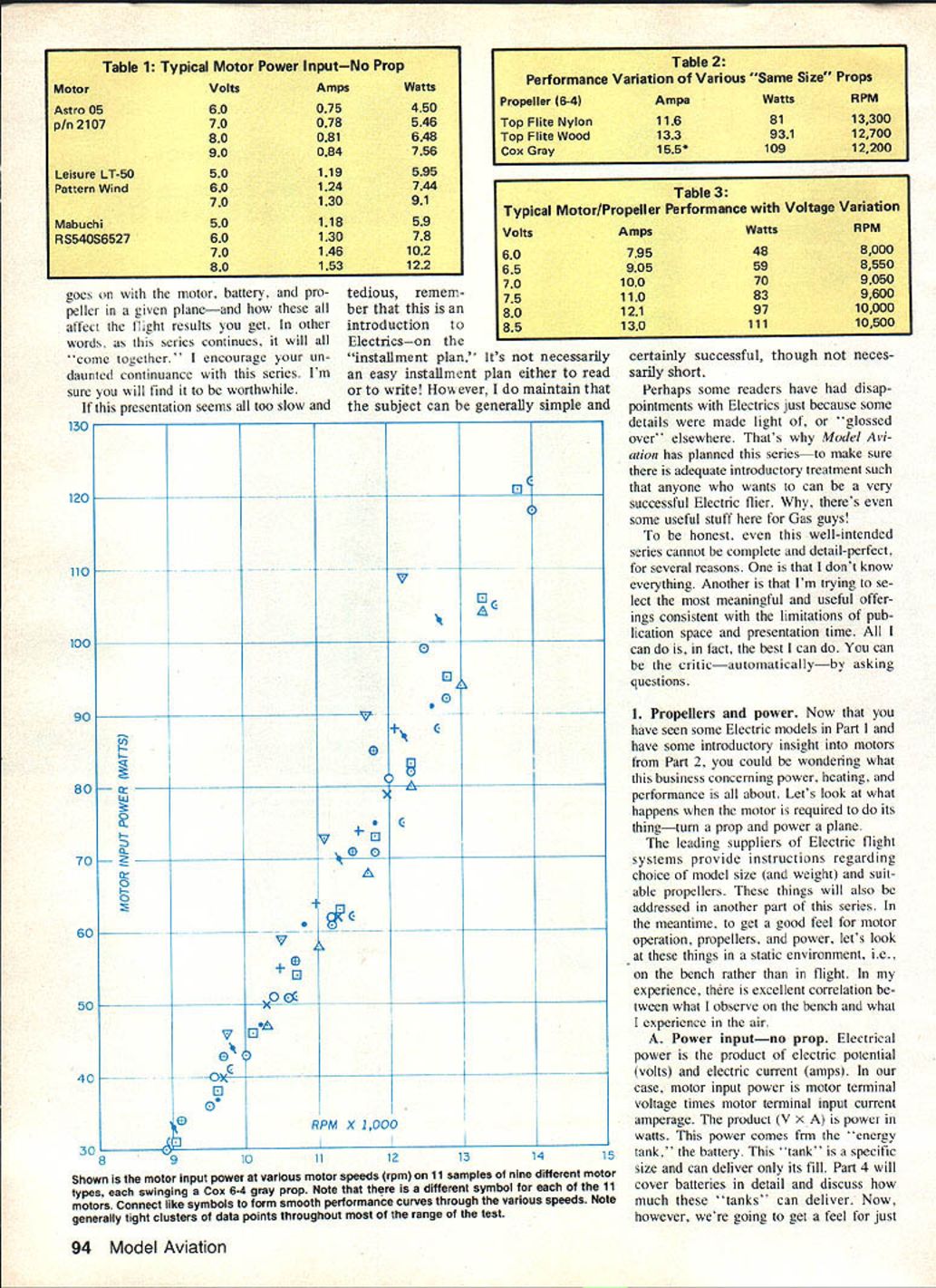 This authors testing setup evaluation motors props results shown tables discussed text power supply fully adjustable zero 30 volts up 20 amperes two digital readouts motor voltage current analog meter tachometer optical pickup remotely located under motor mount Light source also remotely located Photos author THE FIRST INSTALLMENT series September issue described some pros cons electric-powered models last month covered motors use Some basic aspects motors de scribed practical considerations covered Earlier asked have faith read daringly onward remind because realize subject part may appear both simple some strange others However think some up coming information will surprising interesting manyand perhaps little confusing ditficult others first reading still others some what fol lows may downright boring seem totally irrelevant taken alone section however combined ether parts series will provide very intimate overall feel exactly what \Ki O iOE ra popellor rave electricpowered models yoi re new Electrics authors test results may astound second reading may required fully grasp some points thai made that1s what takes suggest Part 3 November 1983 93 goes motor battery pro peller given planeand affect flight results get other words series continues will come together' encourage un daunted continuance series Im sure will find worthwhile presentation seems too slow 80 70 60 -50 40 -8 tedious remern ber introduction Electricson installment plan Its necessarily easy installment plan either read write Hox ever maintain subject can generally simple oc t V 0 0 0 ----V e Lu 0 0 0 0 0 -I C V e 0 V C 0 0 RPM X 1000 91011 SC V0 certainly successful though neces sadly short Perhaps some readers have disap pointments Electrics just because some details made light glossed over elsewhere Thats Model Avi ation has planned seriesto make sure adequate introductory treatment such anyone wants can very successful Electric flier theres some useful stuff Gas guys honest well-intended series cannot complete detail-perfect several reasons dont know everything Another Im trying se lect meaningful useful offer ings consistent limitations pub lication space presentation time can fact best can can criticautomaticallyby asking questions 1 Propellers power Now Chave seen some Electric models Part have some introductory insight motors Part 2 could wondering what business concerning power heating performance about Lets look what happens motor required its thingturn prop power plane leading suppliers Electric flight systems provide instructions regarding choice model size weight suit able propellers things will also addressed another part series meantime get good feel motor operation propellers power lets look things static environment ie bench rather flight experience excellent correlation tween what observe bench what experience air A Power inputno prop Electrical power product electric potential volts electric current amps case motor input power motor terminal voltage times motor terminal input current amperage product V x power watts power comes frm energy 12131415 tank battery tank specific size can deliver its fill Part 4 will cover batteries detail discuss much tanks' can deliver Now however going get feel just Shown motor input power various motor speeds rpm 11 samples nine different motor types swinging Cox 6-4 gray prop Note different symbol 11 motors Connect like symbols form smooth performance curves through various speeds Note generally tight clusters data points throughout range test 94 Model Aviation Table 1 Typical Motor Power InputNo Prop MotorVoltsAmpsWatts Astro 0560075450 p/n 210770078546 80081648 90084756 Leisure LT-5050119595 Pattern Wind60124744 7013091 Mabuchi5011859 RS540S65276013078 70146102 80153122 Table 2 Performance Variation Various Same Size Props Propeller 64AmpsWatts Top Flite Nylon1168113300 Top Flite Wood13393112700 Cox Gray155*10912200 Table 3 Typical Motor/Propeller Performance Voltage Variation VoltsAmpsWattsRPM 60795488000 65905598550 70100709050 75110839600 801219710000 8513011110500 133 120 110 100 90 much fuel used motors next month youll have appreciation Part 4 As mentioned earlier motor running no prop draws small amount current sufficient overcome losses due friction other things illustrate sev eral examples shown Table measurements made using test setup pictured Notice something particular about data Table example motor current increase large crease voltage caused will case prop measurements tests made using convenient adjustable power supply exactly same re sults would occur motor bat tery interested power supply pictured capable up 30 volts 20 amps has remote voltage sense assure correct voltage motor terminals Also has adjustable current limit dont have accident during some zealous data run power capa bility may sound impressive believe expect need capability near future point want make special note has experience Ive told same Electric flight system suppliers performance production flight motors varies about plus-or-minus 10% As youll also see props also vary greatly load present motor battery course measurement motor performance has instrumentation accuracy associated Thus rea sons apparent differences Electric flight experience can occur Em noting now just case anyone reading has has read about different results B Power inputwith props ifl tables various motor performance mea surements different props ahown Whats mportant absoLve ac curacy relative performances -i particuiar notice bow rapidly input power changes tbattery voltage dra matic eFfect piop size can hae youll see important use right prop temptation just stick bigger prop add another cell may have carefully con sidered What seems like small change may fact either present unbearable load motor lest cause decline power system efficiency Remember static demonstrations motor/prop moving forward actual flying condi tions aircraft speed etc can have signifi cant influence data 1 All propellers same size necessarily c