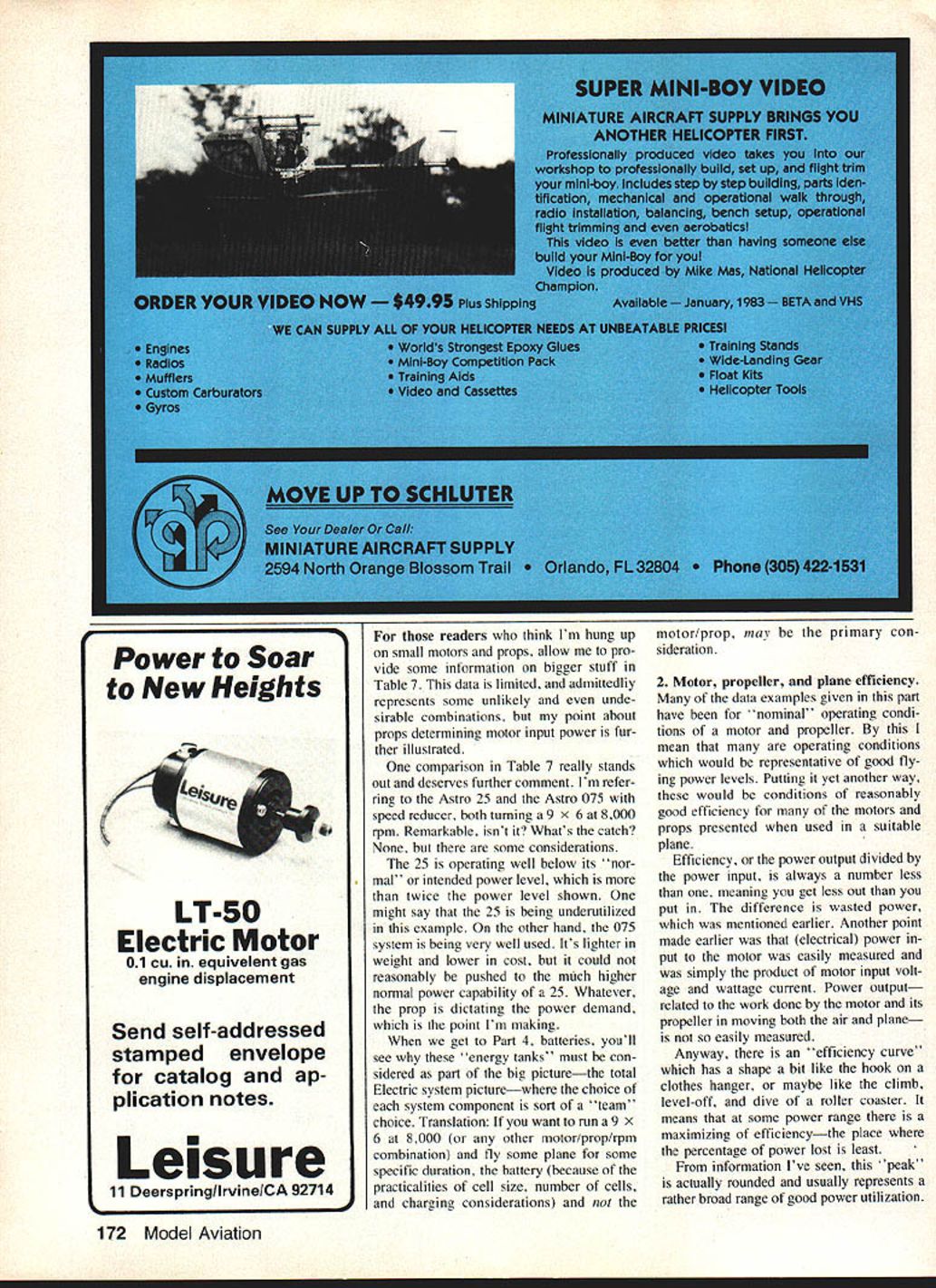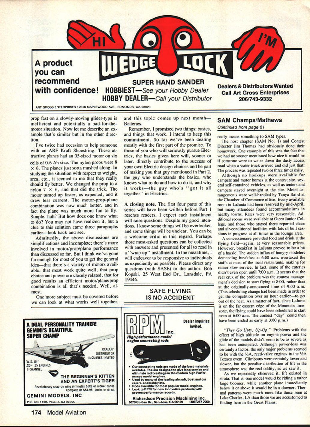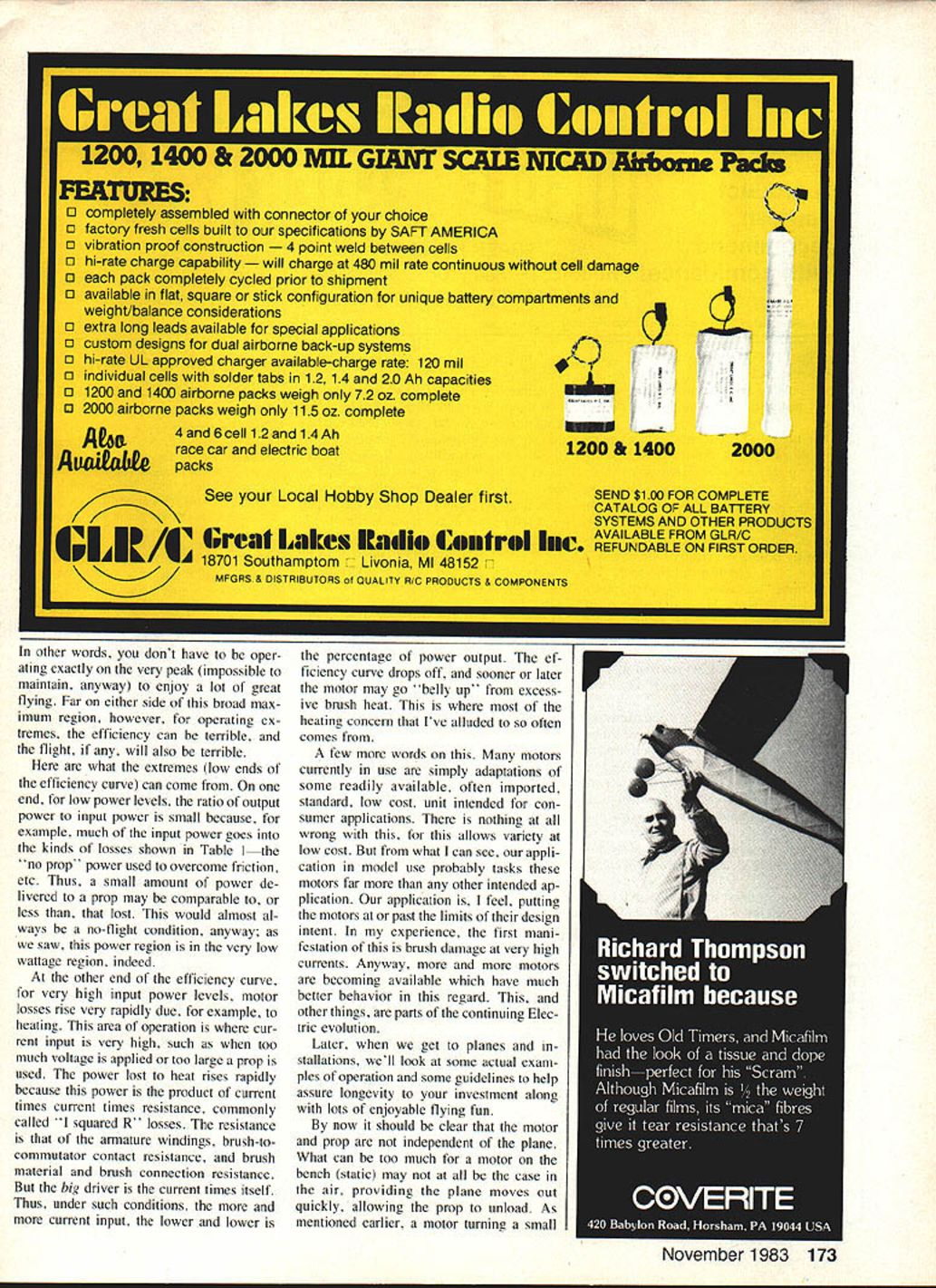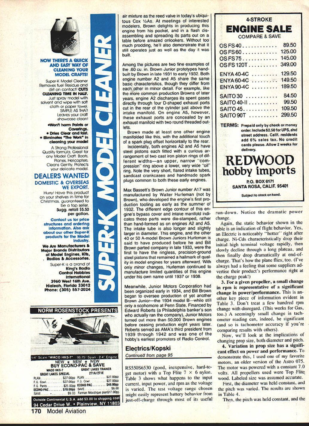 This authors testing setup evaluation motors props results shown tables discussed text power supply fully adjustable zero 30 volts up 20 amperes two digital readouts motor voltage current analog meter tachometer optical pickup remotely located under motor mount Light source also remotely located Photos author THE FIRST INSTALLMENT series September issue described some pros cons electric-powered models last month covered motors use Some basic aspects motors de scribed practical considerations covered Earlier asked have faith read daringly onward remind because realize subject part may appear both simple some strange others However think some up coming information will surprising interesting manyand perhaps little confusing ditficult others first reading still others some what fol lows may downright boring seem totally irrelevant taken alone section however combined ether parts series will provide very intimate overall feel exactly what \Ki O iOE ra popellor rave electricpowered models yoi re new Electrics authors test results may astound second reading may required fully grasp some points thai made that1s what takes suggest Part 3 November 1983 93 goes motor battery pro peller given planeand affect flight results get other words series continues will come together' encourage un daunted continuance series Im sure will find worthwhile presentation seems too slow 80 70 60 -50 40 -8 tedious remern ber introduction Electricson installment plan Its necessarily easy installment plan either read write Hox ever maintain subject can generally simple oc t V 0 0 0 ----V e Lu 0 0 0 0 0 -I C V e 0 V C 0 0 RPM X 1000 91011 SC V0 certainly successful though neces sadly short Perhaps some readers have disap pointments Electrics just because some details made light glossed over elsewhere Thats Model Avi ation has planned seriesto make sure adequate introductory treatment such anyone wants can very successful Electric flier theres some useful stuff Gas guys honest well-intended series cannot complete detail-perfect several reasons dont know everything Another Im trying se lect meaningful useful offer ings consistent limitations pub lication space presentation time can fact best can can criticautomaticallyby asking questions 1 Propellers power Now Chave seen some Electric models Part have some introductory insight motors Part 2 could wondering what business concerning power heating performance about Lets look what happens motor required its thingturn prop power plane leading suppliers Electric flight systems provide instructions regarding choice model size weight suit able propellers things will also addressed another part series meantime get good feel motor operation propellers power lets look things static environment ie bench rather flight experience excellent correlation tween what observe bench what experience air A Power inputno prop Electrical power product electric potential volts electric current amps case motor input power motor terminal voltage times motor terminal input current amperage product V x power watts power comes frm energy 12131415 tank battery tank specific size can deliver its fill Part 4 will cover batteries detail discuss much tanks' can deliver Now however going get feel just Shown motor input power various motor speeds rpm 11 samples nine different motor types swinging Cox 6-4 gray prop Note different symbol 11 motors Connect like symbols form smooth performance curves through various speeds Note generally tight clusters data points throughout range test 94 Model Aviation Table 1 Typical Motor Power InputNo Prop MotorVoltsAmpsWatts Astro 0560075450 p/n 210770078546 80081648 90084756 Leisure LT-5050119595 Pattern Wind60124744 7013091 Mabuchi5011859 RS540S65276013078 70146102 80153122 Table 2 Performance Variation Various Same Size Props Propeller 64AmpsWatts Top Flite Nylon1168113300 Top Flite Wood13393112700 Cox Gray155*10912200 Table 3 Typical Motor/Propeller Performance Voltage Variation VoltsAmpsWattsRPM 60795488000 65905598550 70100709050 75110839600 801219710000 8513011110500 133 120 110 100 90 much fuel used motors next month youll have appreciation Part 4 As mentioned earlier motor running no prop draws small amount current sufficient overcome losses due friction other things illustrate sev eral examples shown Table measurements made using test setup pictured Notice something particular about data Table example motor current increase large crease voltage caused will case prop measurements tests made using convenient adjustable power supply exactly same re sults would occur motor bat tery interested power supply pictured capable up 30 volts 20 amps has remote voltage sense assure correct voltage motor terminals Also has adjustable current limit dont have accident during some zealous data run power capa bility may sound impressive believe expect need capability near future point want make special note has experience Ive told same Electric flight system suppliers performance production flight motors varies about plus-or-minus 10% As youll also see props also vary greatly load present motor battery course measurement motor performance has instrumentation accuracy associated Thus rea sons apparent differences Electric flight experience can occur Em noting now just case anyone reading has has read about different results B Power inputwith props ifl tables various motor performance mea surements different props ahown Whats mportant absoLve ac curacy relative performances -i particuiar notice bow rapidly input power changes tbattery voltage dra matic eFfect piop size can hae youll see important use right prop temptation just stick bigger prop add another cell may have carefully con sidered What seems like small change may fact either present unbearable load motor lest cause decline power system efficiency Remember static demonstrations motor/prop moving forward actual flying condi tions aircraft speed etc can have signifi cant influence data 1 All propellers same size necessarily c