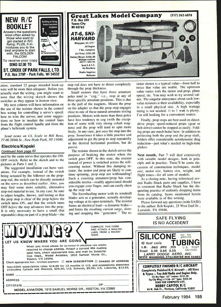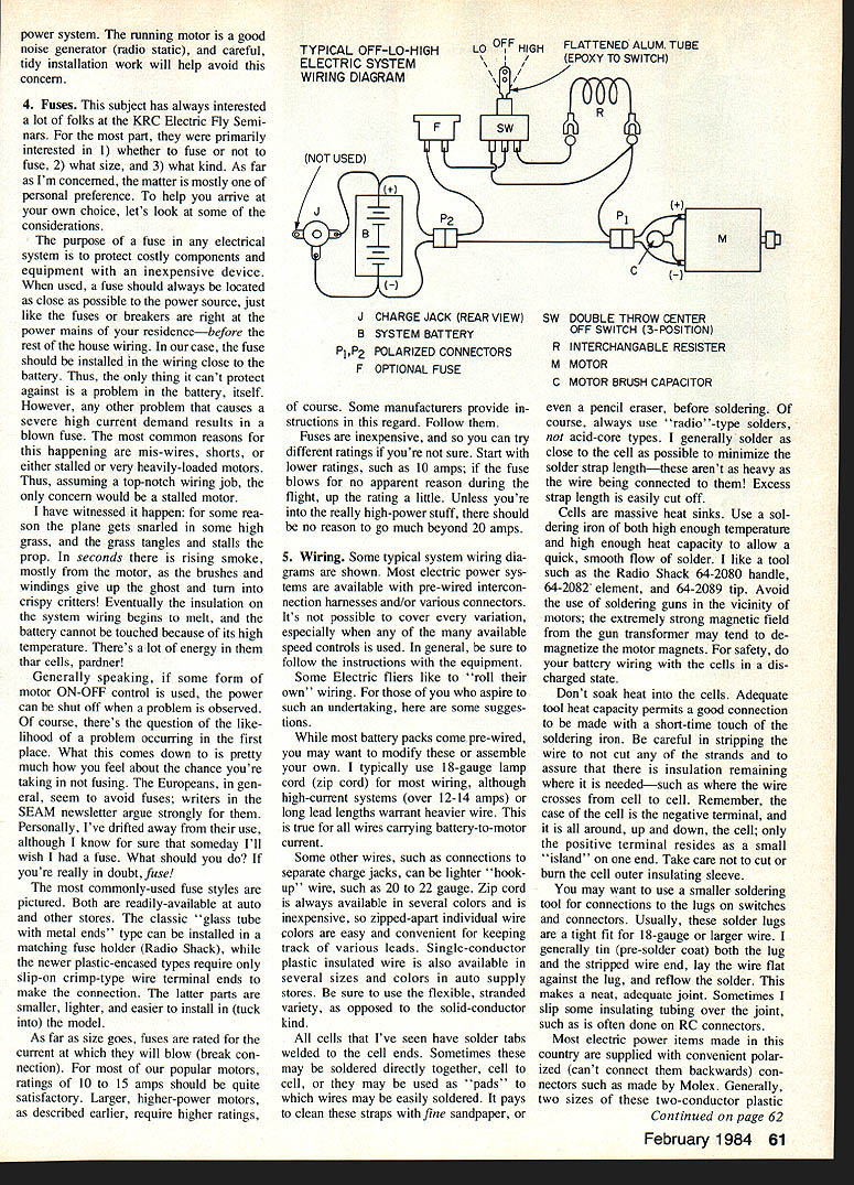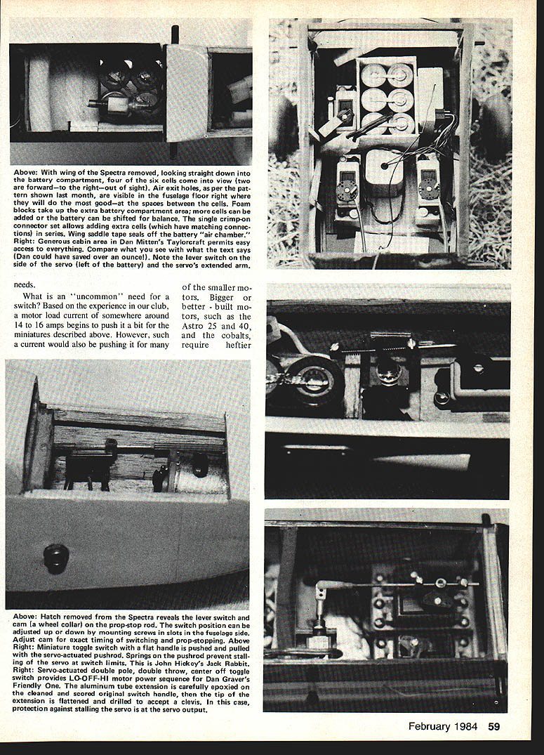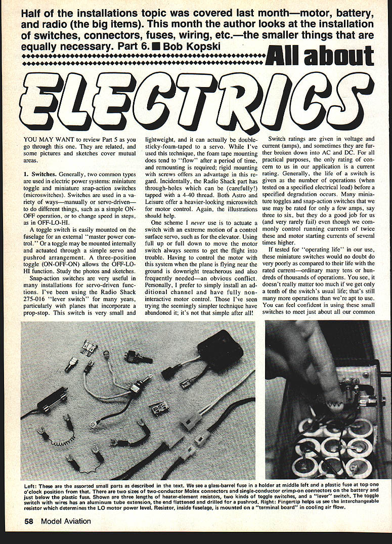 Half installations topic covered last monthmotor battery radio big items month author looks installation switches connectors fuses wiring etcthe smaller things equally necessary Part 6E Bob Kopski ut - w w YOU MAY WANT review Part 5 go through related some pictures sketches cover mutual areas 1 Switches Generally two common types used electric power systems miniature toggle miniature snap-action switches microswitches Switches used va riety waysmanually servo-driven different things such simple ON OFF operation change speed steps OFF-LO-HI toggle switch easily mounted fuselage external master power con trol toggle may mounted internally actuated through simple servo pushrod arrangement three-position toggle ON-OFF-ON allows OFF-LO HI function Study photos sketches Snap-action switches very useful installations servo-driven func tions Ive using Radio Shack 275-016 lever switch years particularly planes incorporate prop-stop switch very small lightweight can actually doublesticky-foam-taped servo Ive used technique foam tape mounting does tend flow after period time remounting required rigid mounting screws offers advantage re gard Incidentally Radio Shack part has through-holes can carefully tapped 4-40 thread Both Astro Leisure offer heavier-looking microswitch motor control Again illustrations should help scheme never use actuate switch extreme motion control surface servo such elevator Using full up full down move motor switch always seems get flight trouble Having control motor system plane flying near ground downright treacherous also frequently neededan obvious conflict Personally prefer simply install ad ditional channel have fully noninteractive motor control Ive seen trying seemingly simpler technique have abandoned its simple after Switch ratings given voltage current amps sometimes fur ther broken down AC DC practical purposes rating con cern us application current rating Generally life switch given number operations tested specified electrical load before specified degradation occurs minia ture toggles snap-action switches use may rated few amps say three six good job us very rarely fail though com monly control running currents twice motor starting currents several times higher tested operating life use miniature switches would no doubt very poorly compared life rated currentordinary tens hun dreds thousands operations see doesnt really matter too much get tenth switchs usual life thats still operations apt use can feel confident using small switches meet just about common Left assorted small parts described text see glass-barrel fuse holder middle left plastic fuse top oclock position two sizes two-conductor Molex connectors single-conductor crimp-on connectors battery just below plastic fuse Shown three lengths heater-element resistors two kinds toggle switches lever switch toggle switch wires has aluminum tube extension end flattened drilled pushrod Right Fingertip helps us see interchangeable resistor determines LO motor power level Resistor inside fuselage mounted terminal board incooling air flow 58 Model Aviation Above With wing ot Spectra removed looking straight down battery compartment four six cells come view two forwardto rightout sight Air exit holes per pat tern shown last month visible fuselage floor right will goodat spaces between cells Foam blocks take up extra battery compartment area cells can added battery can shifted balance single crimp-on connector set allows adding extra cells have matching connec tions series Wing saddle tape seals off battery air chamber Right Generous cabin area Dan Mittens Taylorcraft permits easy access everything Compare what see what text says Dan could have saved over ounce Note lever switch side servo left battery servos extended arm needs What uncommon need switch Based experience club motor load current somewhere around 14 16 amps begins push bit miniatures described above However such current would also pushing smaller mo tors Bigger better built mo tors such Astro 25 40 cobalts require heftier February 1984 59 Above Hatch removed Spectra reveals lever switch cam wheel collar prop-stop rod switch position can adjusted up down mounting screws slots fuselage side Adjust cam exact timing switching prop-stopping Above Right Miniature toggle switch flat handle pushed pulled servo-actuated pushrod Springs pushrod prevent stall ing servo switch limits John Hickeys Jack Rabbit Right Servo-actuated double pole double throw center off toggle switch provides LO-OFF-HI motor power sequence Dan Gravers Friendly aluminum tube extension carefully epoxied cleaned scored original switch handle tip extension flattened drilled accept clevis case protection against stalling servo servo output CAM OR SERVOARM 0RADIO SHACK 275016 OR SIM NOT USEDNC NO IVJr4Th K9C J B F1 SW] CHARGE JACK REAR VIEW SYSTEM BATTERY POLARIZED CONNECTORS OPTIONAL FUSE OPTIONAL MAIN SWITCH switches Ive successfully used double-pole miniature toggles two switch sections wired parallel control 25 switch rated 5 amps per pole required replacement after about two seasons flying 2 Simple speed controls Motor power can controlled step fashion using servocontrolled three-position toggle switch As shown sketch position toggle puts resistor battery-motor circuit As explained earlier series small drop applied voltage causes substantial power reduction small-value re sistor needed job Such resistor capable carrying motor current may hard find make own simple resistors done using small sections coiled heating element such found older-style electric hot plates able buy replacement nichrome elements hardware store material hard solder use crimp-type terminals resistors As shown microswitch ON lever up option al prop stop retractedI SW2 MICROSWITCH R DAMPING RESISTOR M MOTOR C BRUSH CAPACITOR 001 uF TYPICAL mounted using 4-40 screws blind mount ing nuts plywood former inal board small selection varying length resistors can easily interchanged field achieve desired low-speed per forman